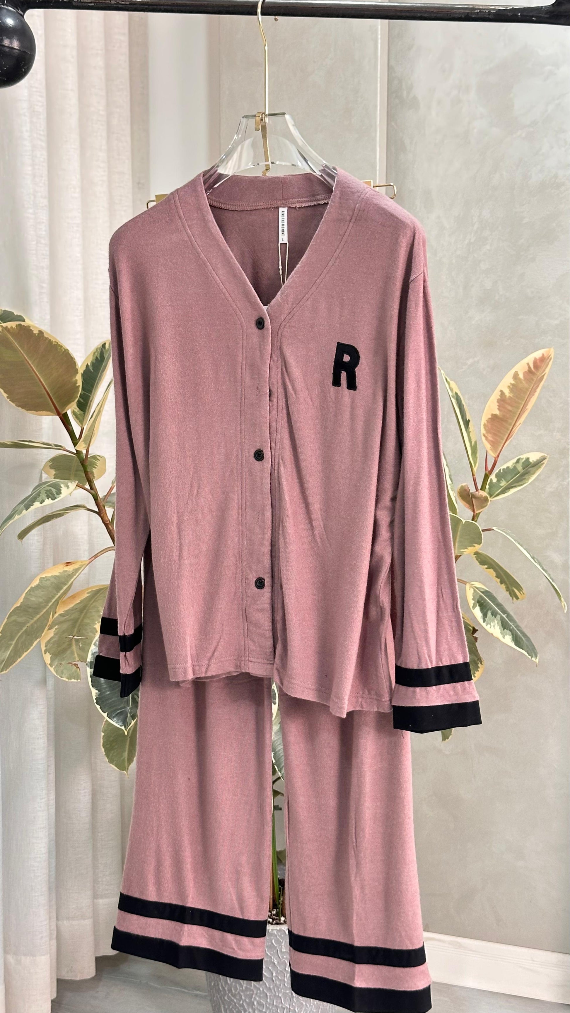 طقم ملابس نوم ناعم ومريح، مصمم لراحة وأناقة لا مثيل لها. يتميز الجزء العلوي بقصّة مريحة مع أزرار أمامية وتطريز جريء لحرف "R" يضفي لمسة شخصية مميزة. يتميز البنطال المطابق بقصّة واسعة وحواف متباينة، مما يمنحك إطلالة عصرية ومريحة، مثالية للاسترخاء في المنزل أو للنزهات غير الرسمية. مصنوع من قماش خفيف الوزن وجيد التهوية يضمن لك راحة طوال اليوم.