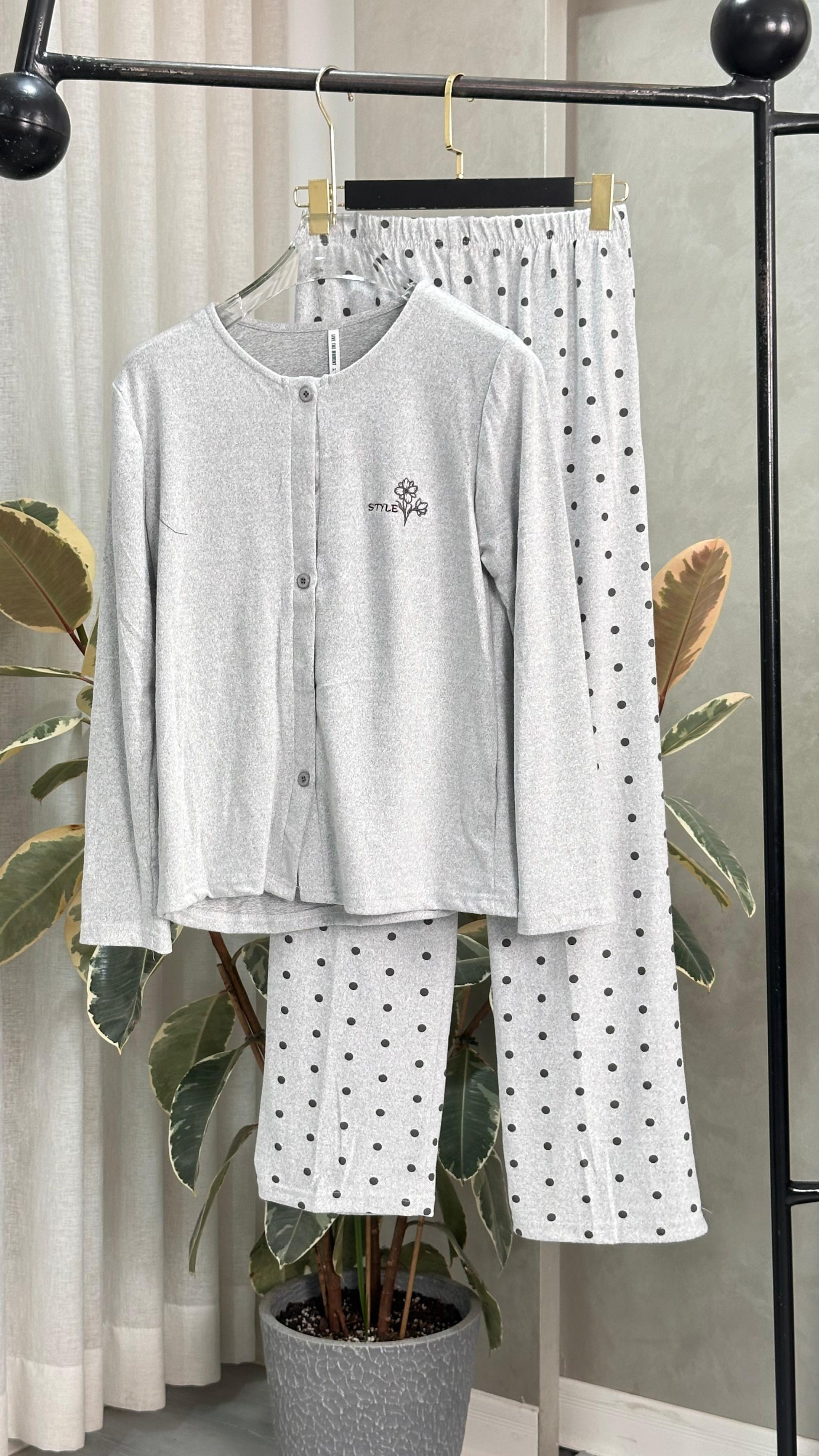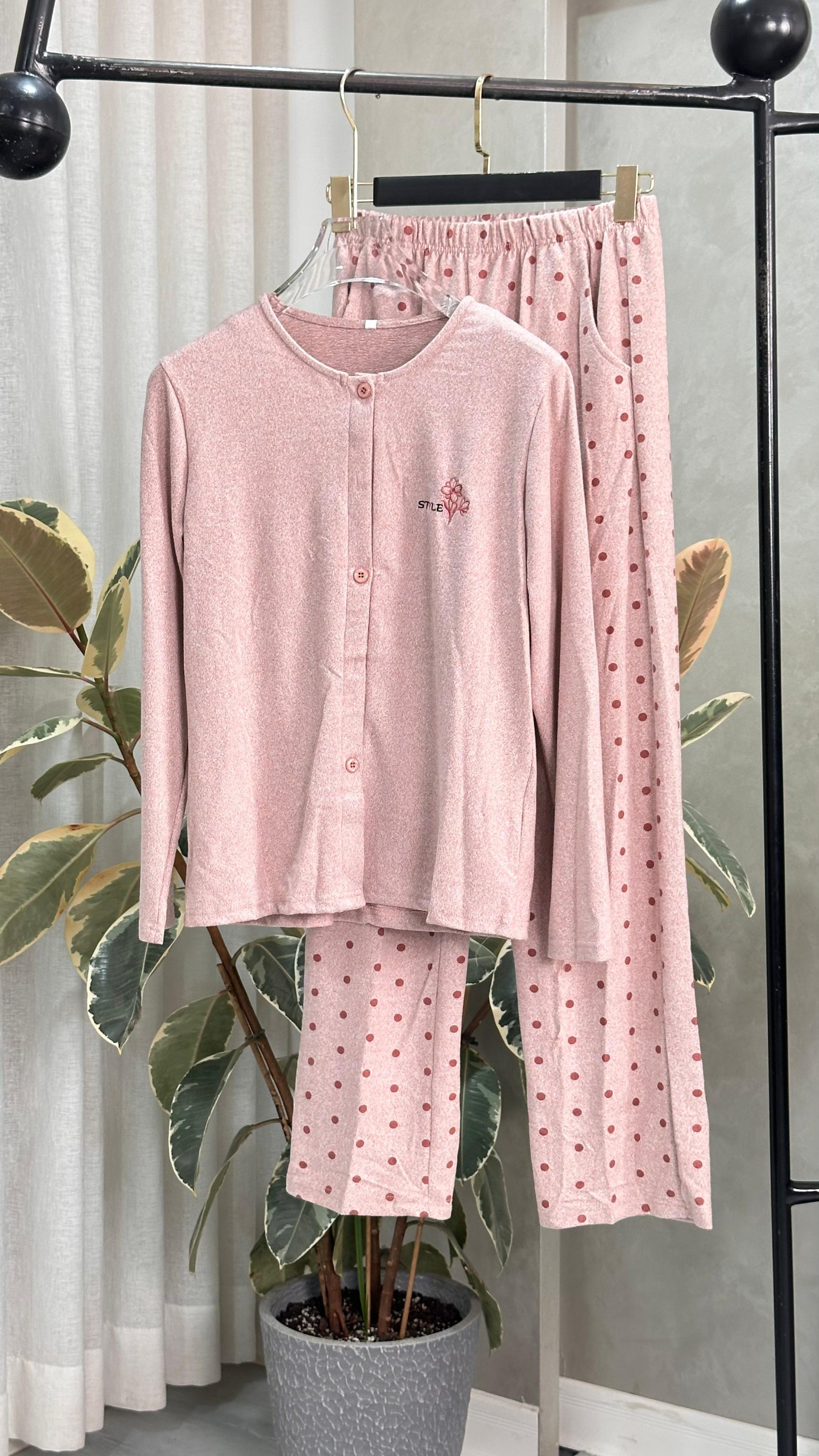 طقم ملابس نوم ناعم وأنيق مصنوع من قماش خفيف الوزن يسمح بمرور الهواء، يضمن أقصى درجات الراحة. يتميز الجزء العلوي بجزء أمامي كلاسيكي بأزرار وقصة مريحة، بينما يأتي البنطال المطابق بحزام خصر مرن لسهولة الارتداء والراحة. مثالي للأمسيات الدافئة أو الصباحات الهادئة، حيث يجمع بين البساطة والنعومة والراحة اليومية.