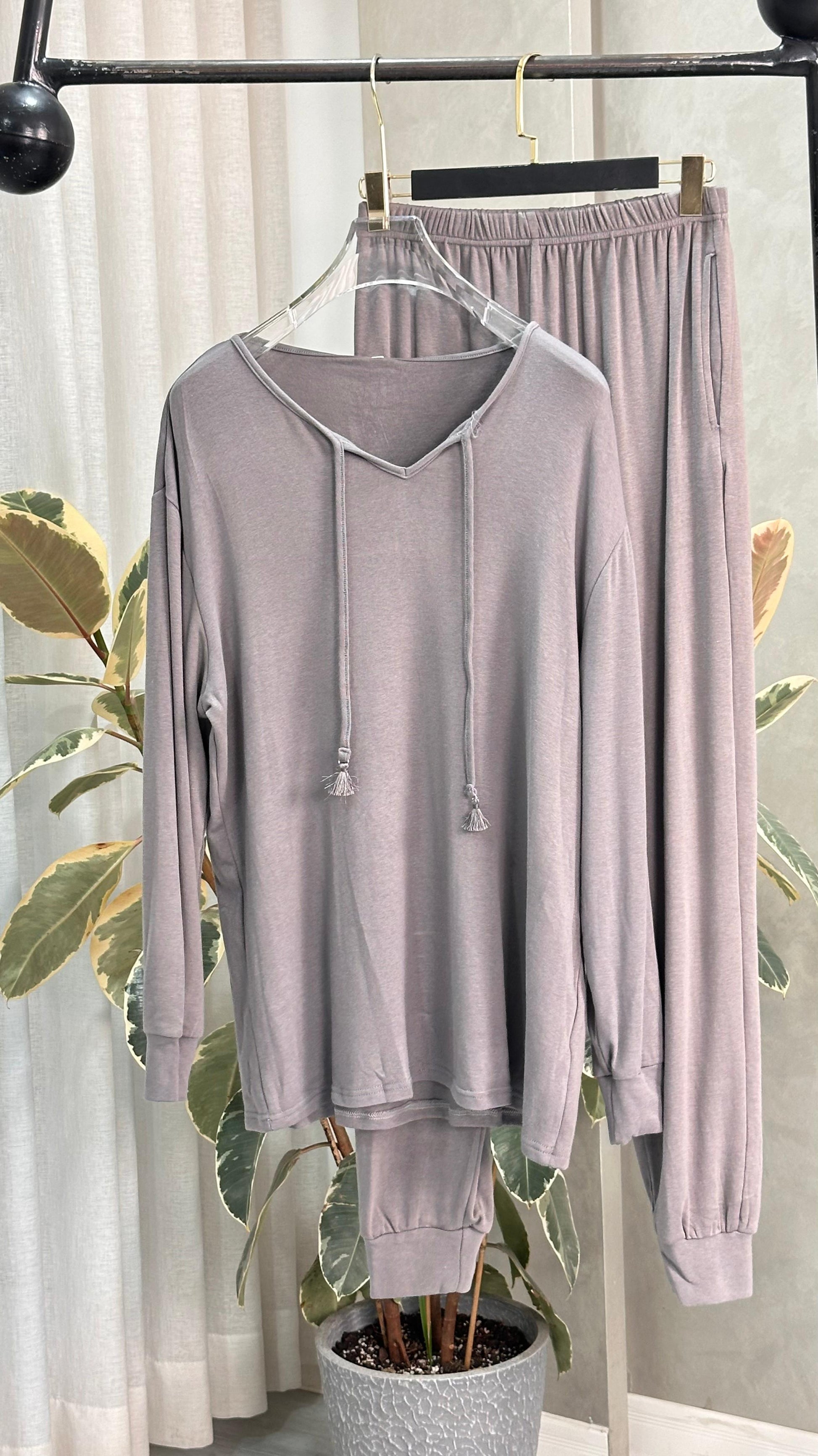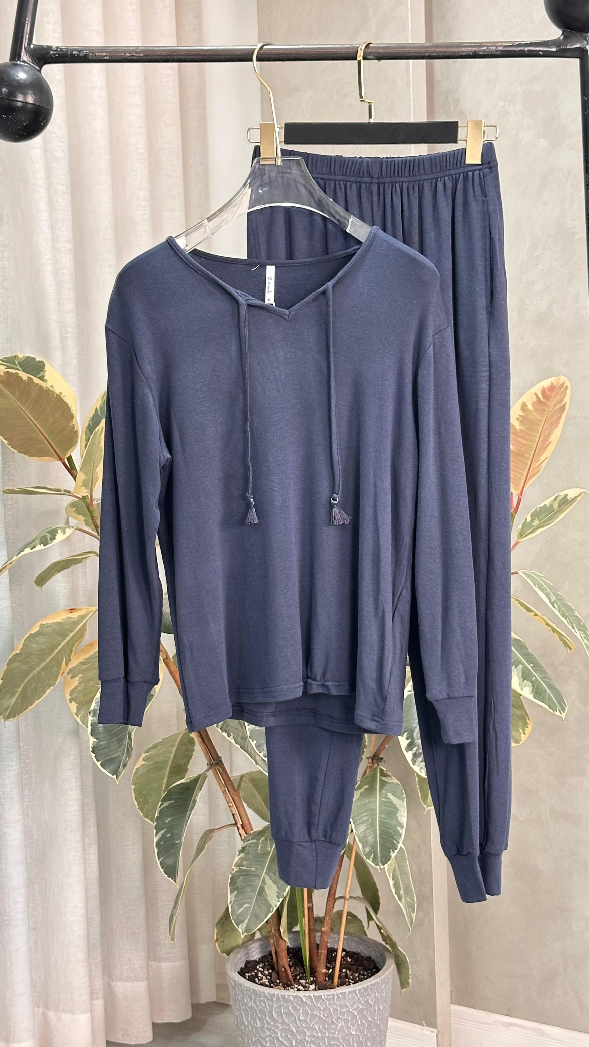 طقم ملابس نوم مريح وعملي، مصنوع من قماش ناعم يسمح بمرور الهواء، يوفر راحة طوال اليوم. يتميز الجزء العلوي بقصّة مريحة مع رباط للرباط، ويمكن تنسيقه مع بنطال مطابق بحزام خصر مطاطي وحواف مطوية لسهولة الحركة. مثالي للاسترخاء في المنزل أو للارتداء الكاجوال، حيث يجمع بين الراحة والبساطة والأناقة اليومية.