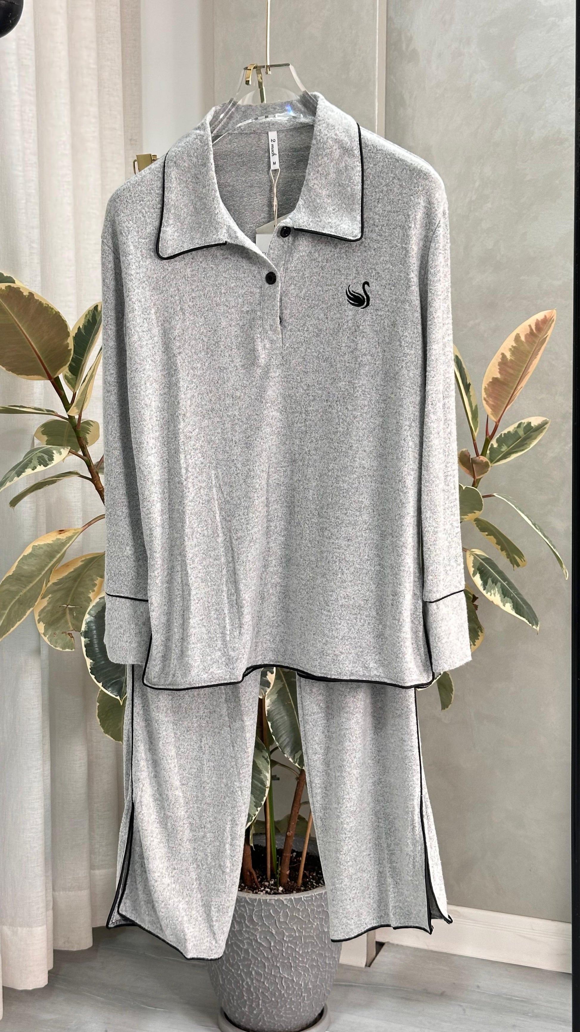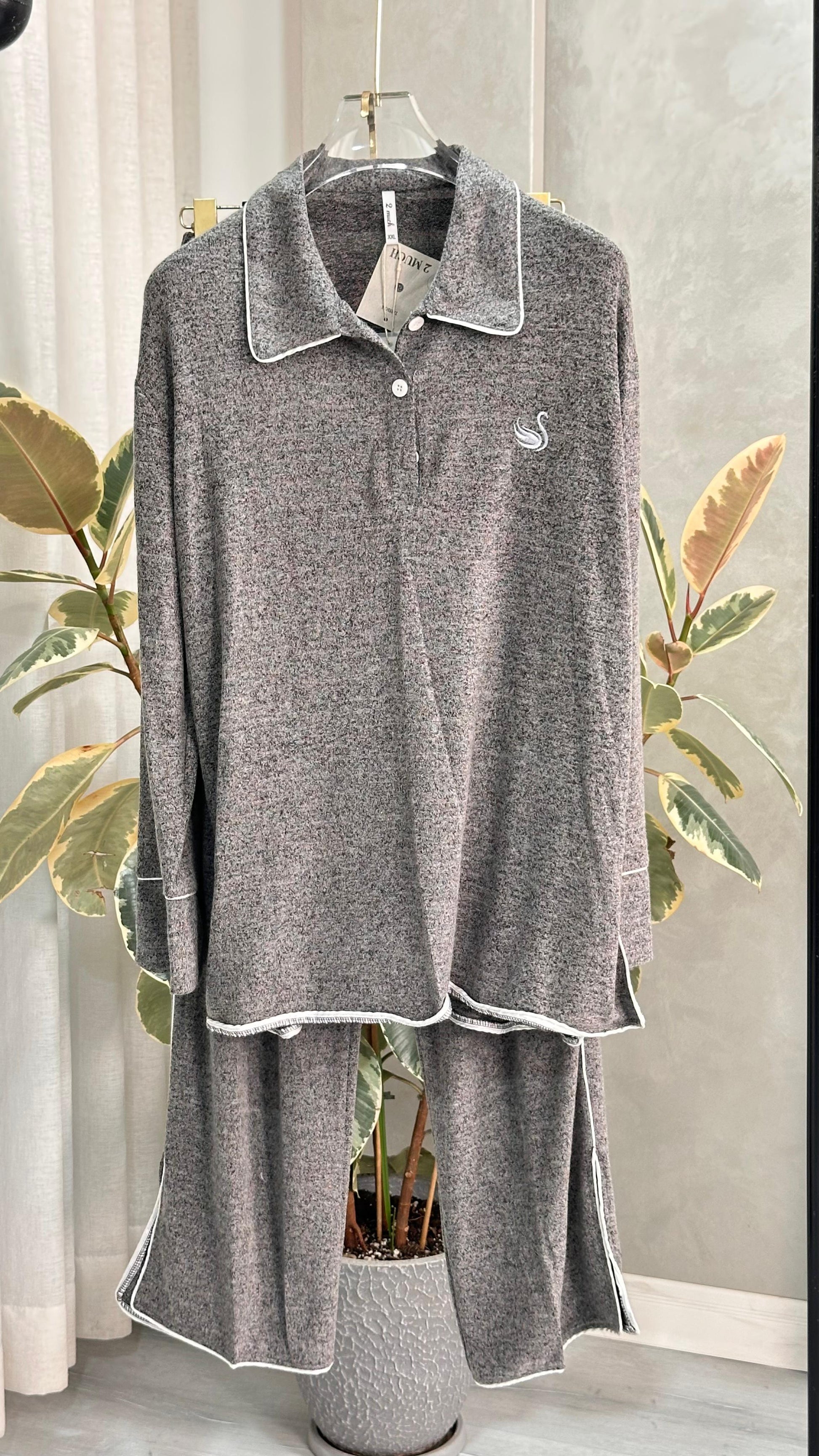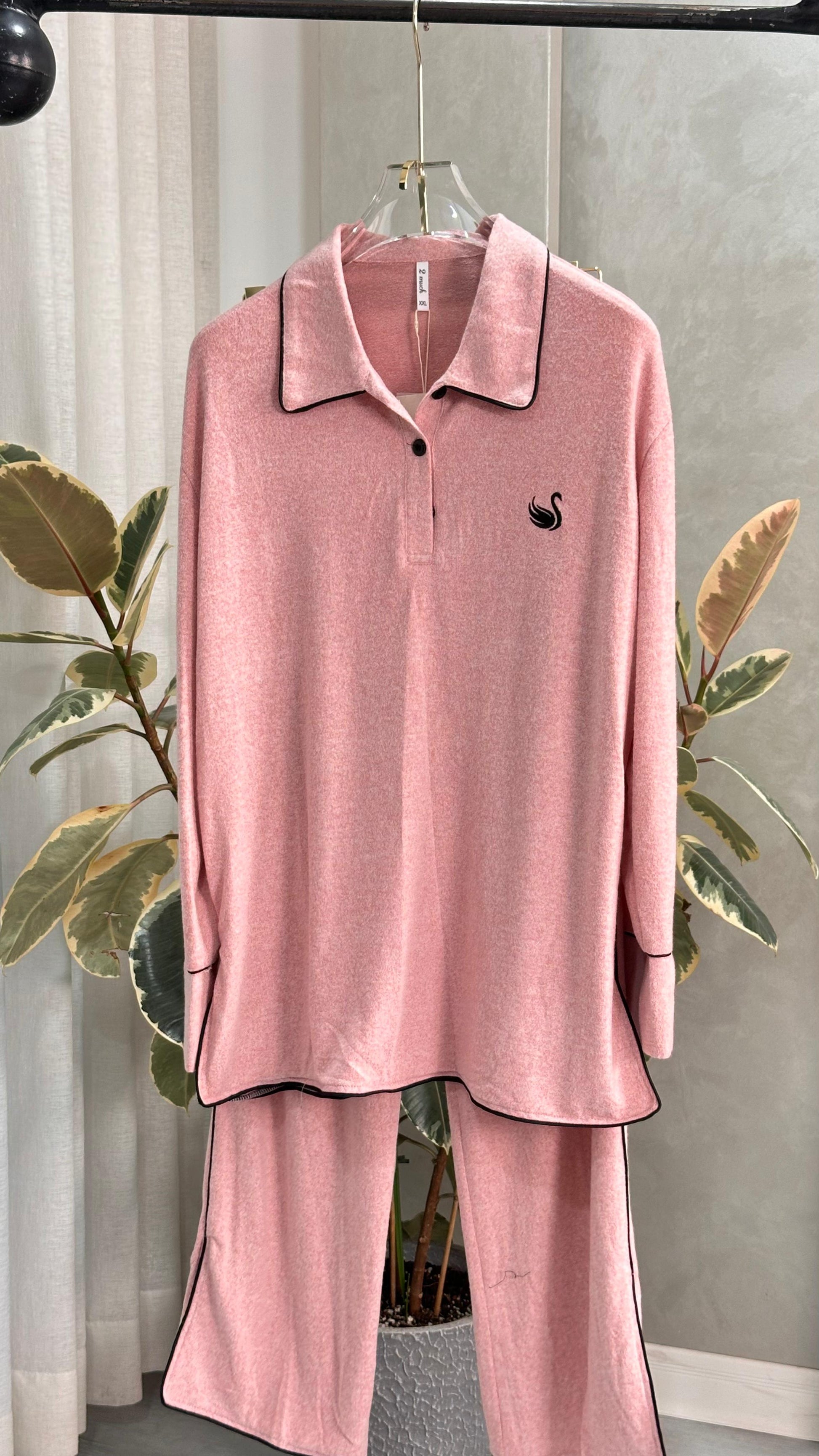 طقم ملابس نوم أنيق ومريح، مصنوع من قماش ناعم يسمح بمرور الهواء لشعور مريح وناعم. يتميز الجزء العلوي بياقة كلاسيكية وأزرار عند الصدر وتصميم مريح لسهولة الحركة، بينما يوفر البنطال المطابق خصرًا مطاطيًا وفتحات جانبية لمزيد من الراحة. مثالي للاسترخاء أو السفر أو الأمسيات الهادئة، يجمع هذا الطقم بين الأناقة العصرية والراحة اليومية.