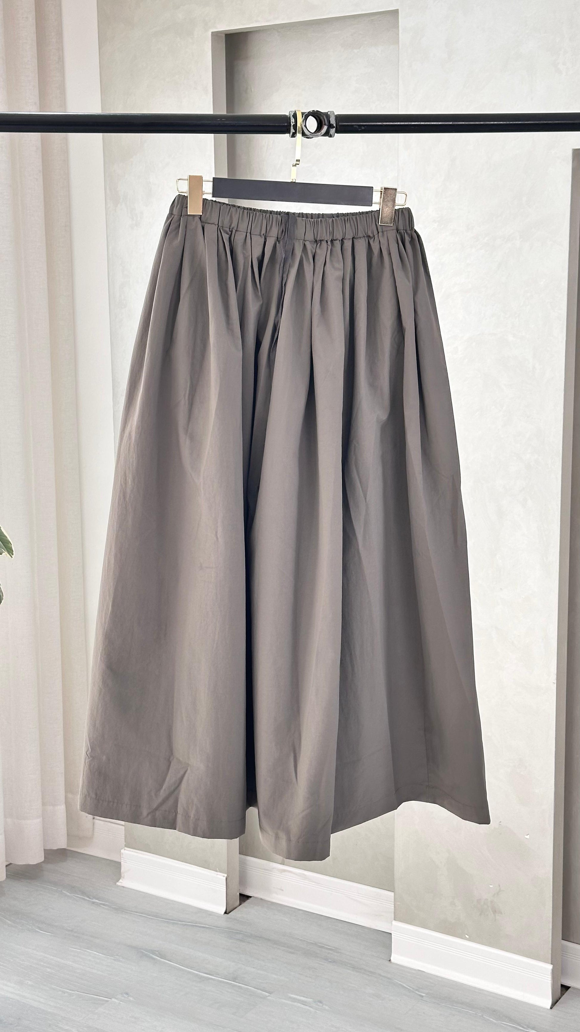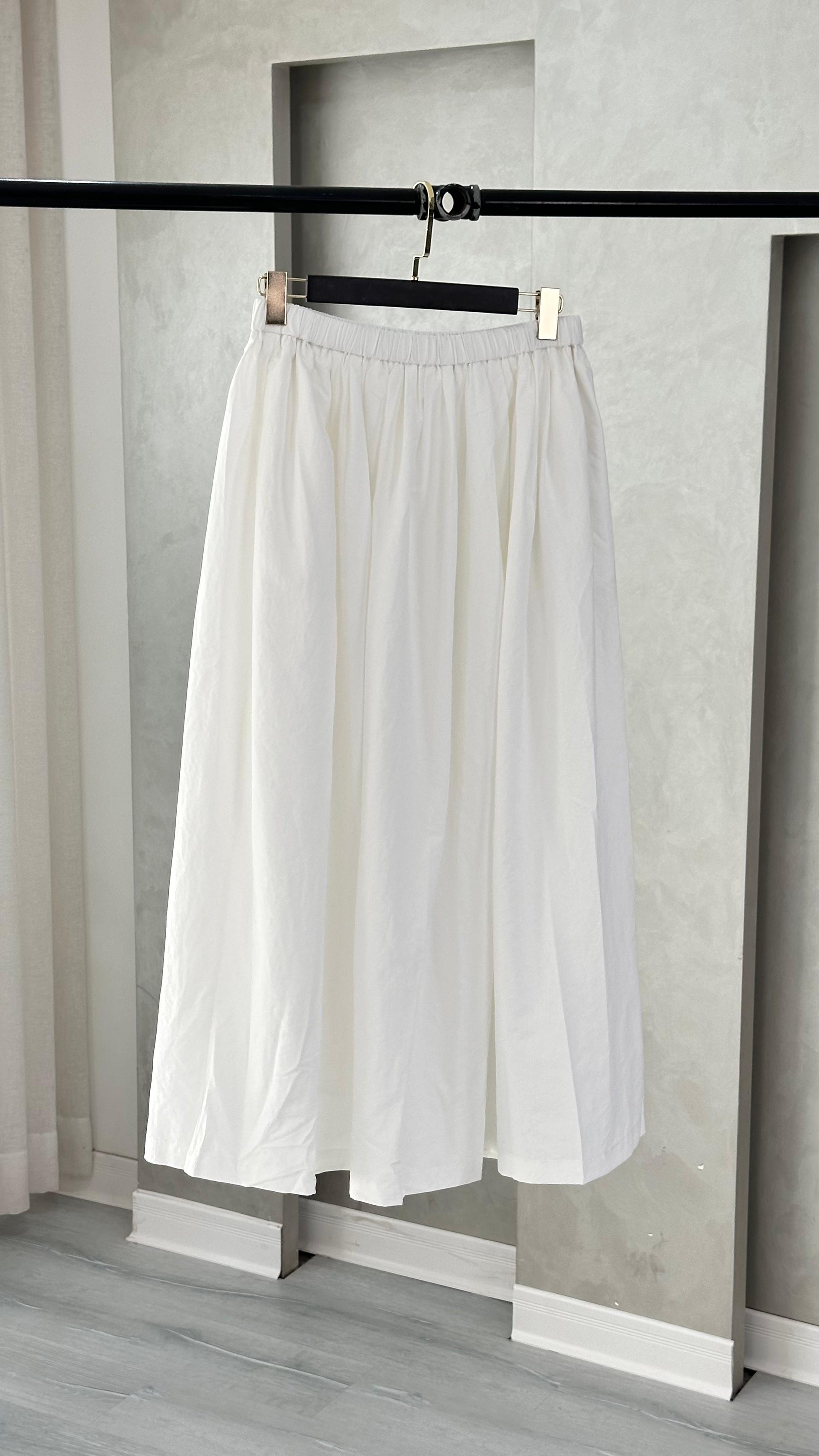**التنورة** ذات قصة واسعة وانسيابية، مصنوعة من قماش خفيف يمنح إحساسًا بالراحة والتهوية. الخصر مزوّد برباط مطاطي مجمّع، مما يوفّر ارتداءً مرنًا ويضفي حجمًا ناعمًا على الجزء العلوي. الحاشية السفلية مستقيمة وبسيطة، دون تفاصيل إضافية، مما يعزز الطابع الهادئ للتصميم ويجعلها قابلة للتنسيق مع قطع متعددة.