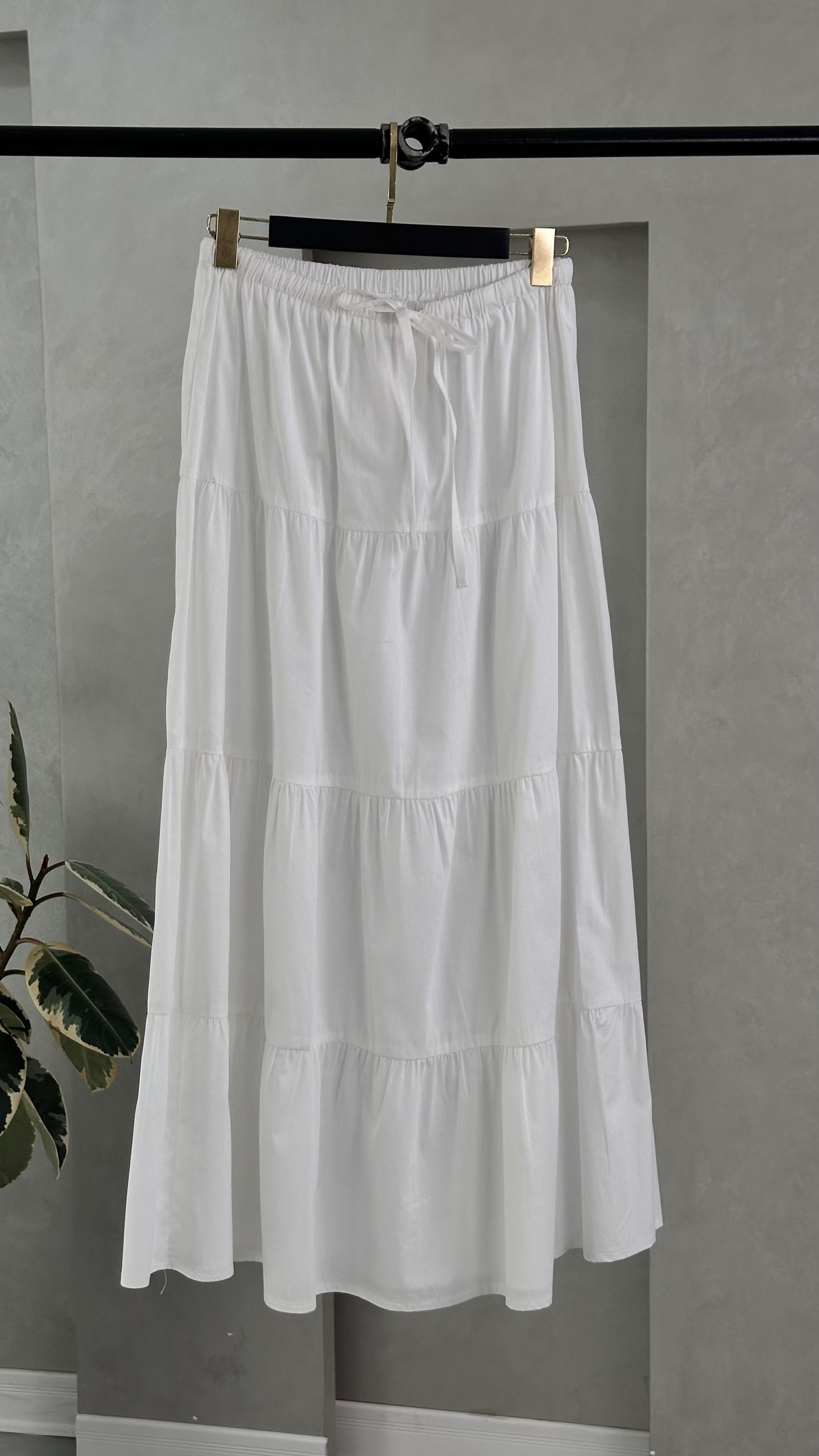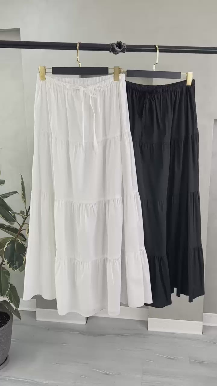 - 👗 **التصميم**: تنورة طويلة بطبقات متعددة، كل طبقة مفصولة بخياطة مجمّعة تعطي شكل متموّج وانسيابي.