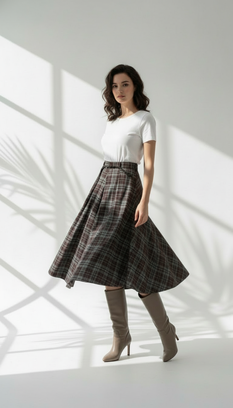 تنورة ميدي منقوشة غير متماثلة تجمع بين سحر كلاسيكي وإطلالة عصرية. مصممة بثنيات انسيابية وحاشية غير متساوية، تضفي لمسة حيوية وأناقة على أي إطلالة. يضفي عليها تصميمها المنسدل وخصره الملفوف لمسةً أنيقة، بينما يضمن القماش الناعم راحةً وسهولةً في الارتداء. مثالية للارتداء مع ملابس محبوكة أو بلوزات مصممة خصيصًا لإطلالة أنيقة ومريحة.