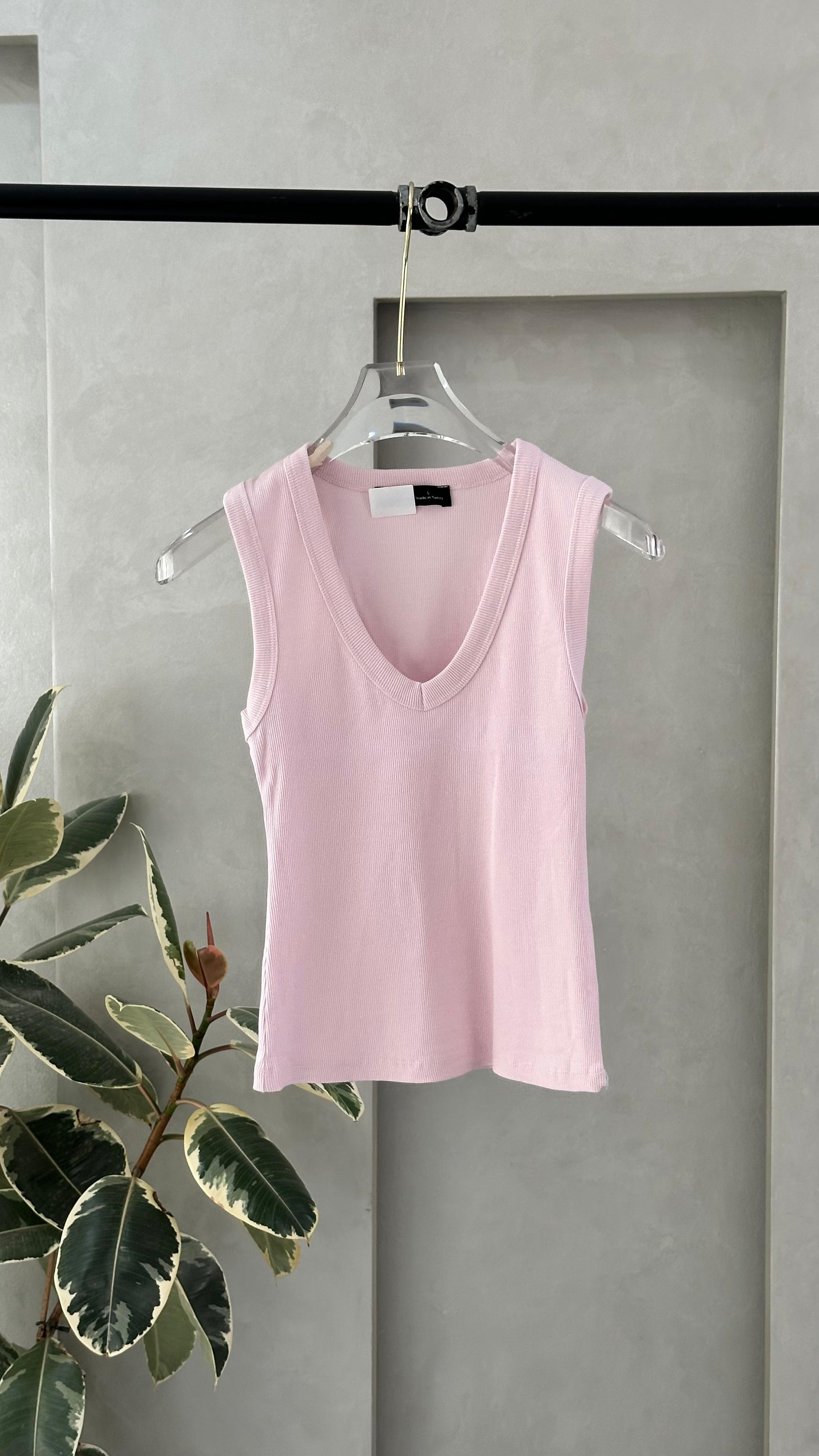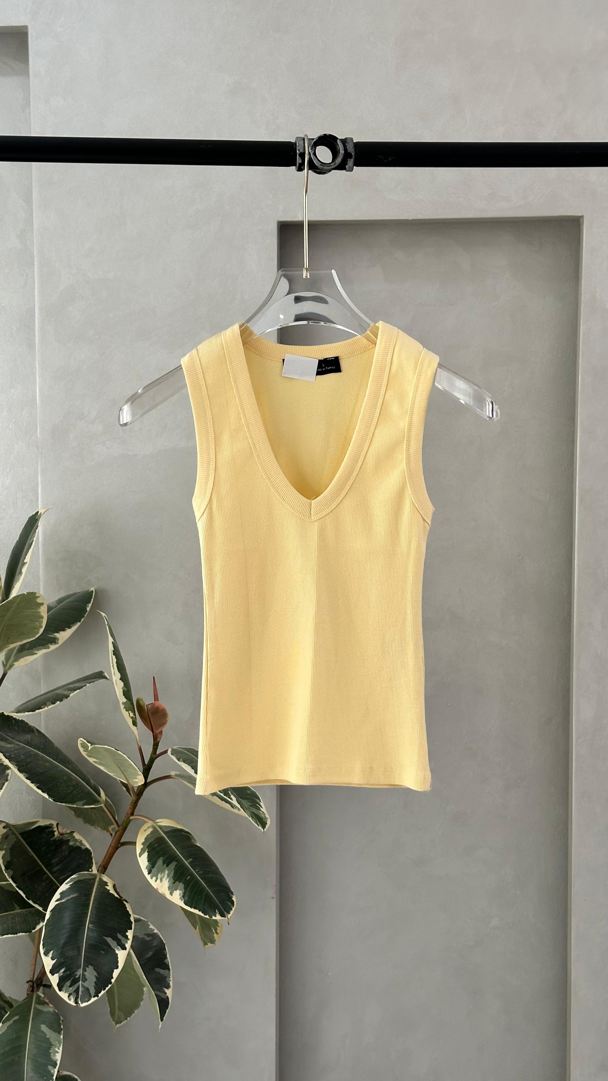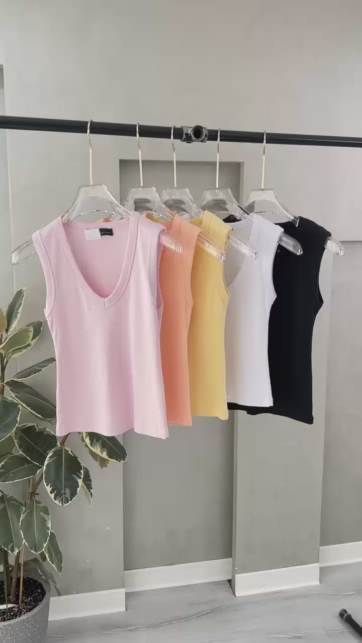 هي كنزة بدون أكمام، بقَصّة رقبة على شكل حرف V، مصنوعة من قماش خفيف ومريحة للارتداء اليومي.