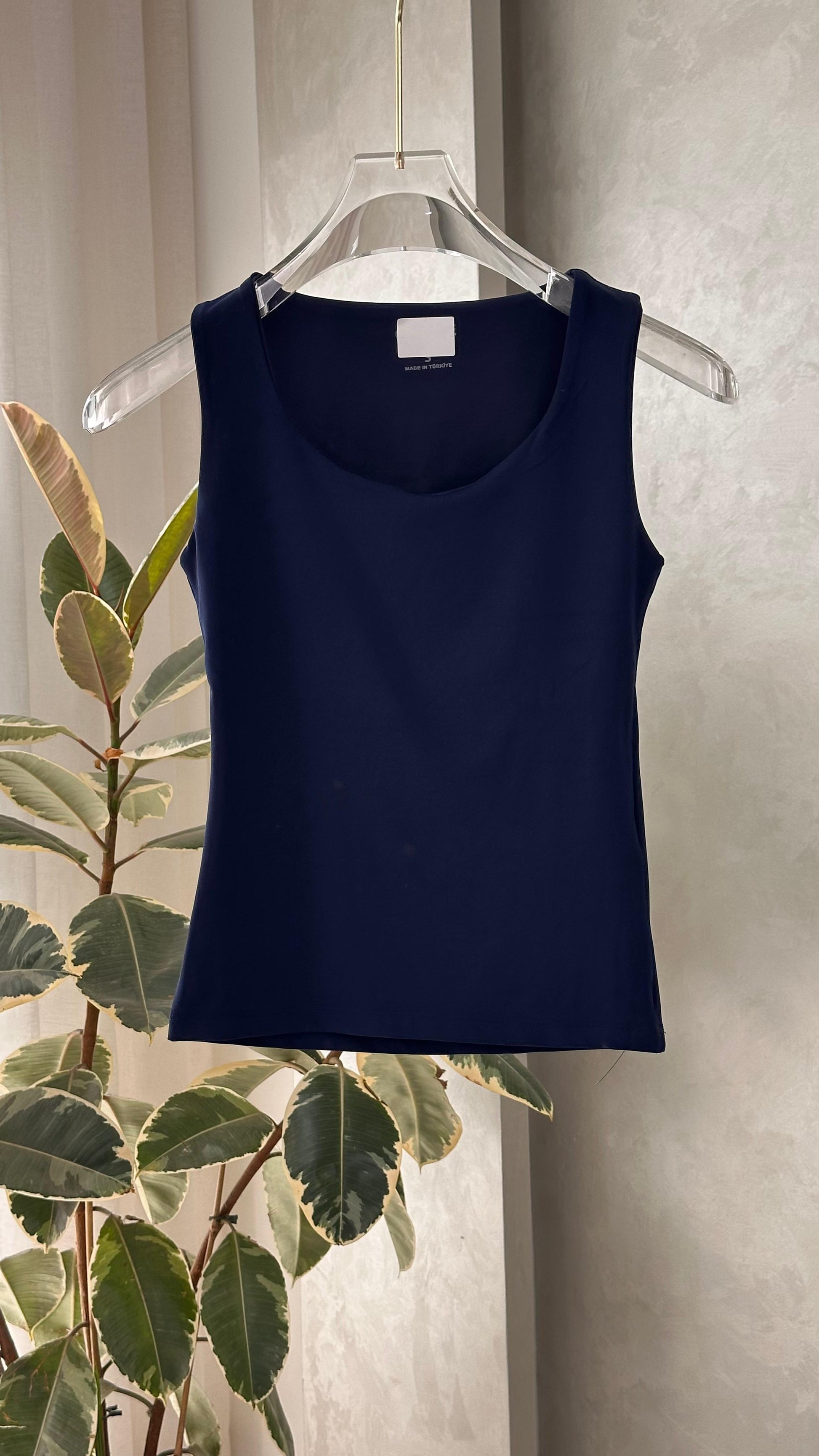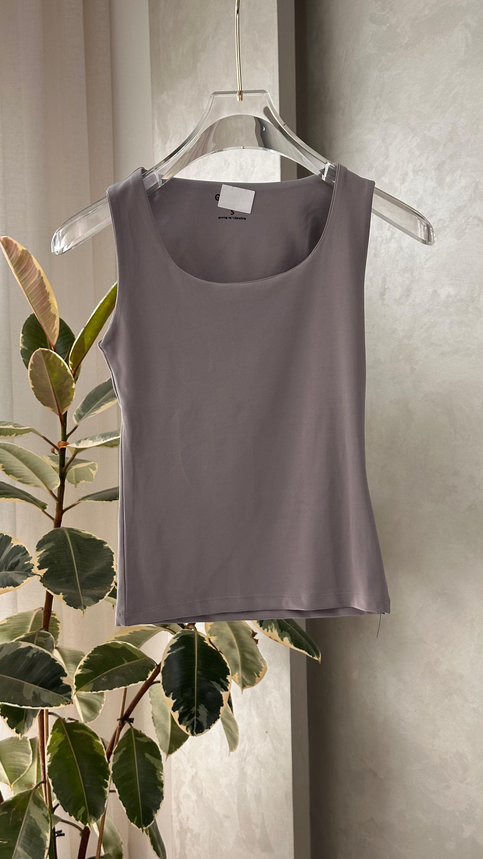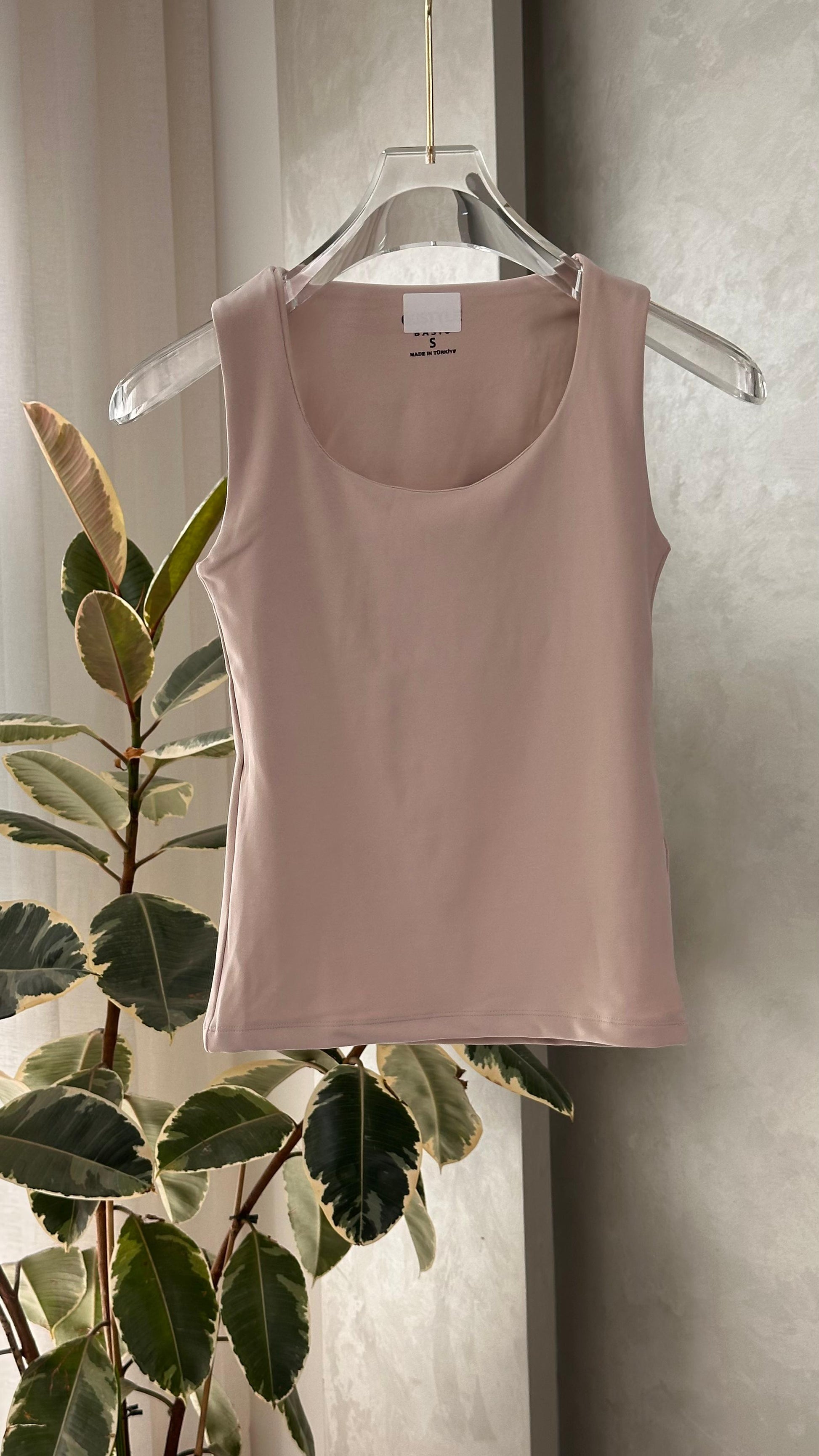 بلاوزة بدون أكمام بتصميم بسيط وأنيق، تتميز بقصّة مستقيمة تلتصق بخفة بالجسم دون مبالغة. تأتي بياقة مستديرة ناعمة تمنح مظهرًا كلاسيكيًا ومريحًا. القماش يبدو ناعمًا ومطاطيًا قليلًا، مما يجعل القطعة مناسبة للارتداء اليومي أو كطبقة أساسية تحت جاكيت أو كارديغان.