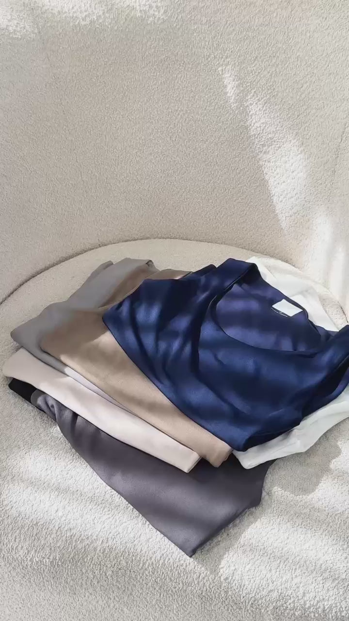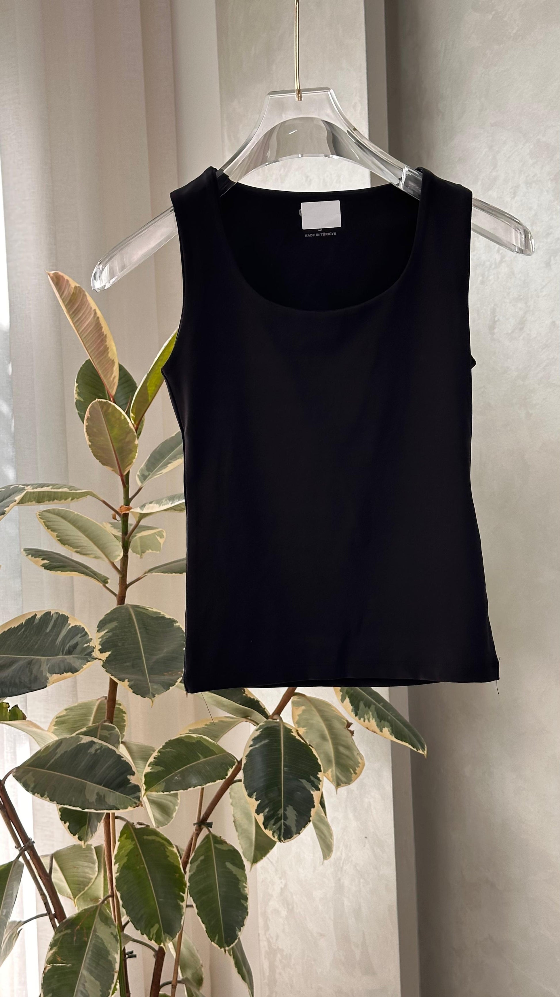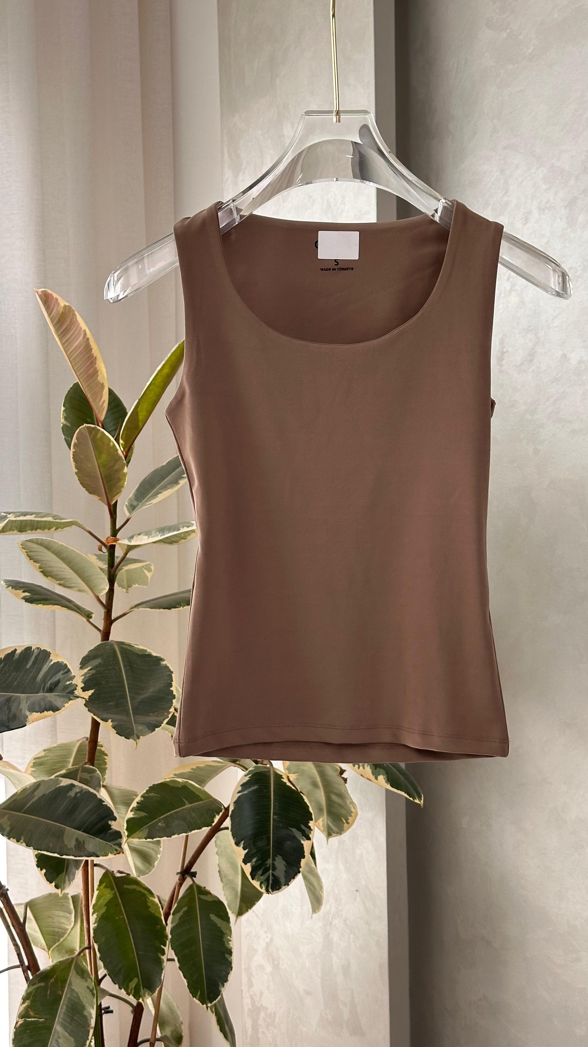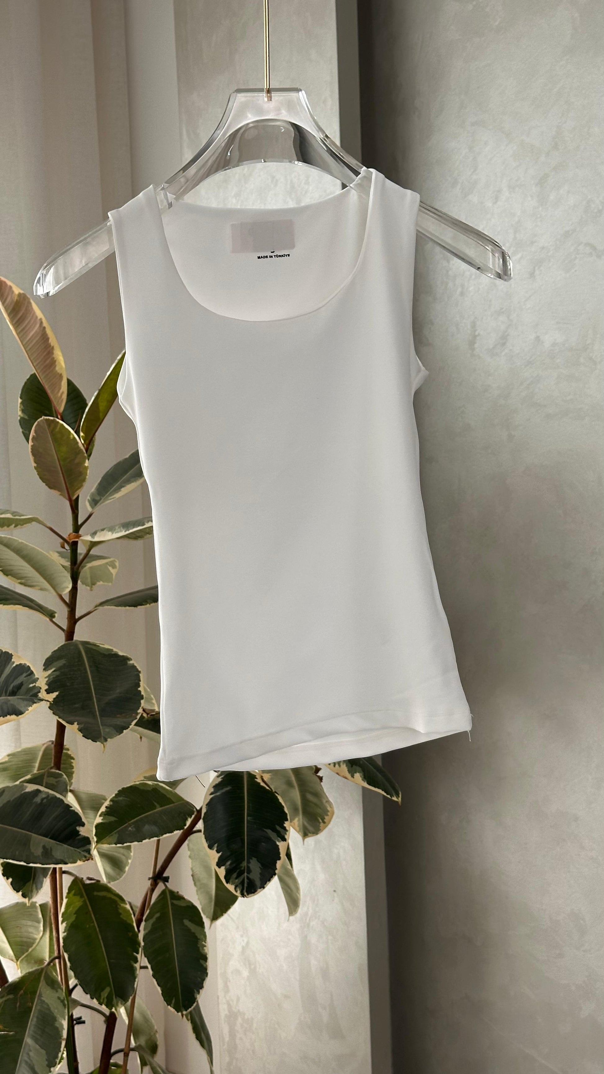 بلاوزة بدون أكمام بتصميم بسيط وأنيق، تتميز بقصّة مستقيمة تلتصق بخفة بالجسم دون مبالغة. تأتي بياقة مستديرة ناعمة تمنح مظهرًا كلاسيكيًا ومريحًا. القماش يبدو ناعمًا ومطاطيًا قليلًا، مما يجعل القطعة مناسبة للارتداء اليومي أو كطبقة أساسية تحت جاكيت أو كارديغان.