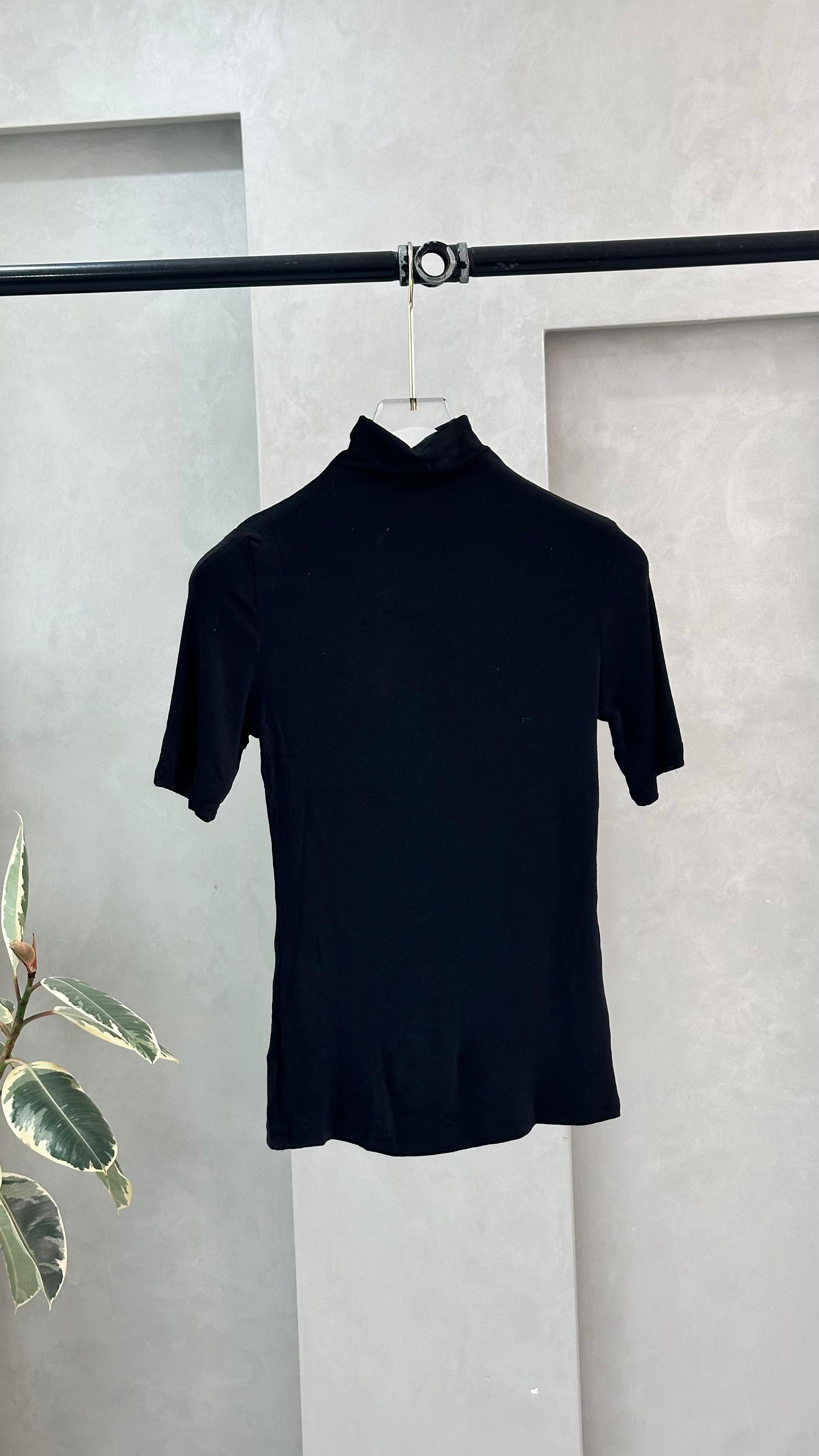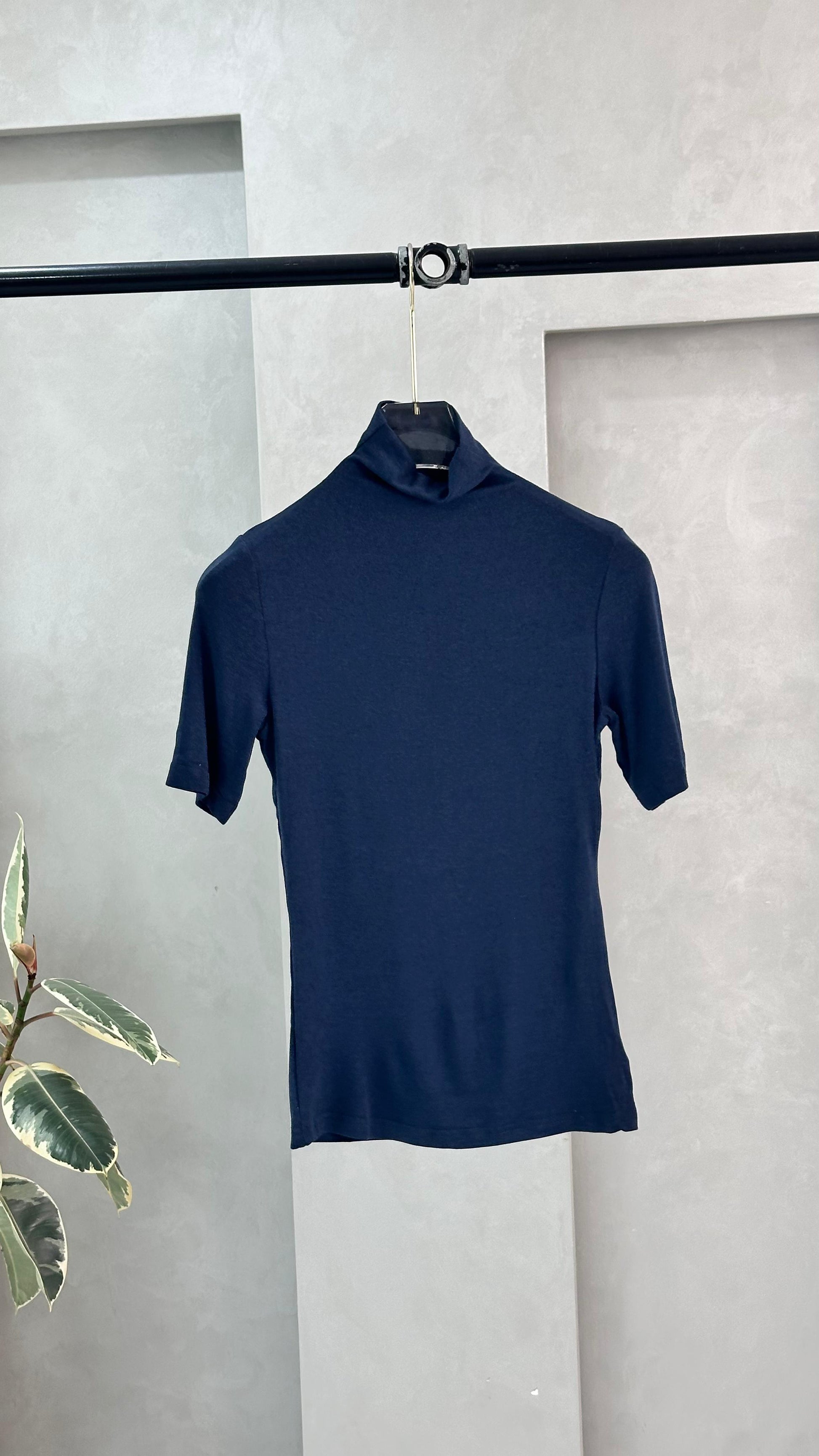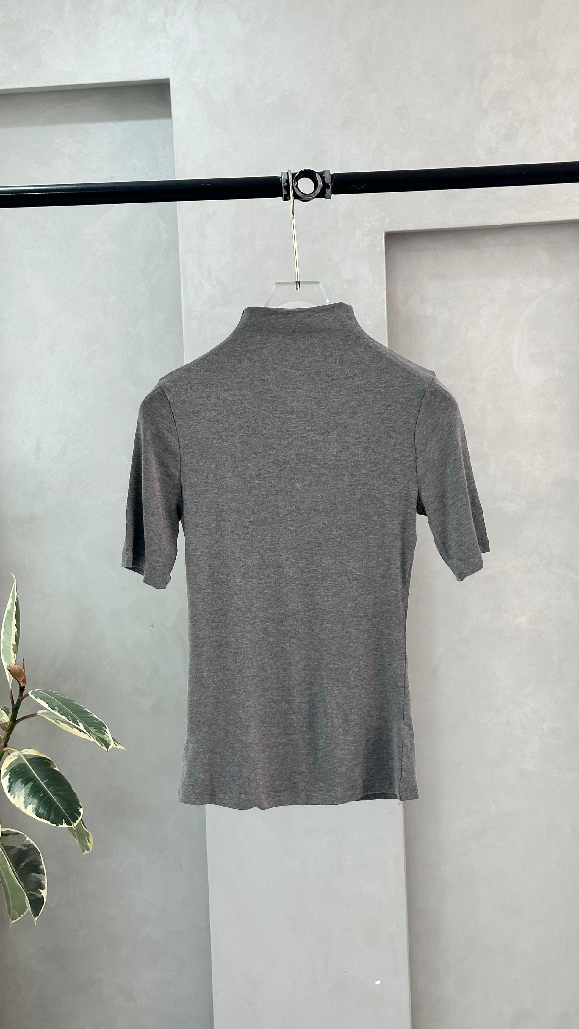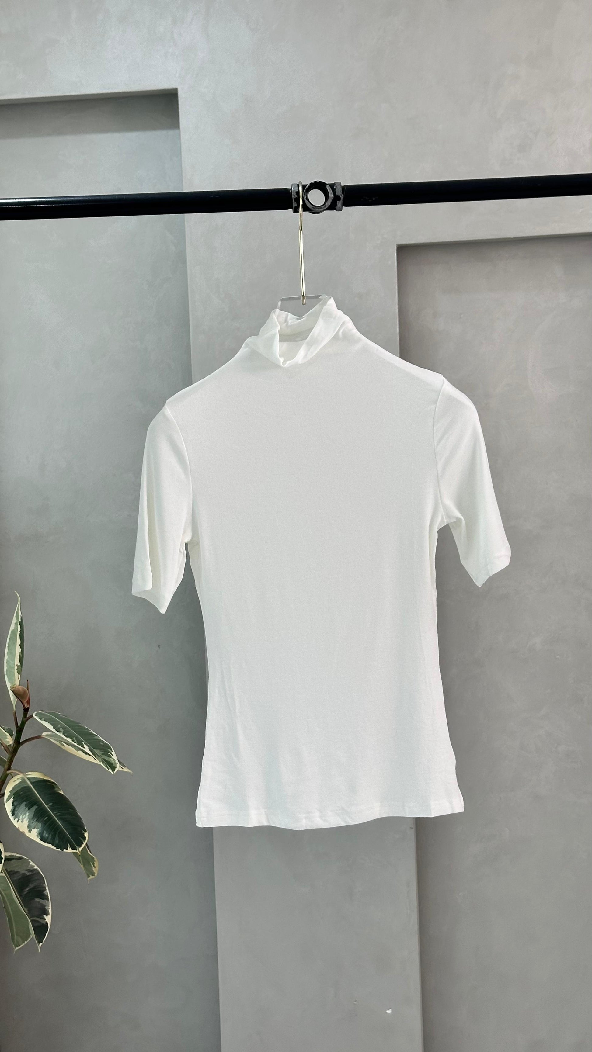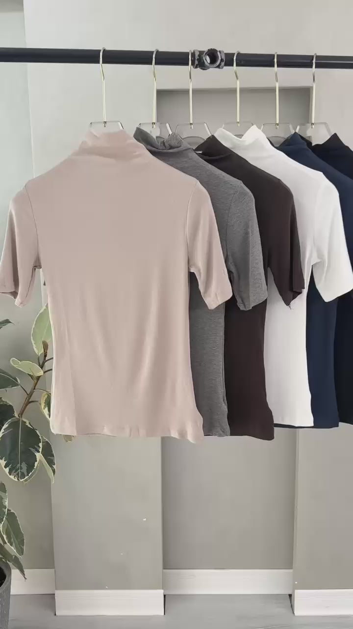 - **التصميم**: قميص بأكمام قصيرة وياقة مرتفعة (تُعرف بالياقة العالية أو الهاف تيرتل).