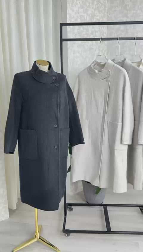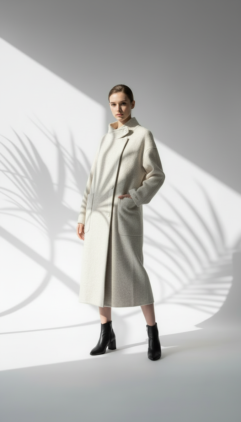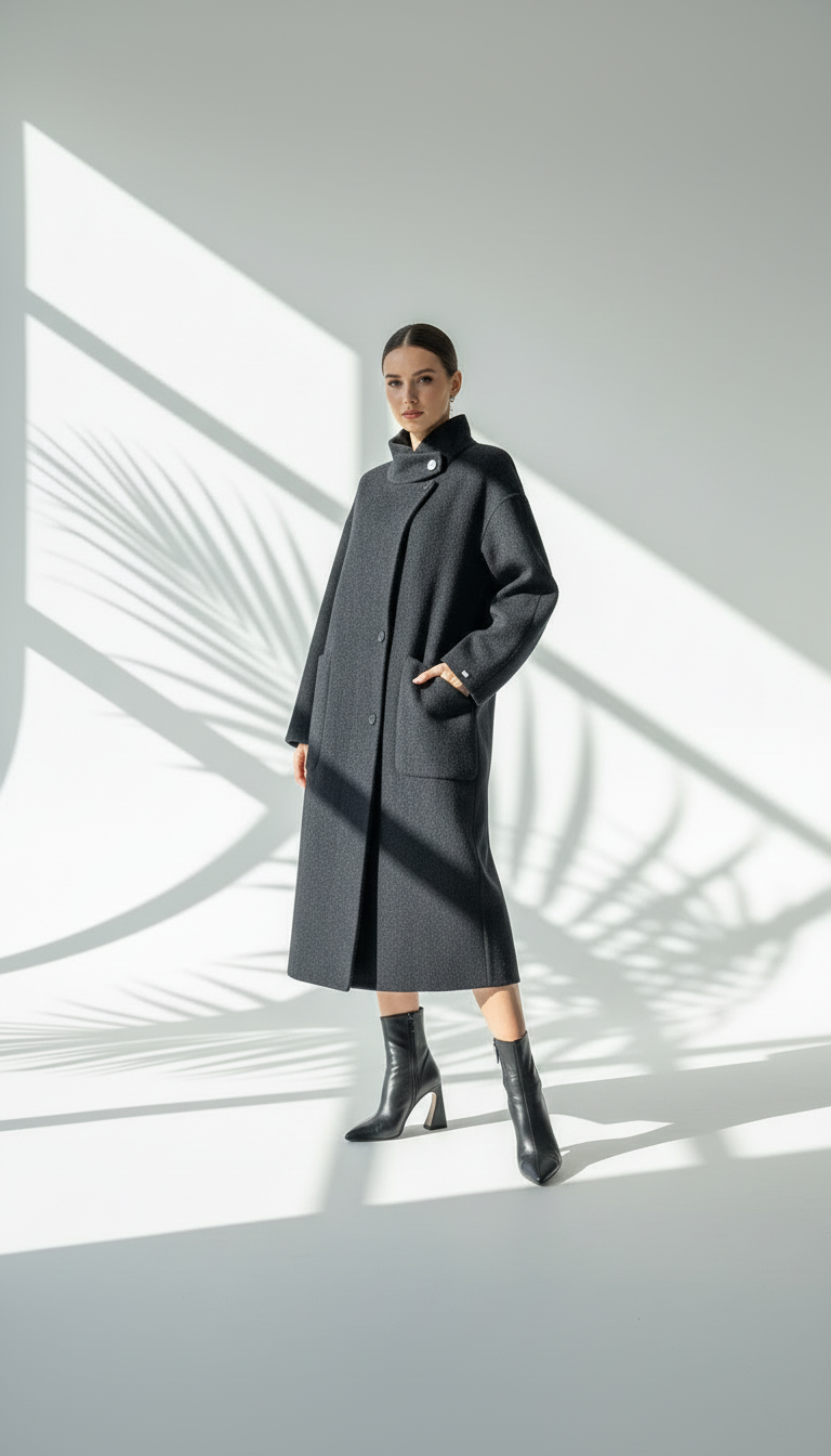 خط عنق مميز (Funnel Neck): تتميز بياقة مرتفعة وعريضة يمكن تثبيتها بزر جانبي، توفر تغطية كاملة للرقبة وتحمي من الرياح الباردة دون الحاجة إلى وشاح.