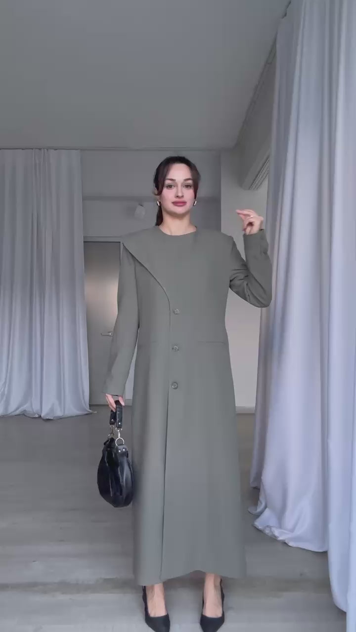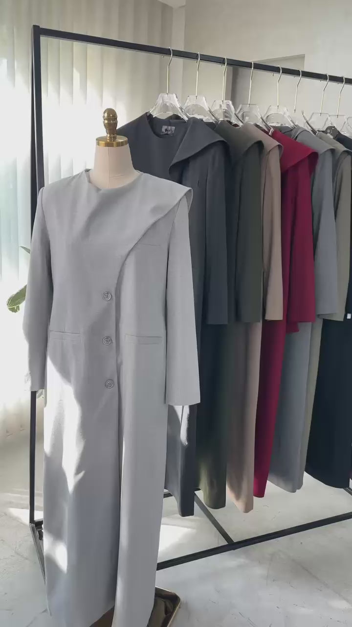 التصميم هو معطف طويل بقصة مستقيمة وأنيقة، يتميز بياقة كلاسيكية مستديرة وأزرار أمامية كبيرة بارزة للإغلاق. الأكمام طويلة وواسعة قليلاً. الخامة مصنوعة من نسيج عالي الجودة وذو قوام متماسك، يضمن مظهراً احترافياً وثابتاً. القصة مصممة لتكون قطعة علوية (Layering piece) فاخرة، وتُعد إضافة ضرورية تعكس اختياراتك الراقية والفريدة، ومناسبة للارتداء كعباية أو معطف في مختلف الأجواء.