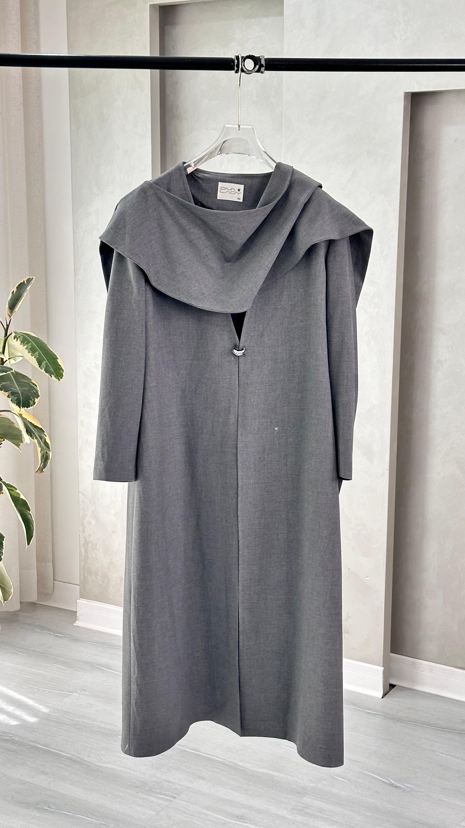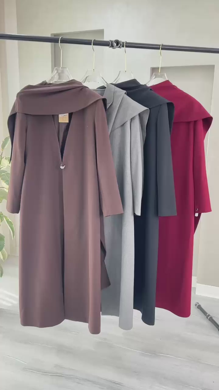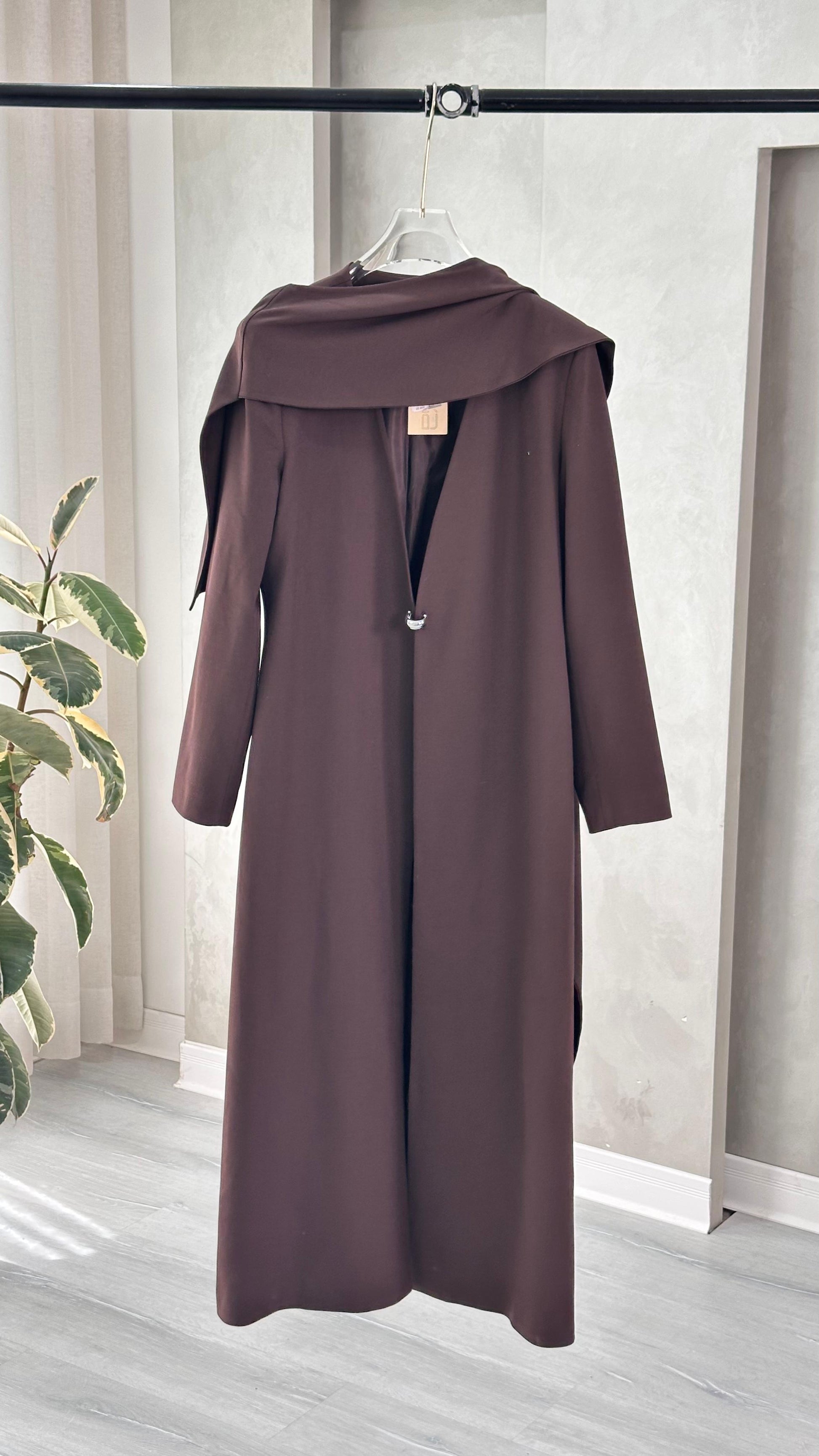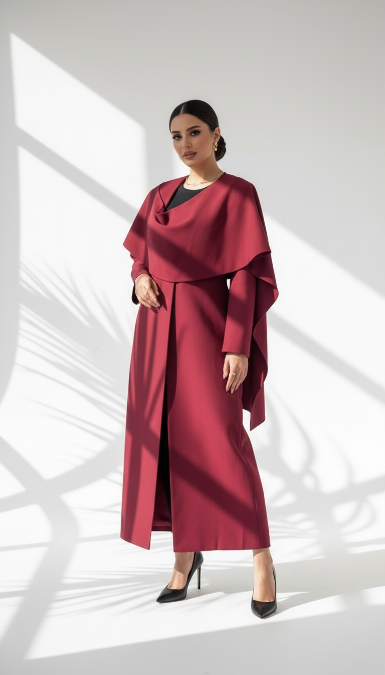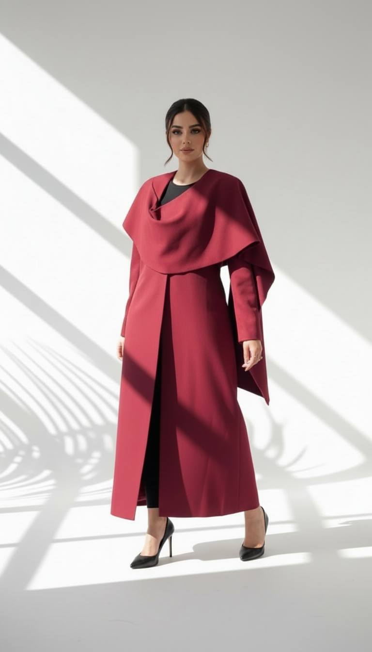 التصميم هو جاكيت أو معطف طويل يتميز بقطعة قماش علوية منسدلة بشكل كاب على الأكتاف، مما يضفي حجماً وشكلاً درامياً. القصة مستقيمة ومحددة عند الخصر. يتميز بياقة كلاسيكية عالية. الخامة مصنوعة من نسيج عالي الجودة وذو قوام متماسك، يضمن مظهراً احترافياً وثابتاً. القصةمصممة بعناية فائقة لتوفير مظهر أنيق يجمع بين الموضة والعملية، وتُعد إضافة ضرورية تعكس اختياراتك الراقية والفريدة، ومناسبة للمناسبات الرسمية والاحتفالية.