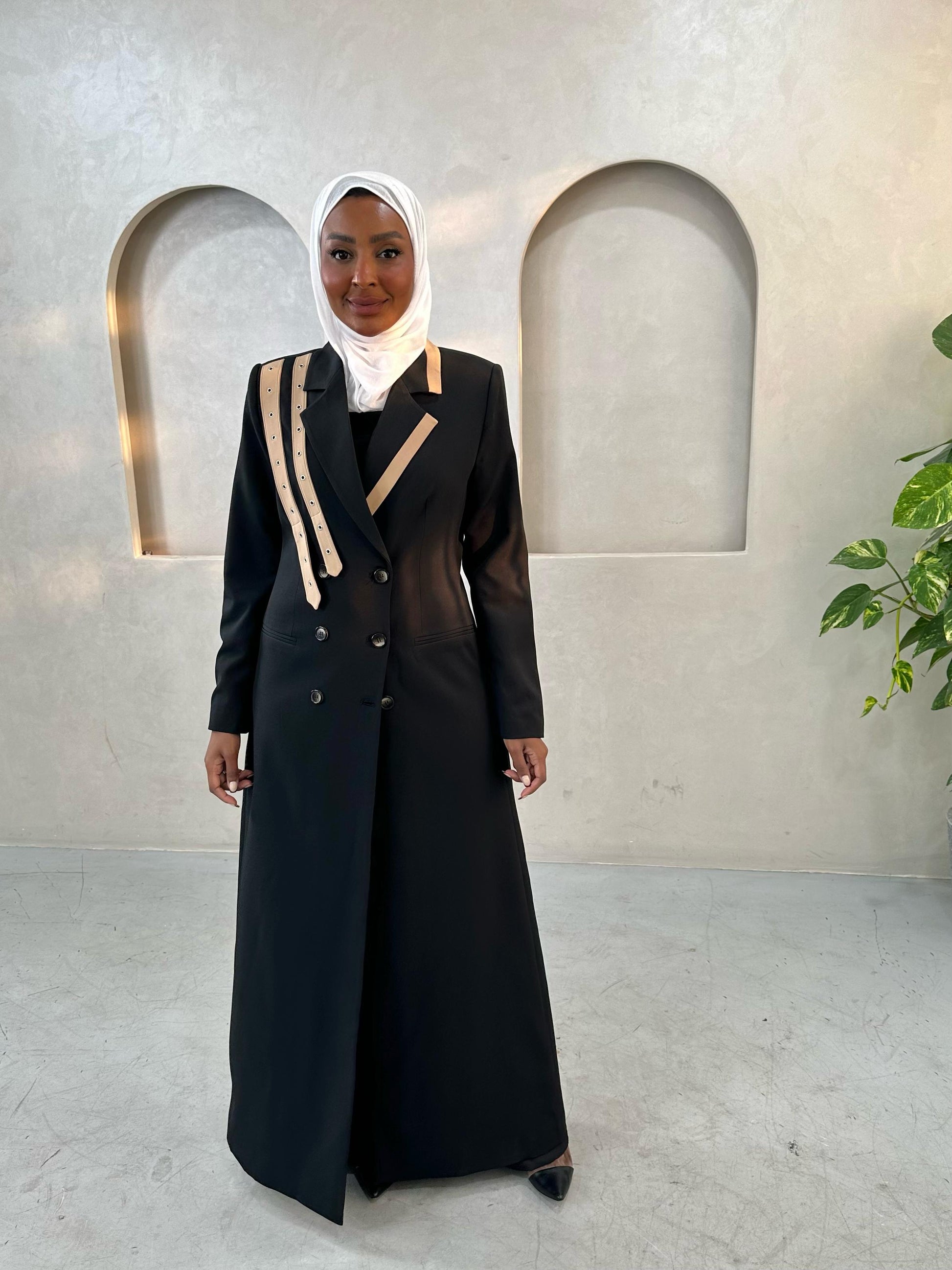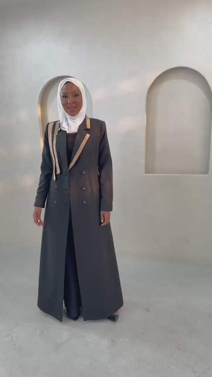 التصميم هو معطف طويل وقصة مستقيمة ومحددة عند الخصر، يتميز بياقة كلاسيكية واسعة مع تفاصيل دقيقة على الأطراف أو الياقة تشبه اللؤلؤ. الأكمام طويلة. يشتمل على حزام داخلي أو تصميم يحدد الخصر بشكل أنيق. الخامة مصنوعة من نسيج عالي الجودة وذو قوام متماسك، يضمن مظهراً احترافياً وثابتاً. القصة مصممة لتكون قطعة علوية (Layering piece) فاخرة، وتُعد إضافة ضرورية تعكس اختياراتك الراقية والفريدة.