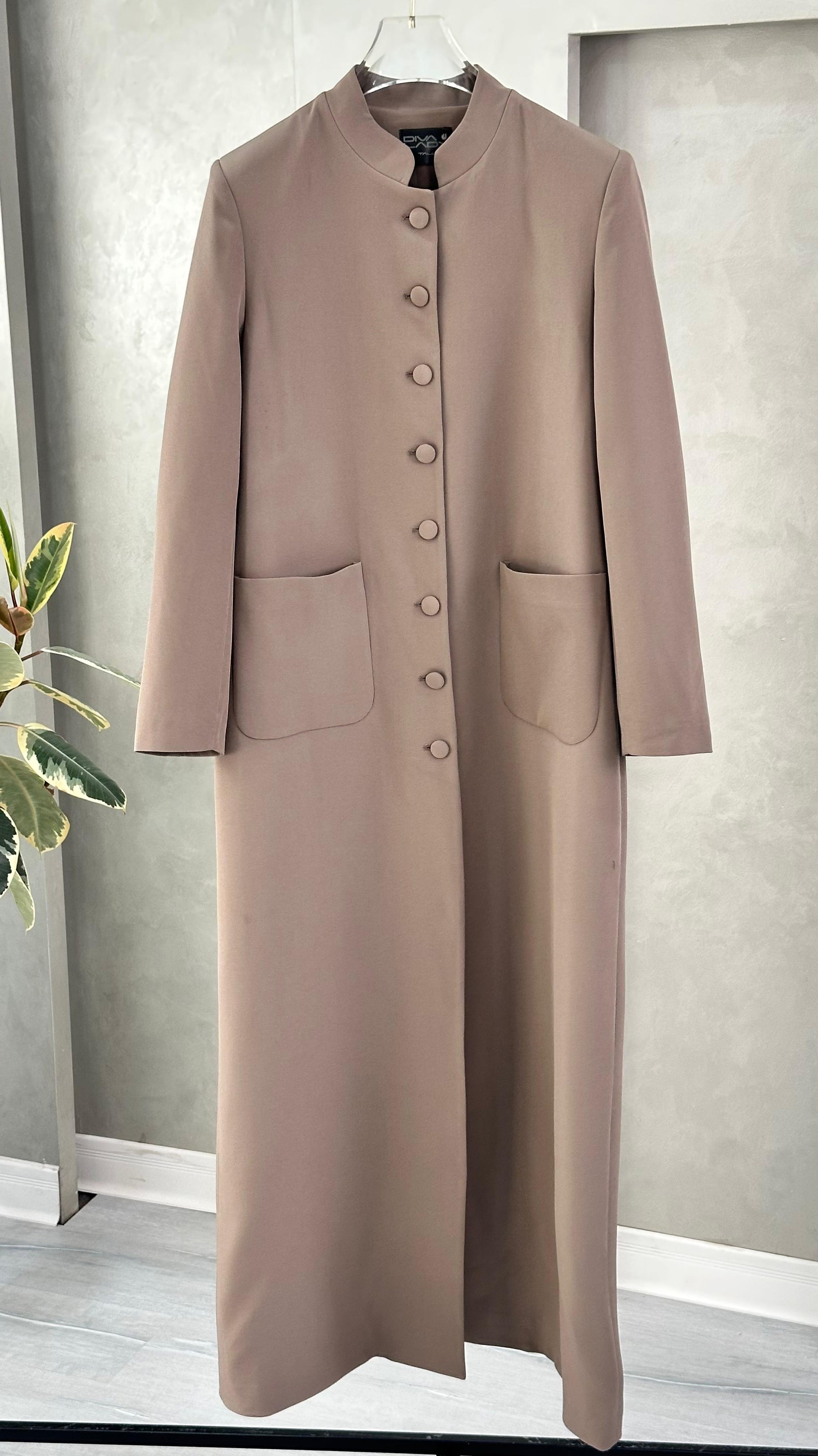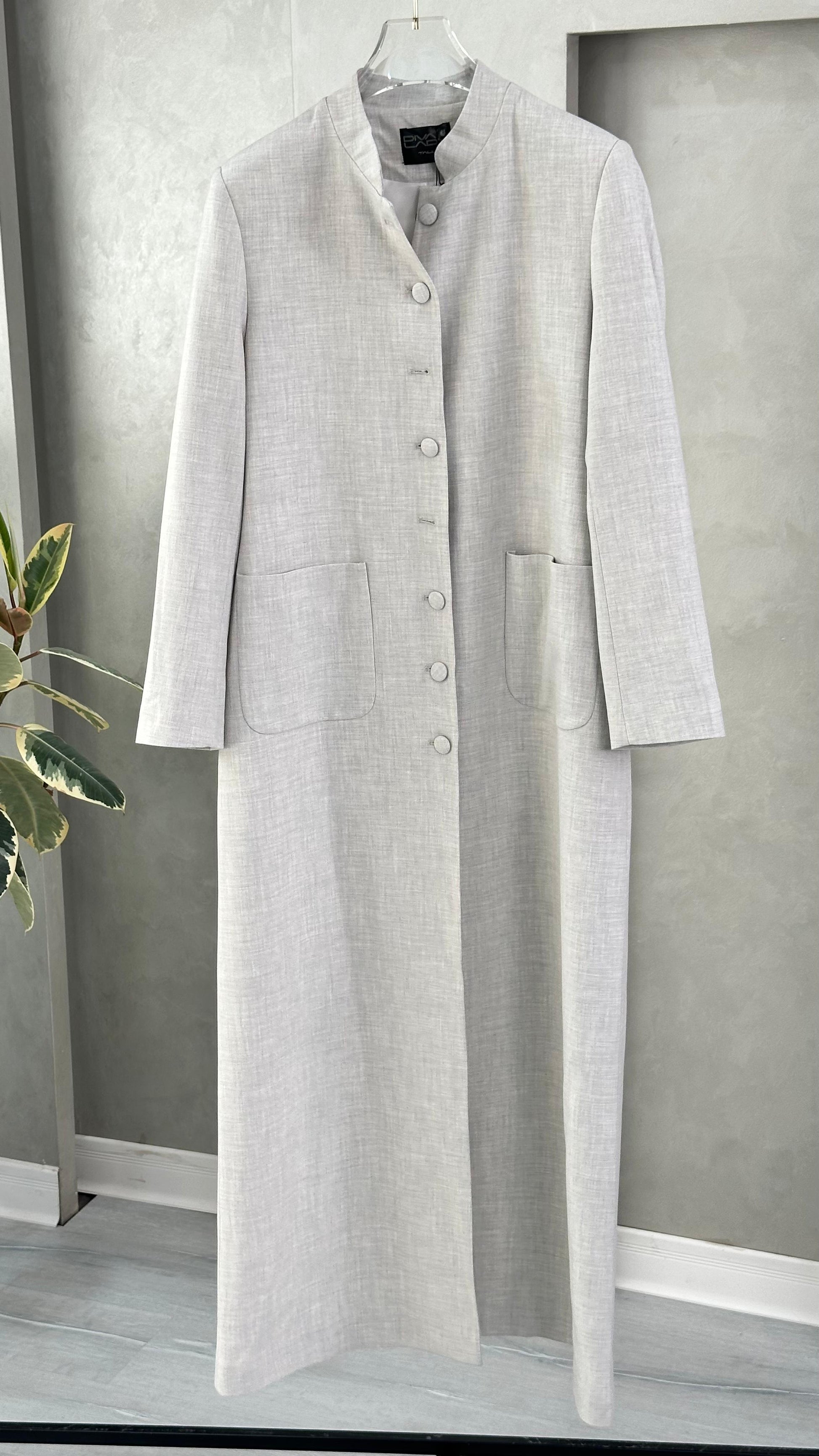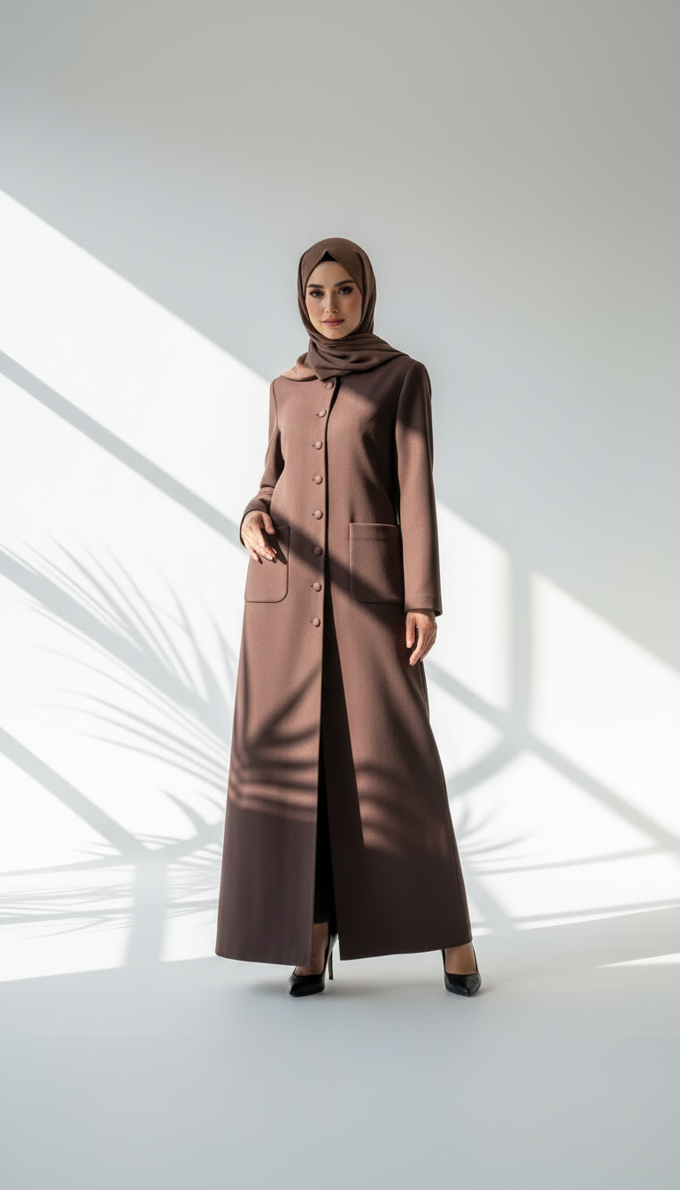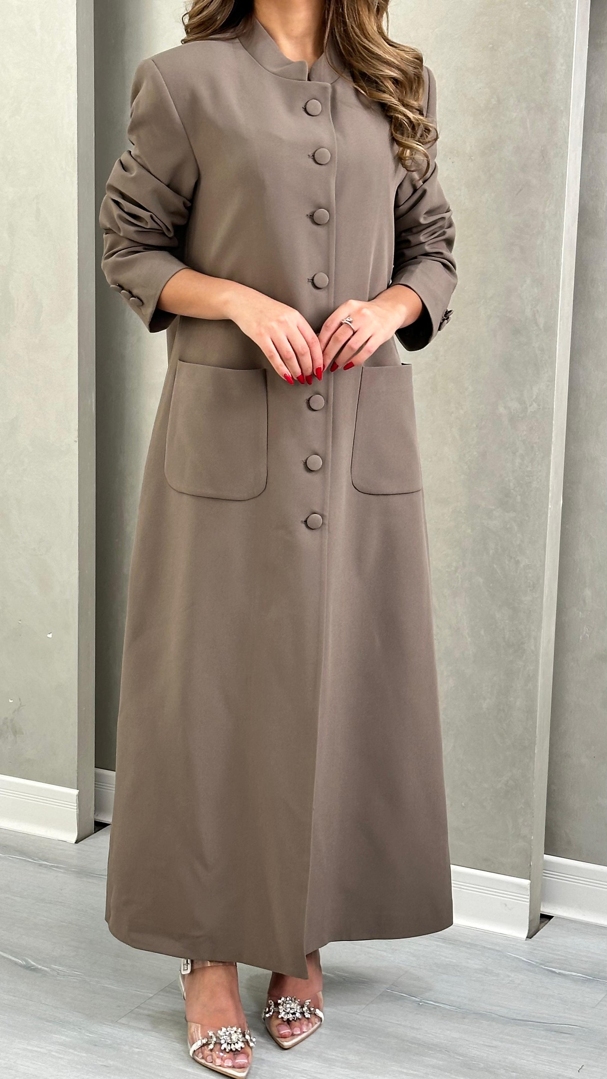 القطعة عبارة عن عباية أو معطف طويل بتصميم أنيق وناعم يمتد حتى الأرض تقريبًا.