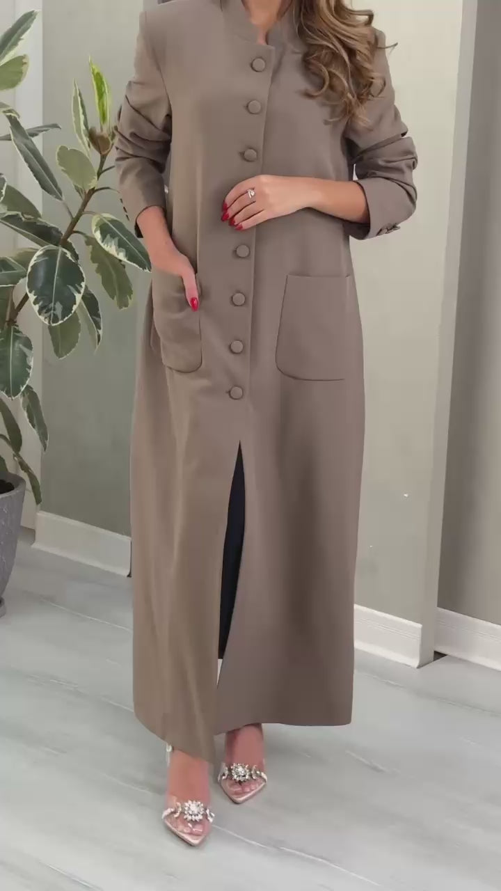 • ياقة بسيطة مستقيمة دون أي زينة إضافية، تمنح المظهر طابعًا راقيًا وهادئًا.