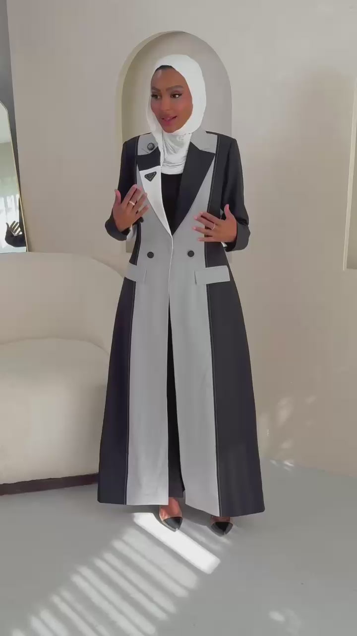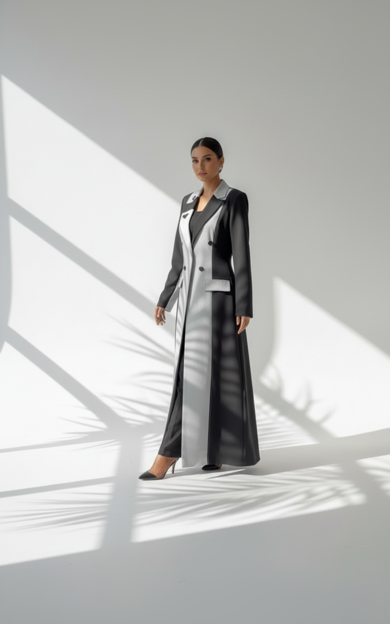 التصميم هو معطف طويل وقصة مستقيمة، يتميز بدمج لونين مختلفين بطريقة هندسية مميزة، مع تفاصيل متباينة عند الياقة والأطراف. الأكمام طويلة. يشتمل على حزام داخلي أو تصميم يحدد الخصر بشكل أنيق. الخامة مصنوعة من نسيج عالي الجودة وذو قوام متماسك، يضمن مظهراً احترافياً وثابتاً. القصة مصممة لتكون قطعة علوية (Layering piece) فاخرة، وتُعد إضافة ضرورية تعكس اختياراتك الراقية والفريدة، ومناسبة للارتداء كعباية أو كمعطف في المناسبات الرسمية.