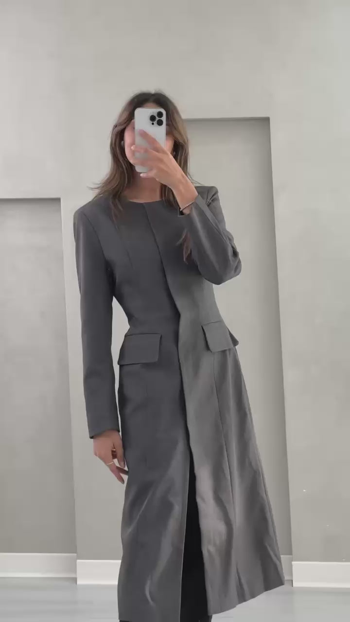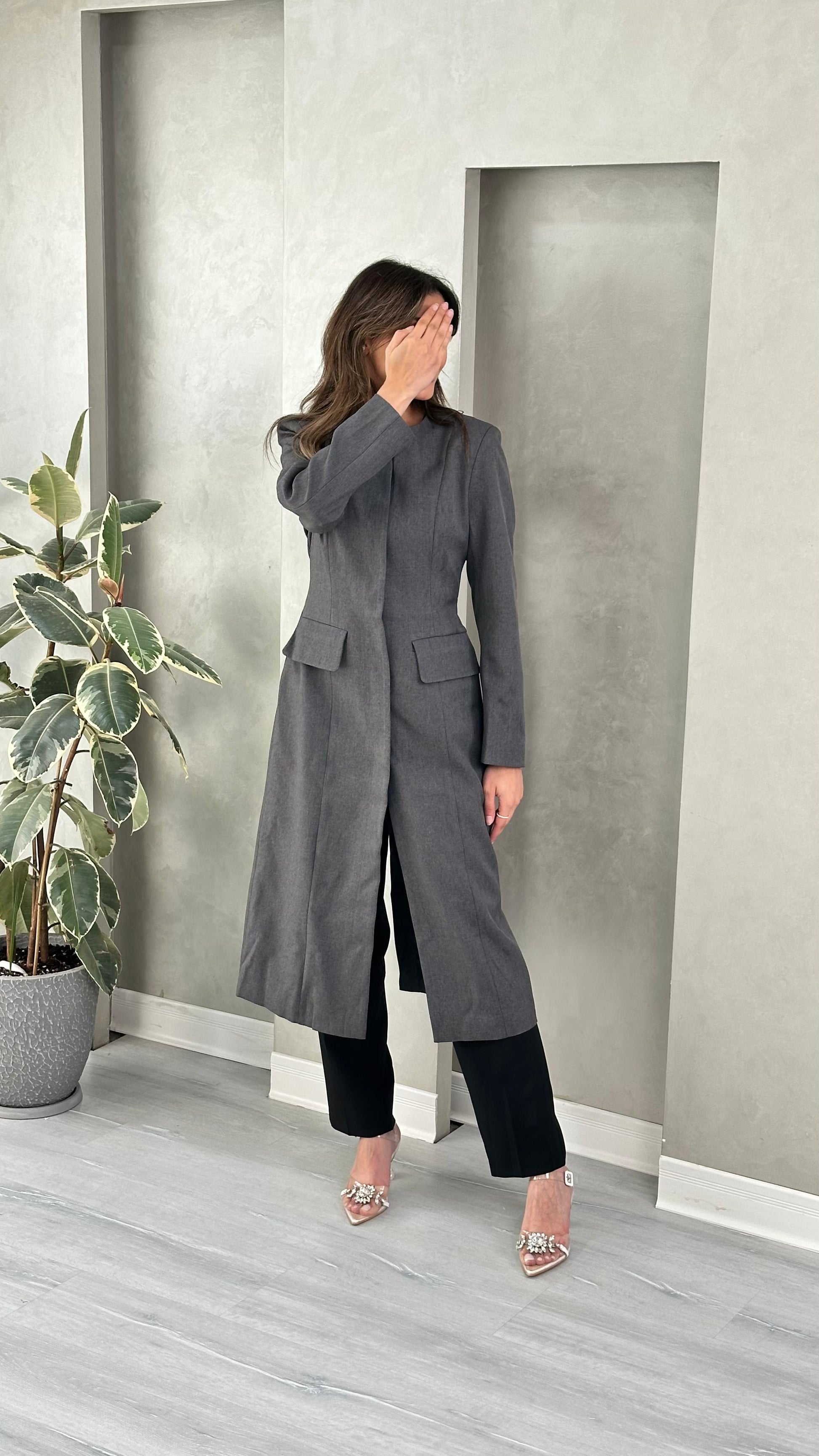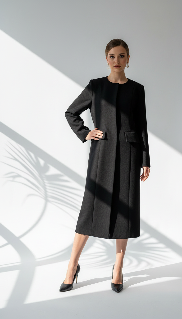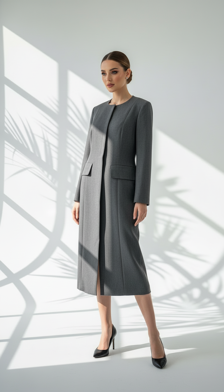- **التصميم**: جاكيت طويل ومُفصّل، يمتد إلى ما بعد الركبة.