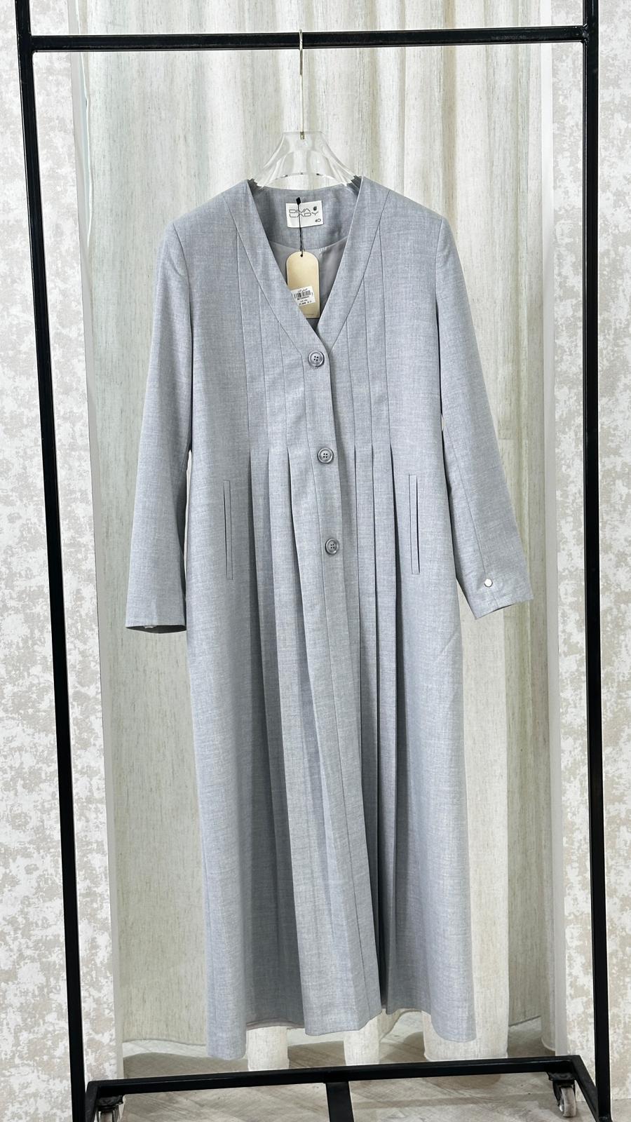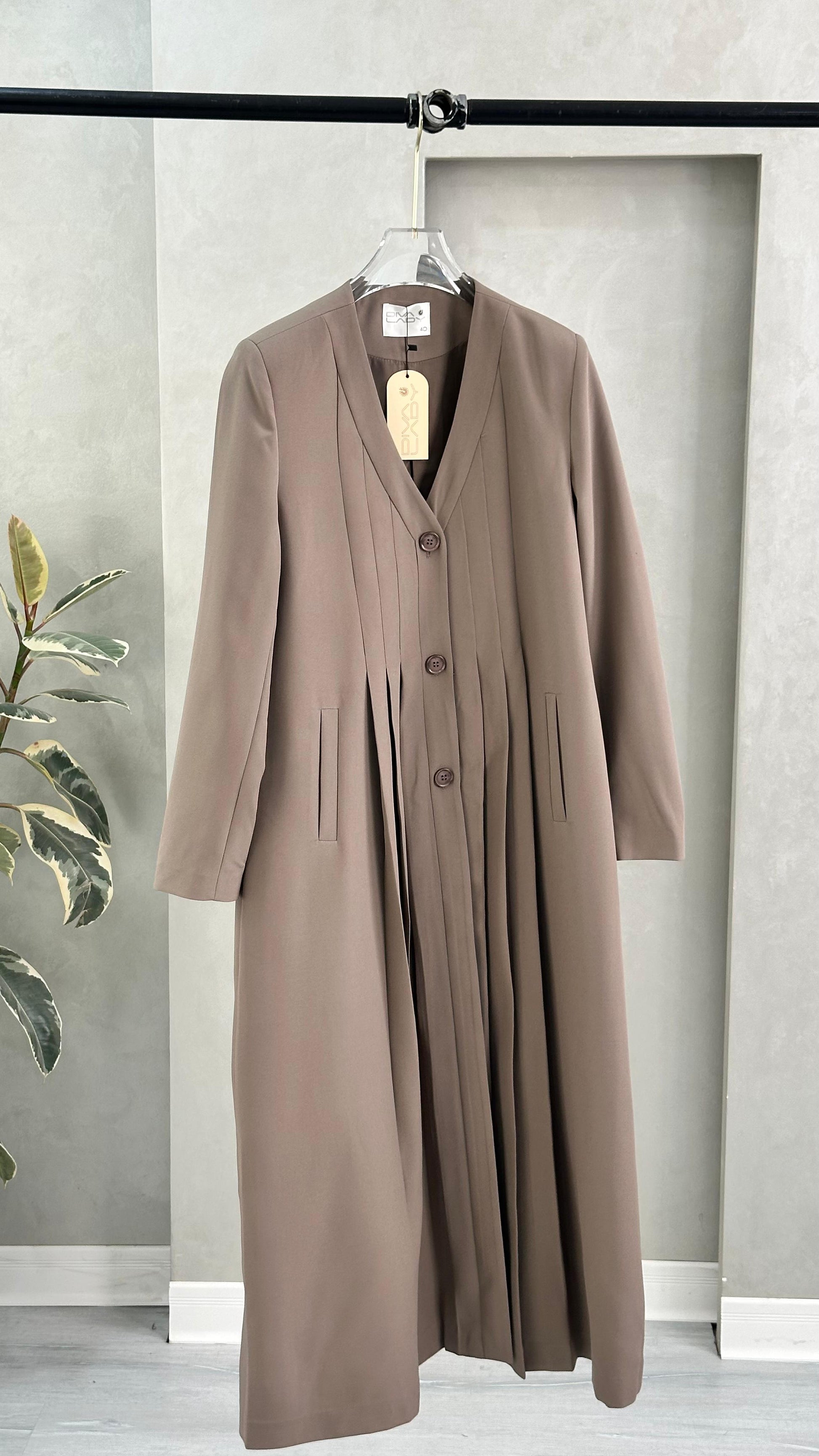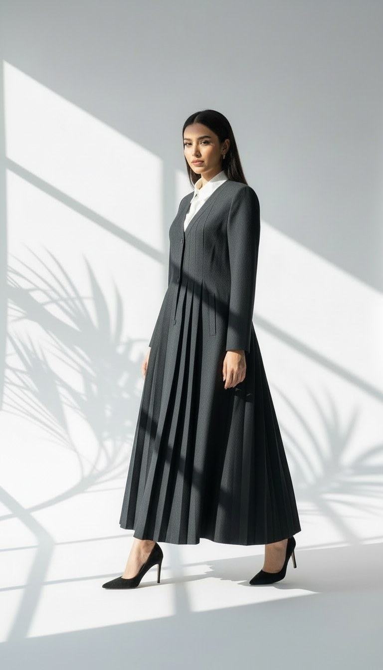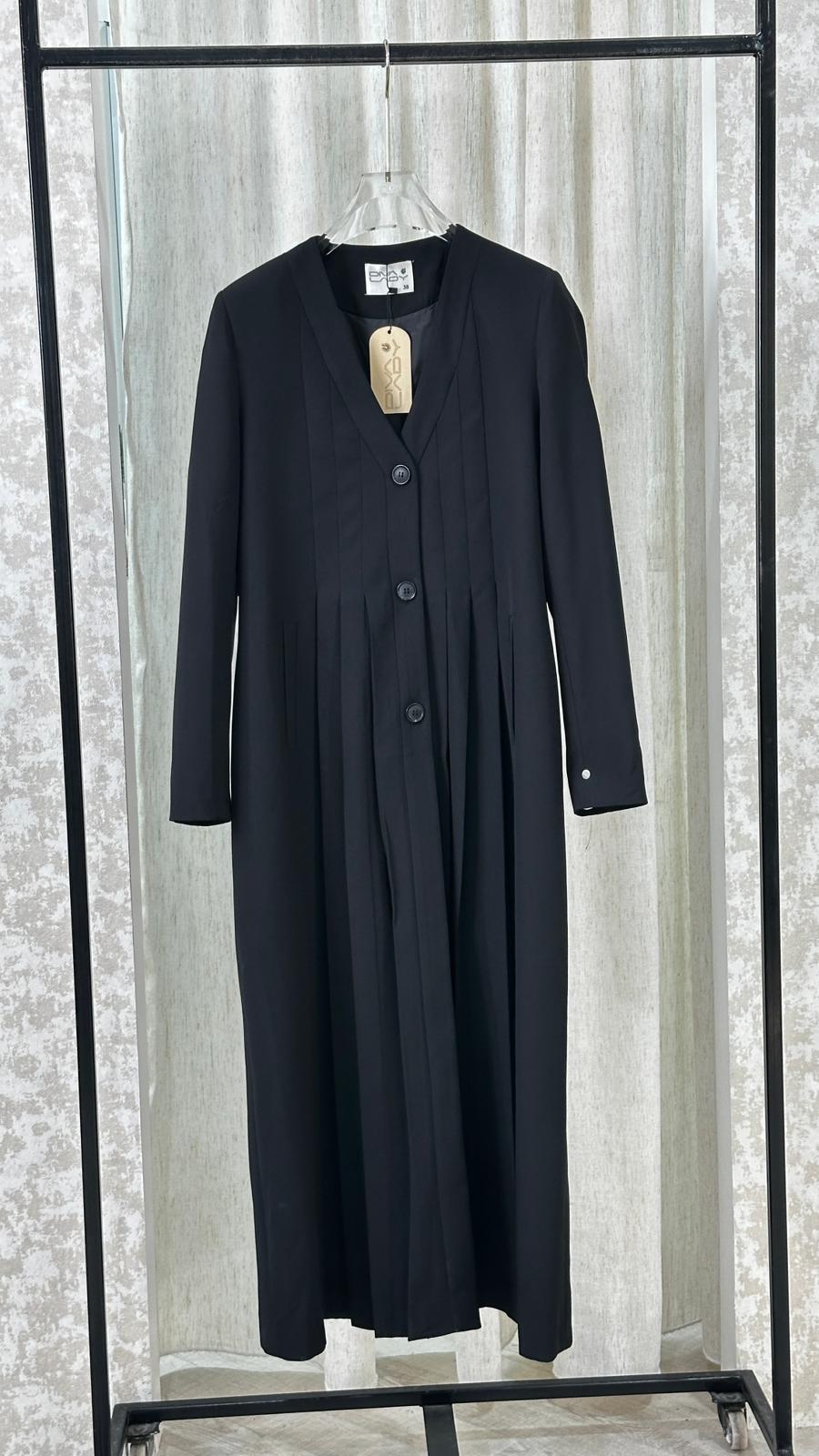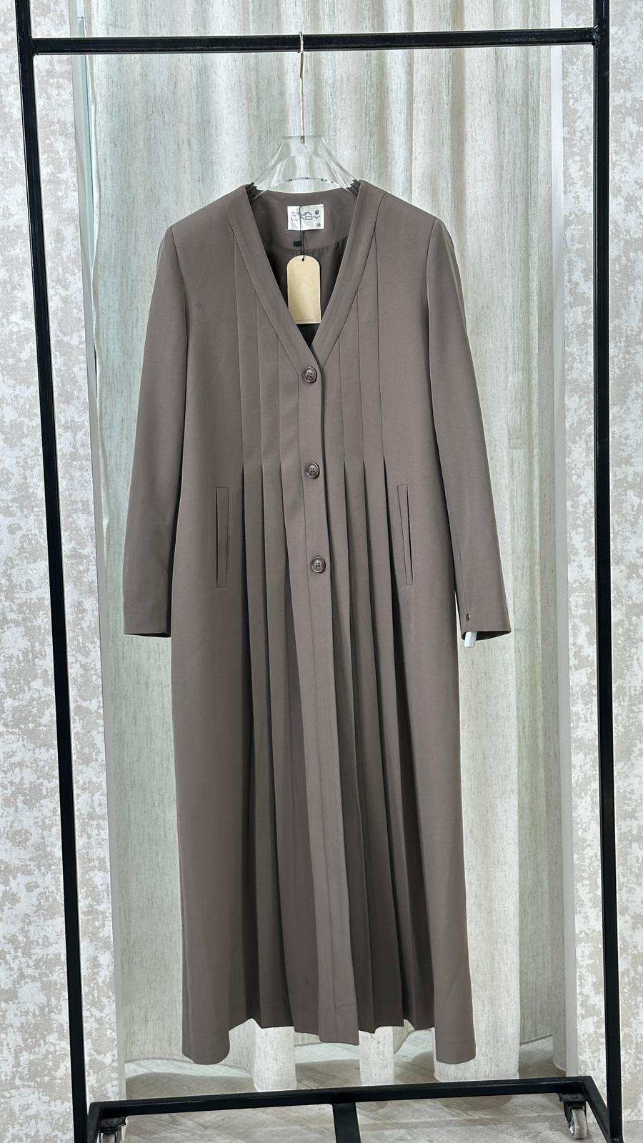 معطف طويل بتصميم هندسي أنيق، يتميز بياقة على شكل حرف V عميق، وأكمام طويلة بقصة مستقيمة. المعطف مزوّد بثنيات دقيقة تمتد بشكل عمودي على كامل القطعة، ما يمنحه ملمسًا مميزًا وحركة انسيابية عند الارتداء. القصة العامة للمعطف تجمع بين الهيكلية والنعومة، ما يضفي عليه طابعًا فنيًا ومعاصرًا.