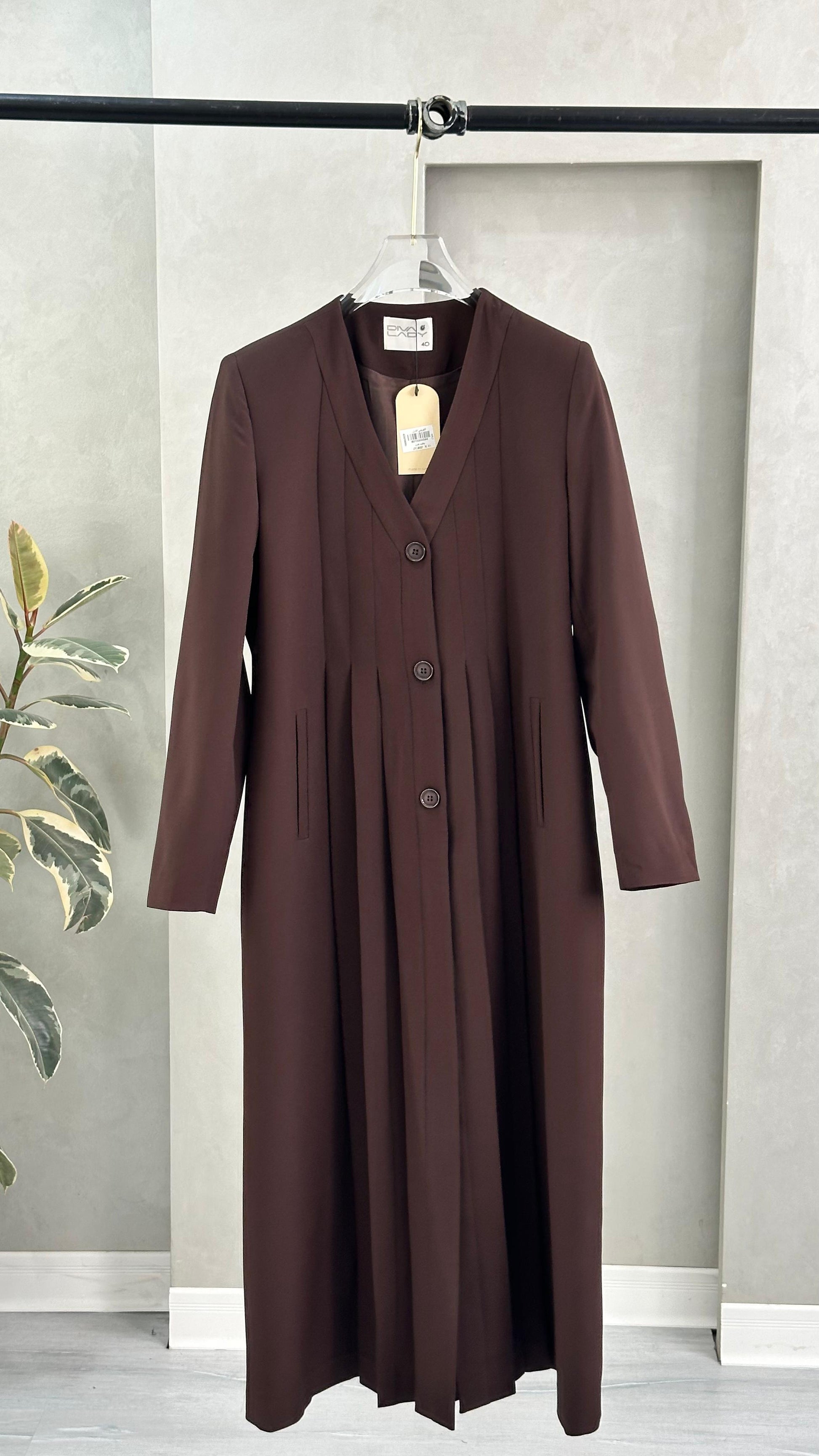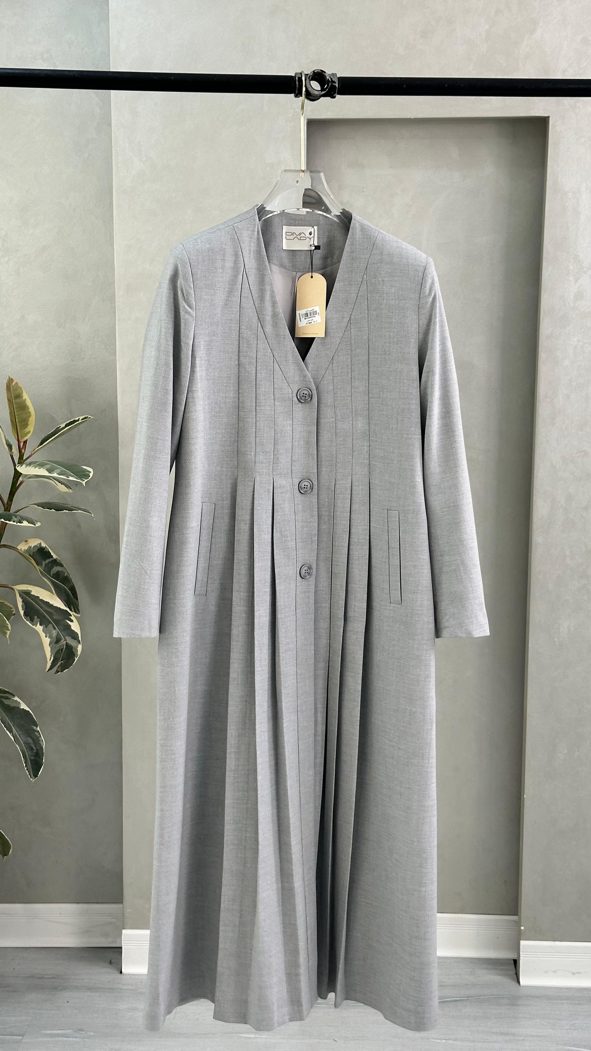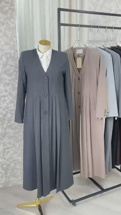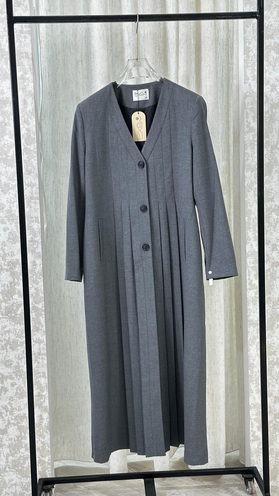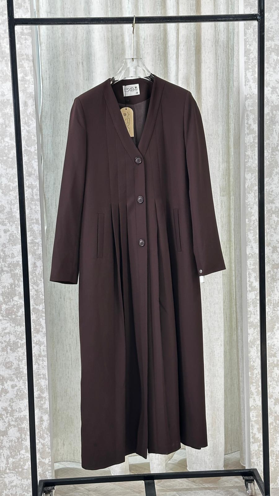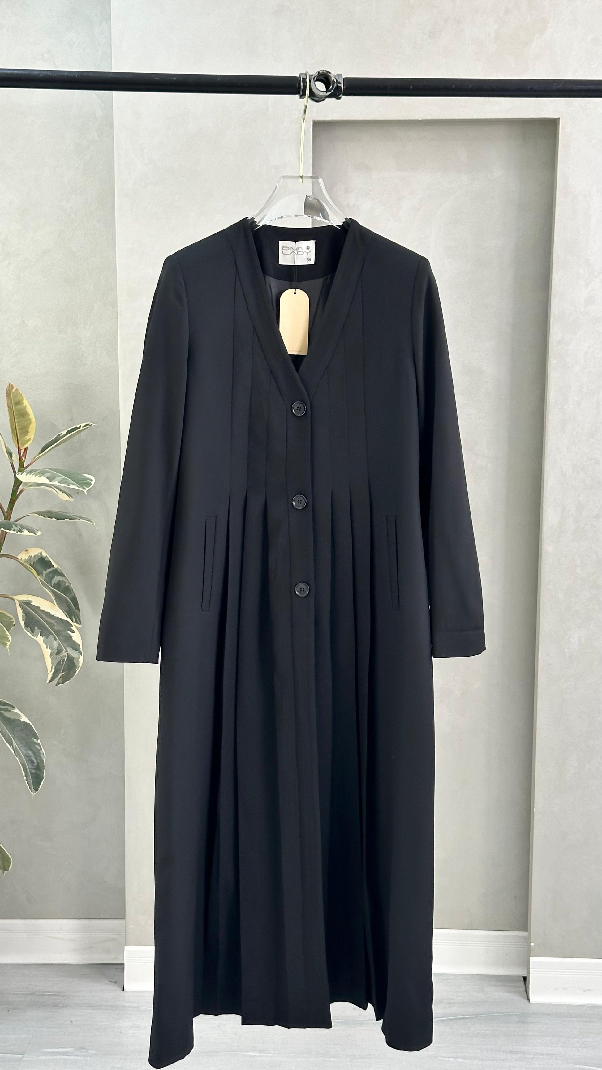 معطف طويل بتصميم هندسي أنيق، يتميز بياقة على شكل حرف V عميق، وأكمام طويلة بقصة مستقيمة. المعطف مزوّد بثنيات دقيقة تمتد بشكل عمودي على كامل القطعة، ما يمنحه ملمسًا مميزًا وحركة انسيابية عند الارتداء. القصة العامة للمعطف تجمع بين الهيكلية والنعومة، ما يضفي عليه طابعًا فنيًا ومعاصرًا.