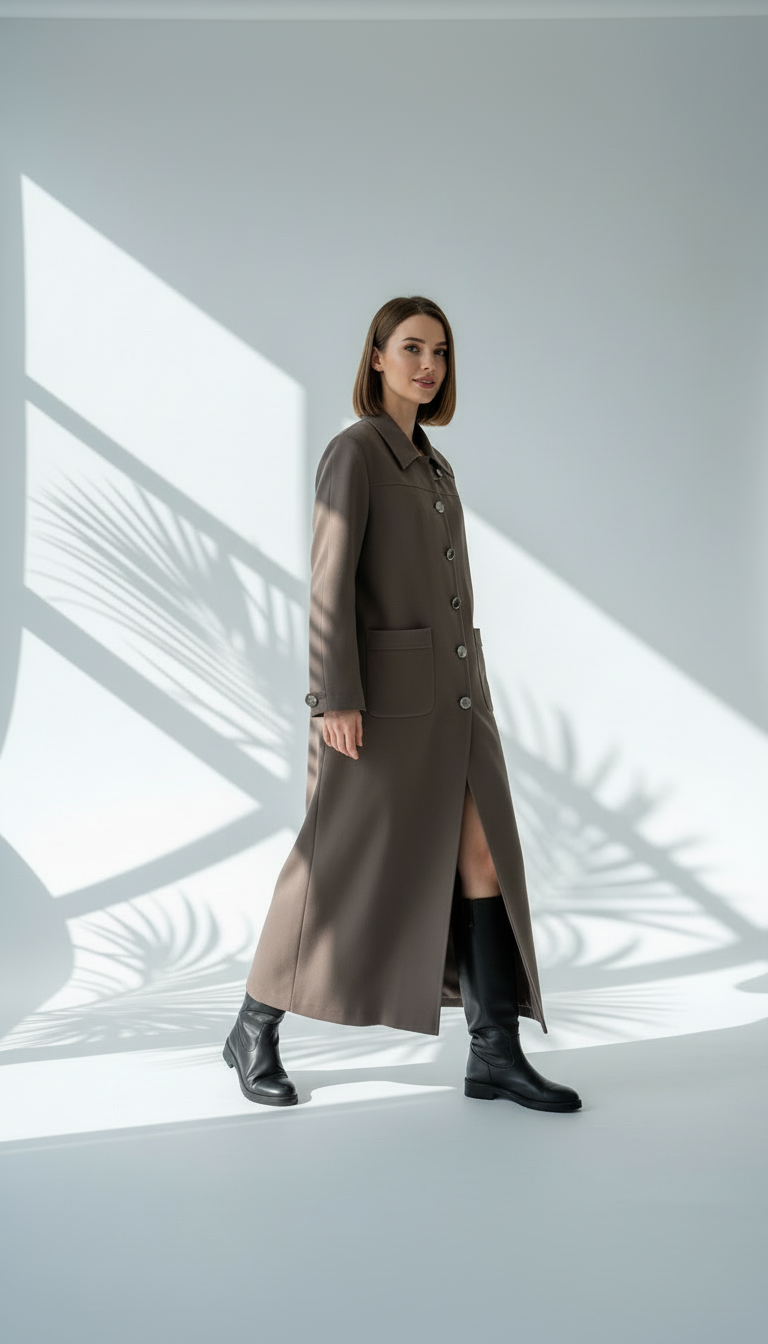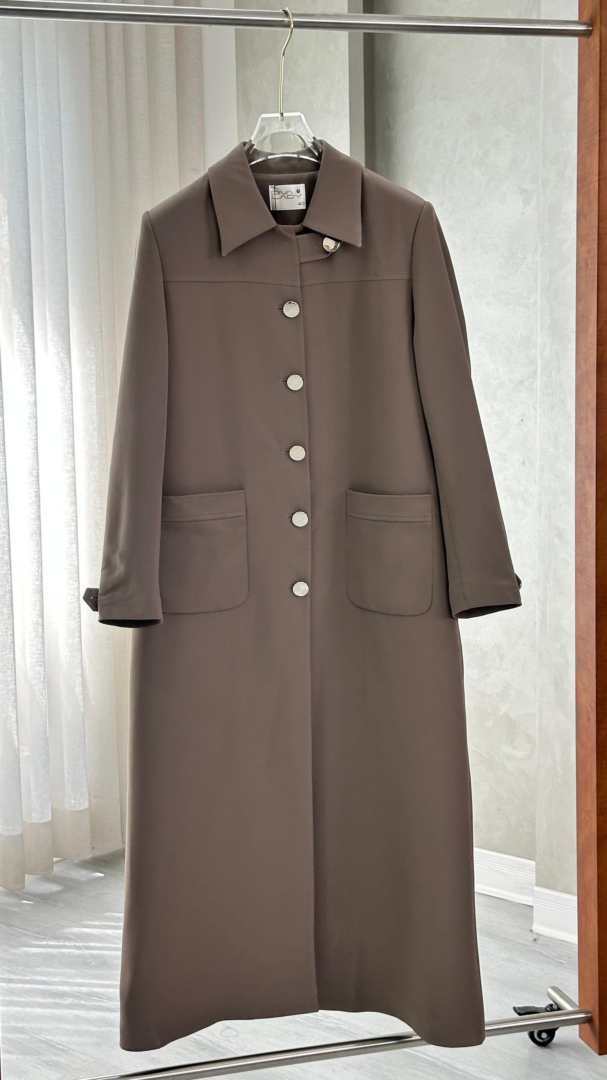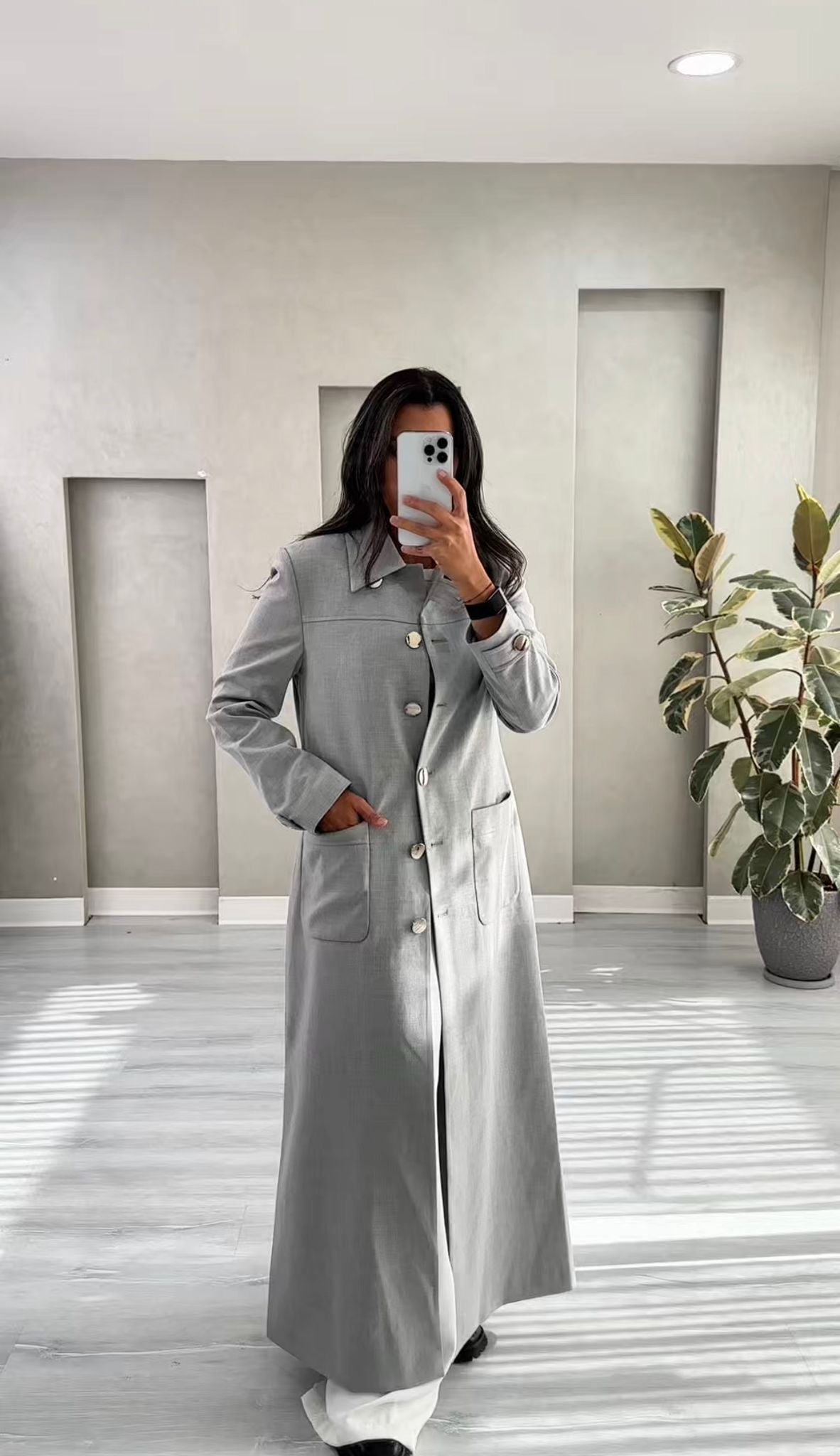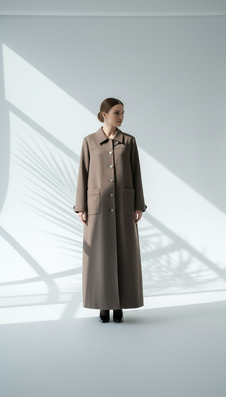 معطف طويل كلاسيكي، هادئ التصميم، يمنح مظهراً رسمياً وراقياً، مناسب للإطلالات الشتوية أو الراقية ذات الطابع البسيط والأنيق.