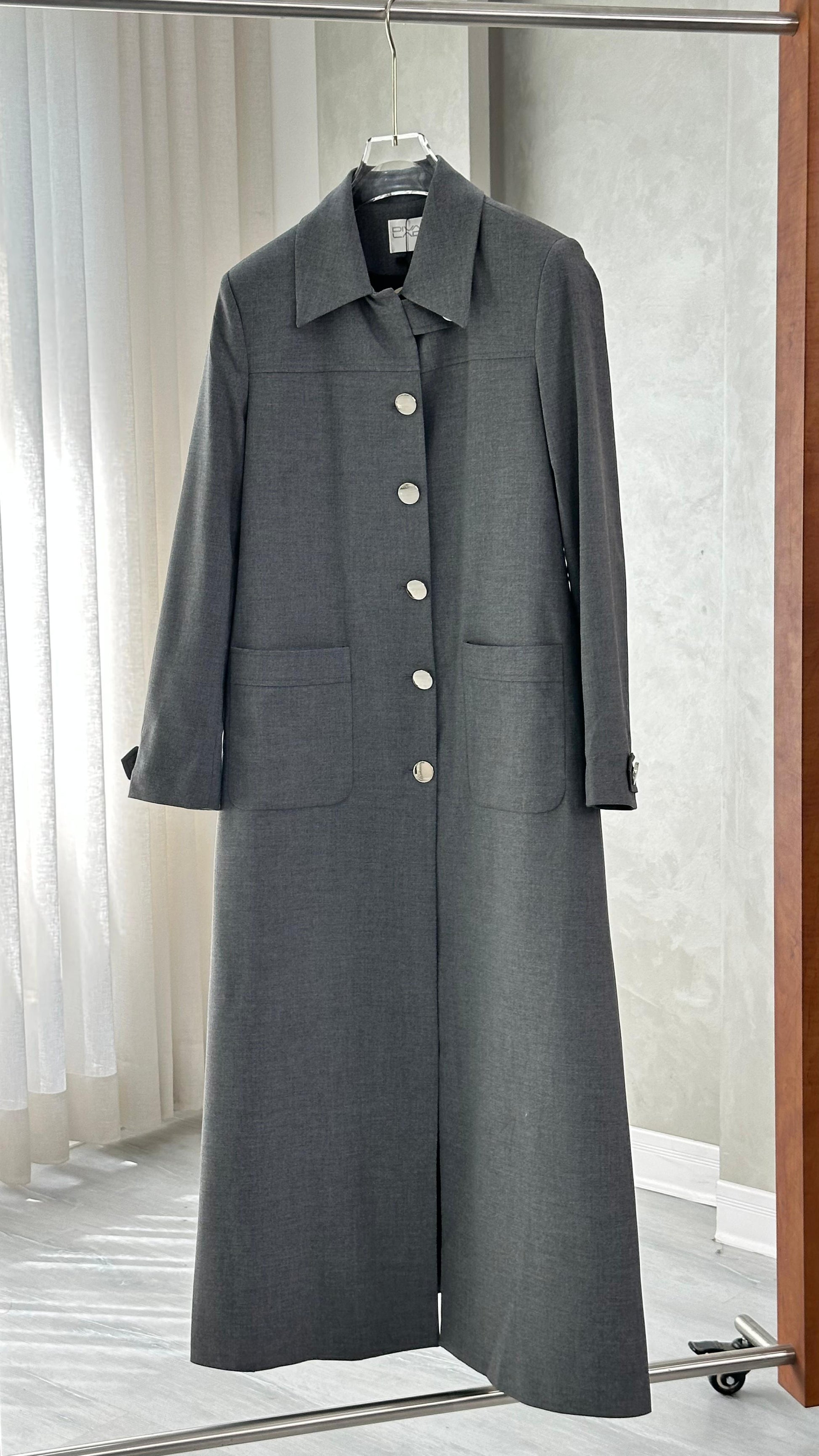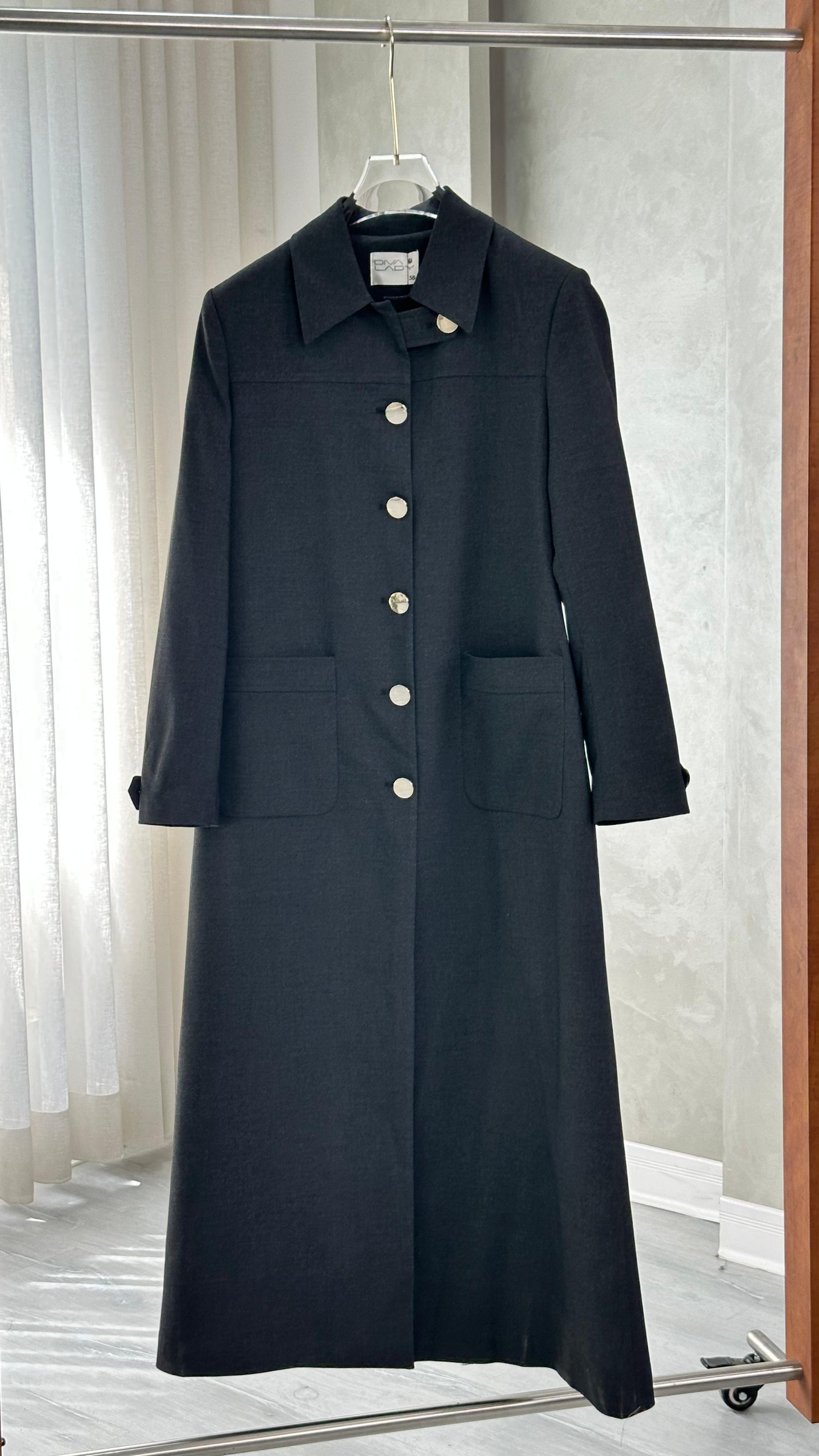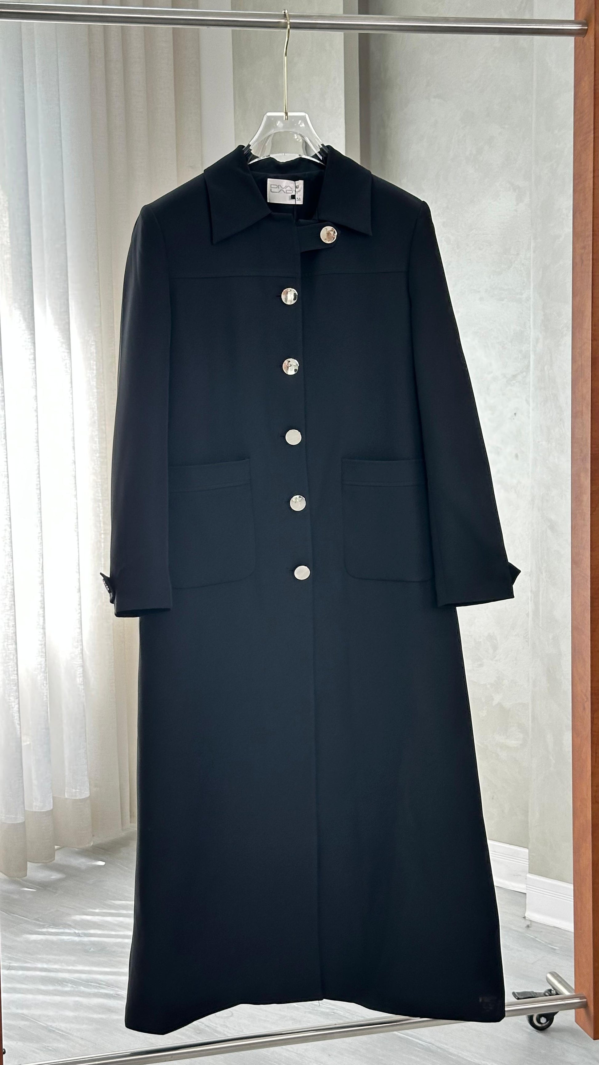 معطف طويل كلاسيكي، هادئ التصميم، يمنح مظهراً رسمياً وراقياً، مناسب للإطلالات الشتوية أو الراقية ذات الطابع البسيط والأنيق.