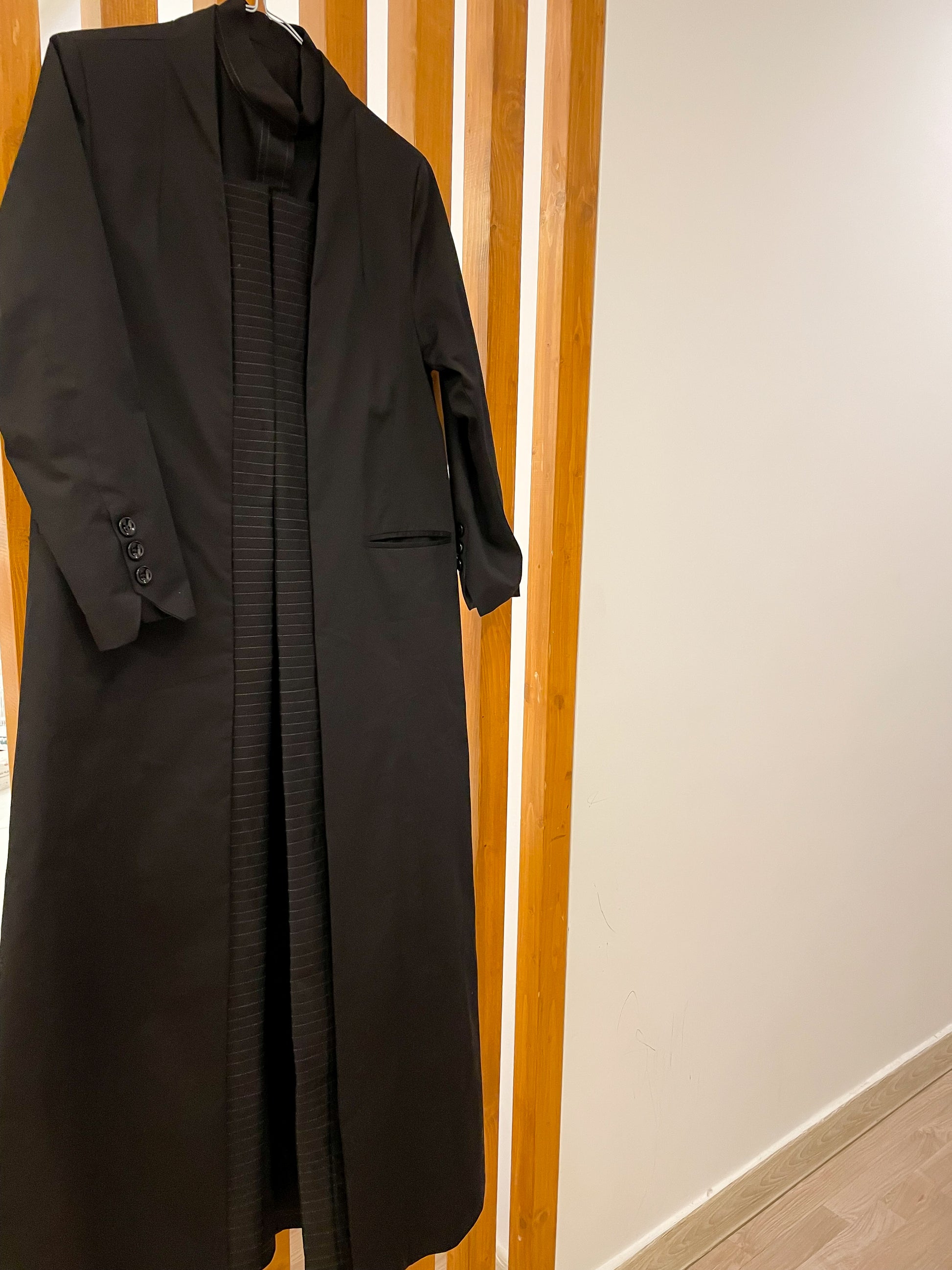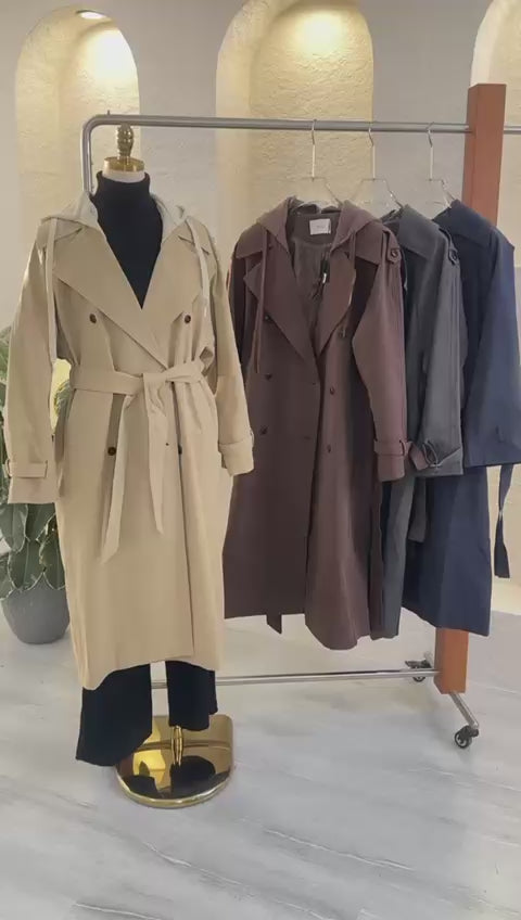 جاكيت نسائي طويل بتصميم راقٍ مزوّد بحزام خصر وأزرار أمامية. خامة فاخرة ومريحة تناسب الإطلالات اليومية والرسمية
