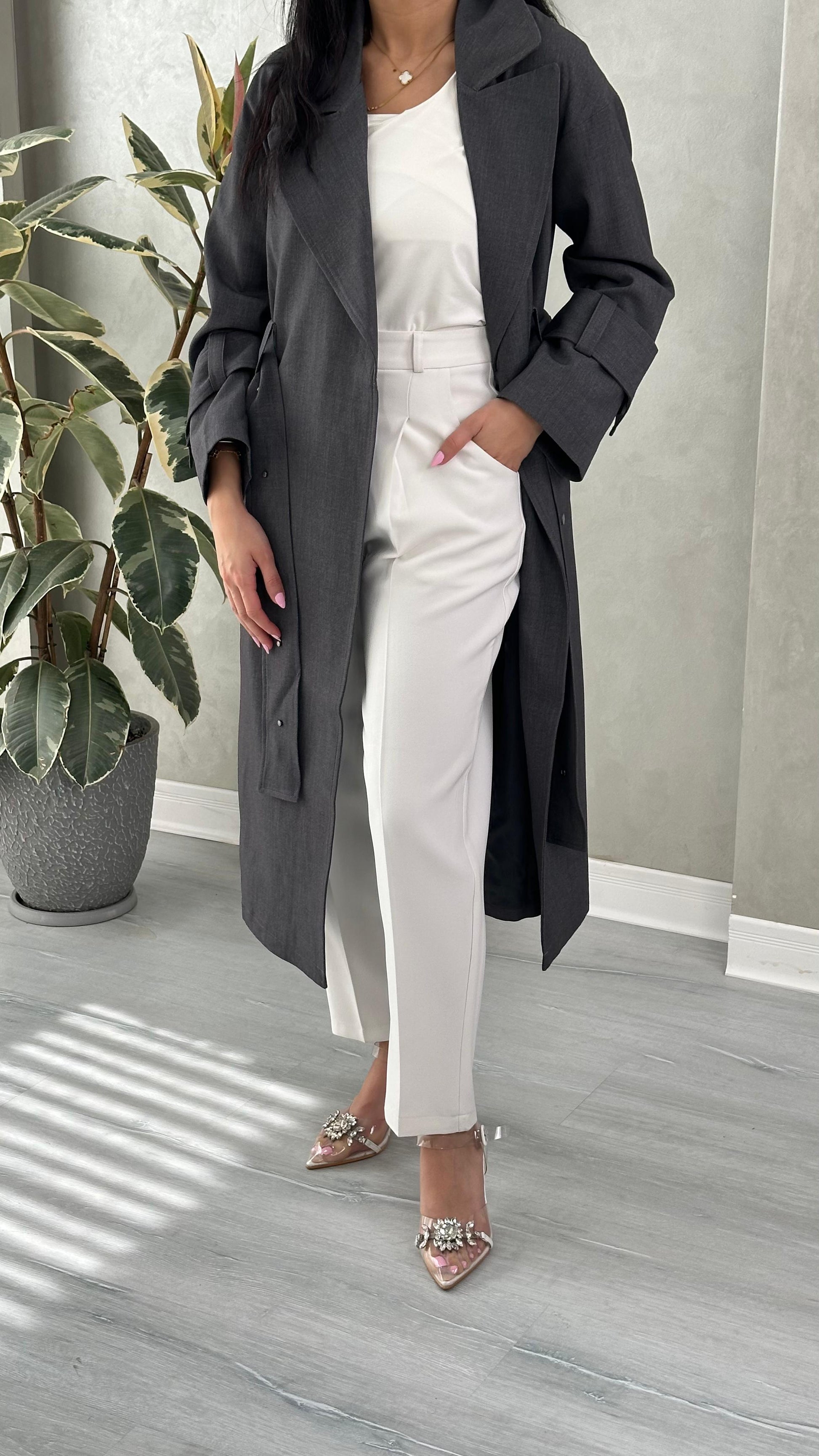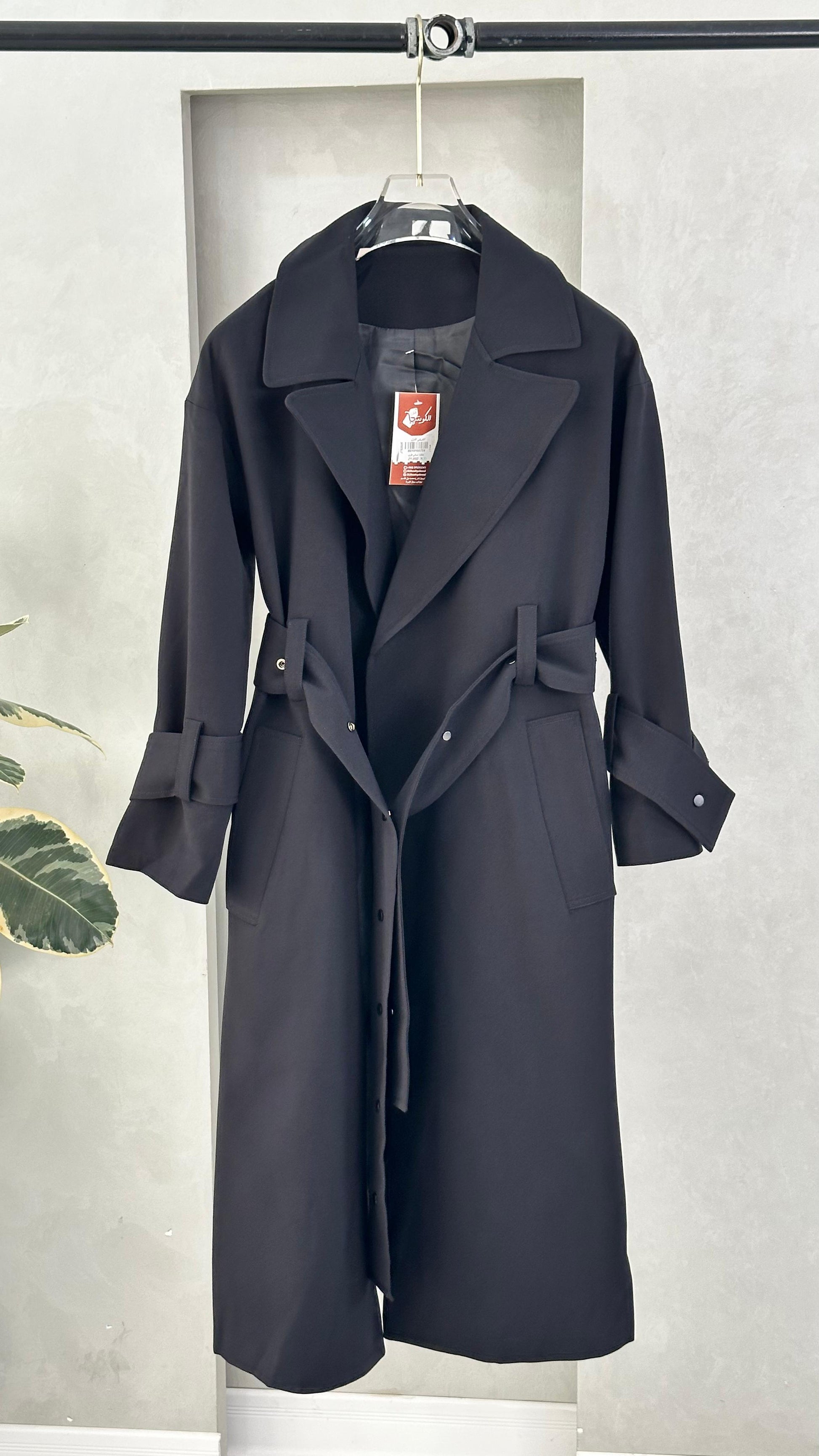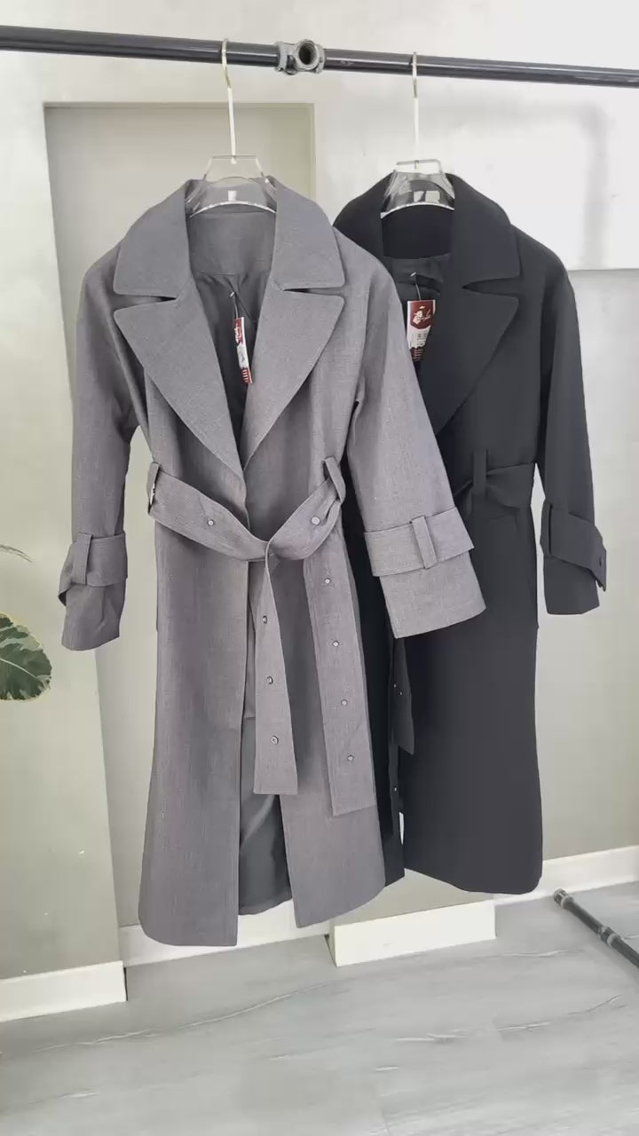 التصميم: يتميز المعطف بقصة كلاسيكية مستقيمة أو "A-line"، مع ياقة مطوية عريضة (Lapel Collar) تضفي طابعاً رسمياً.