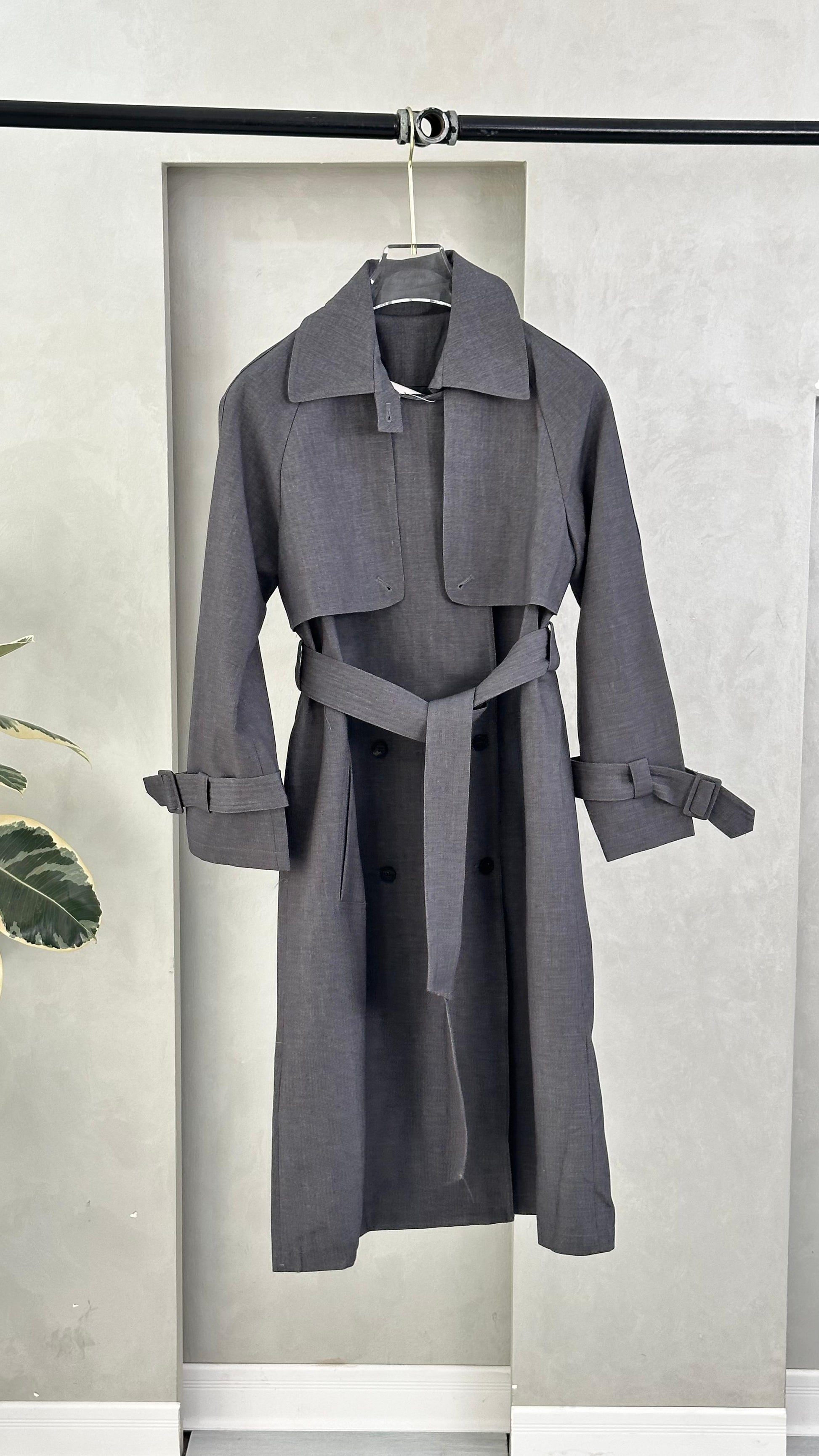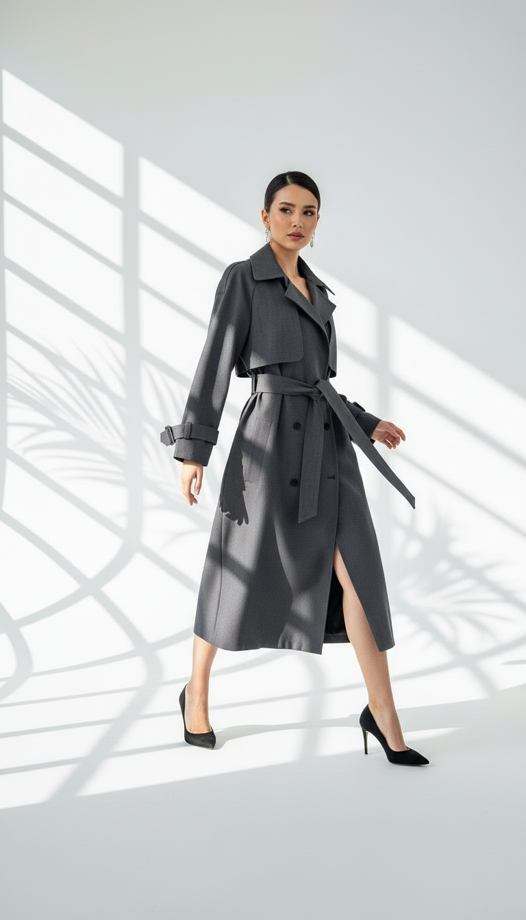 الشكل: معطف طويل (ترينش كوت) بأكمام طويلة، معروض على عارضة أزياء بيضاء في وضعية مشي حيوية.
