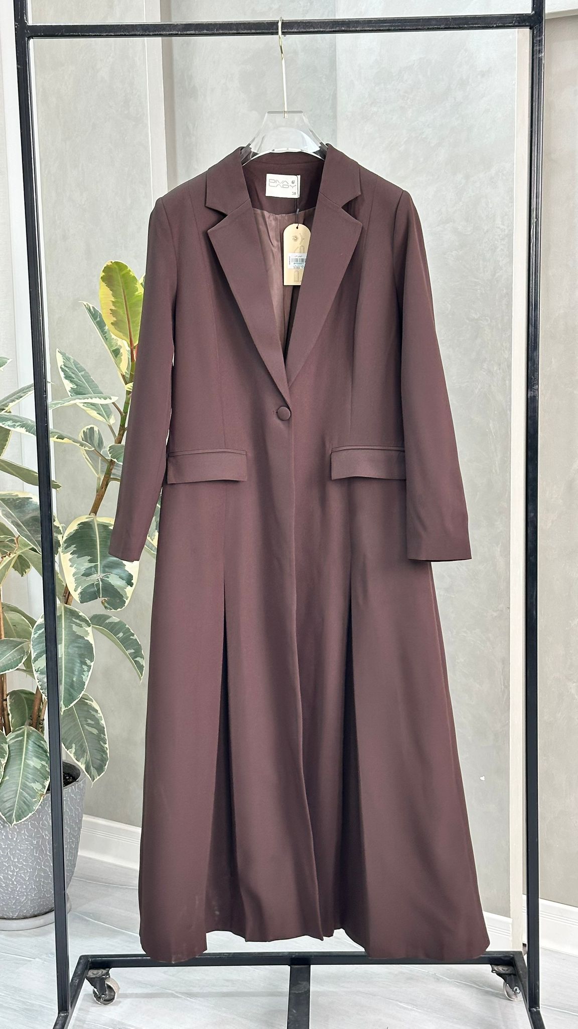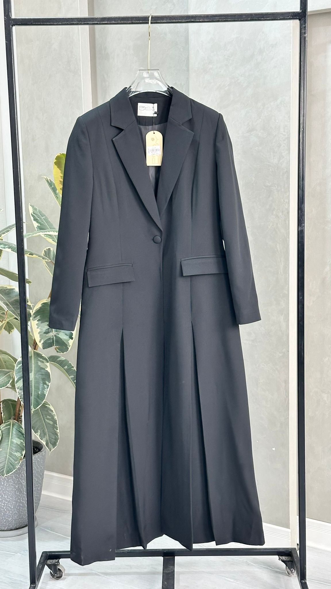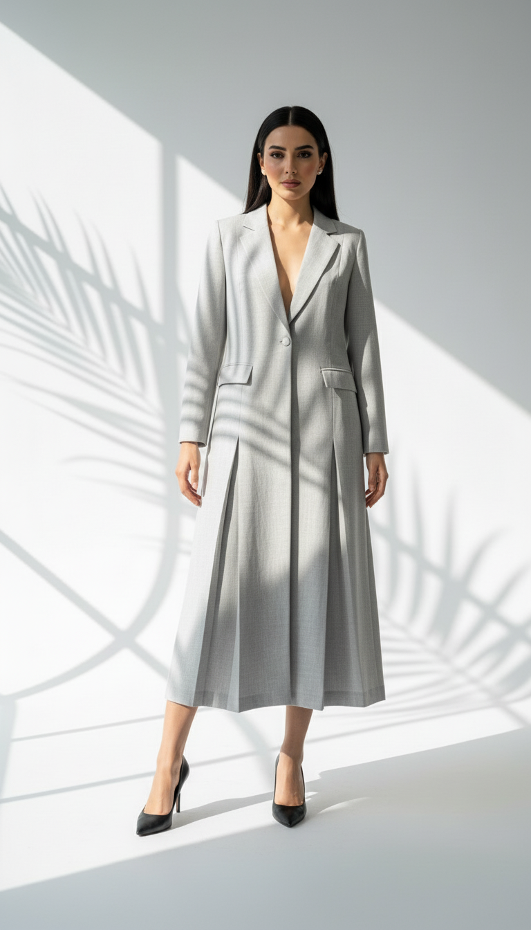 • تنورة طويلة مدمجة مع الجاكيت بشكل يبدو كقطعة واحدة أو كطقم متناسق.