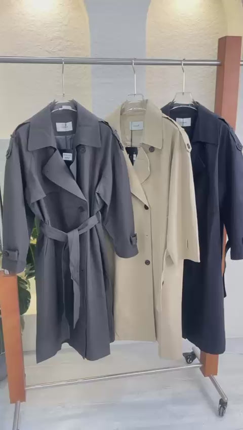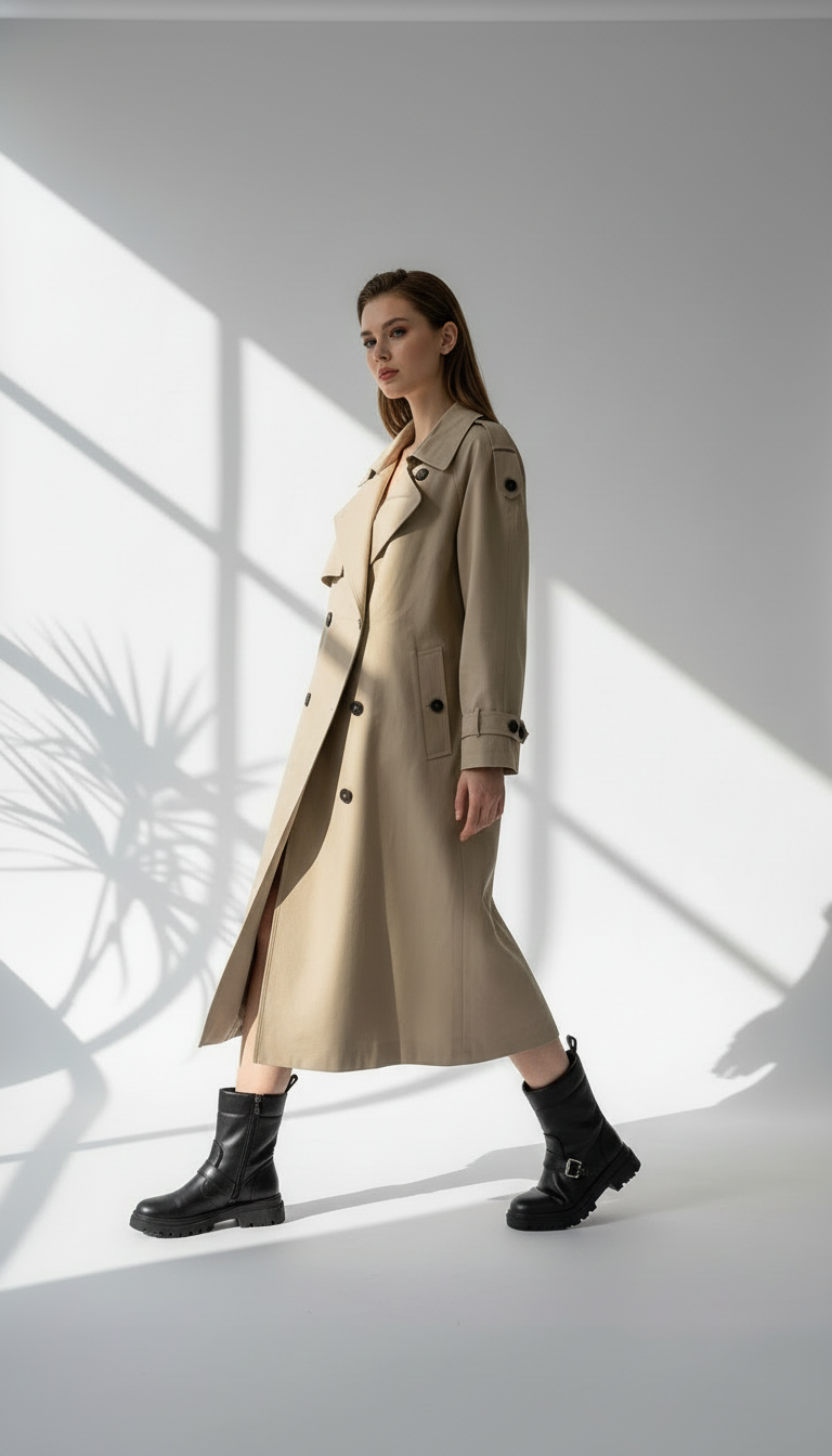 الستايل: معطف ترنش كوت (Trench Coat) كلاسيكي بطول كامل/متوسط.