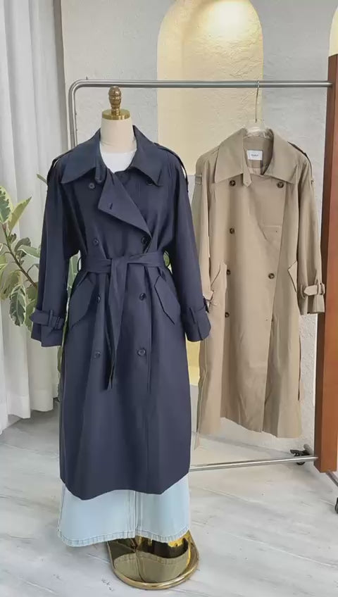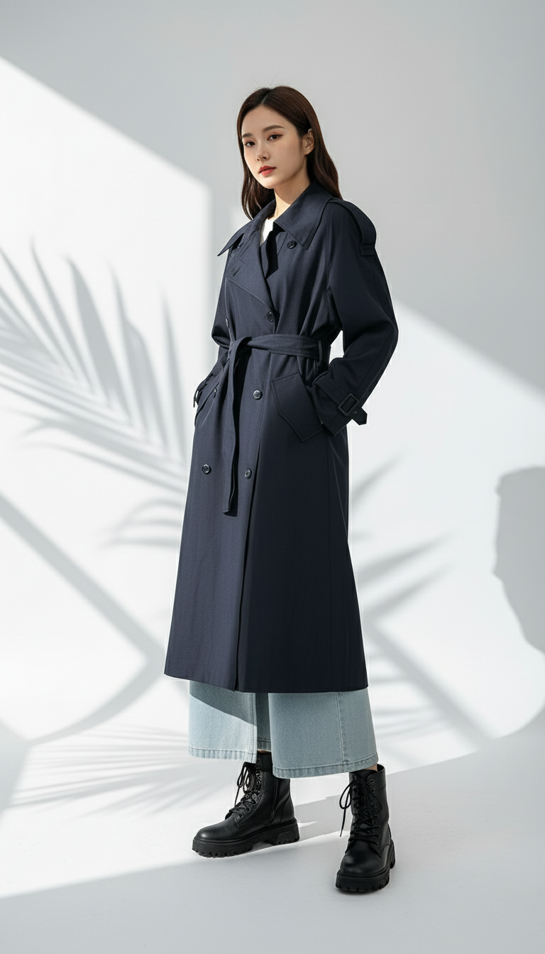 • حزام قماشي على الخصر لشدّ المعطف وإبراز الشكل.