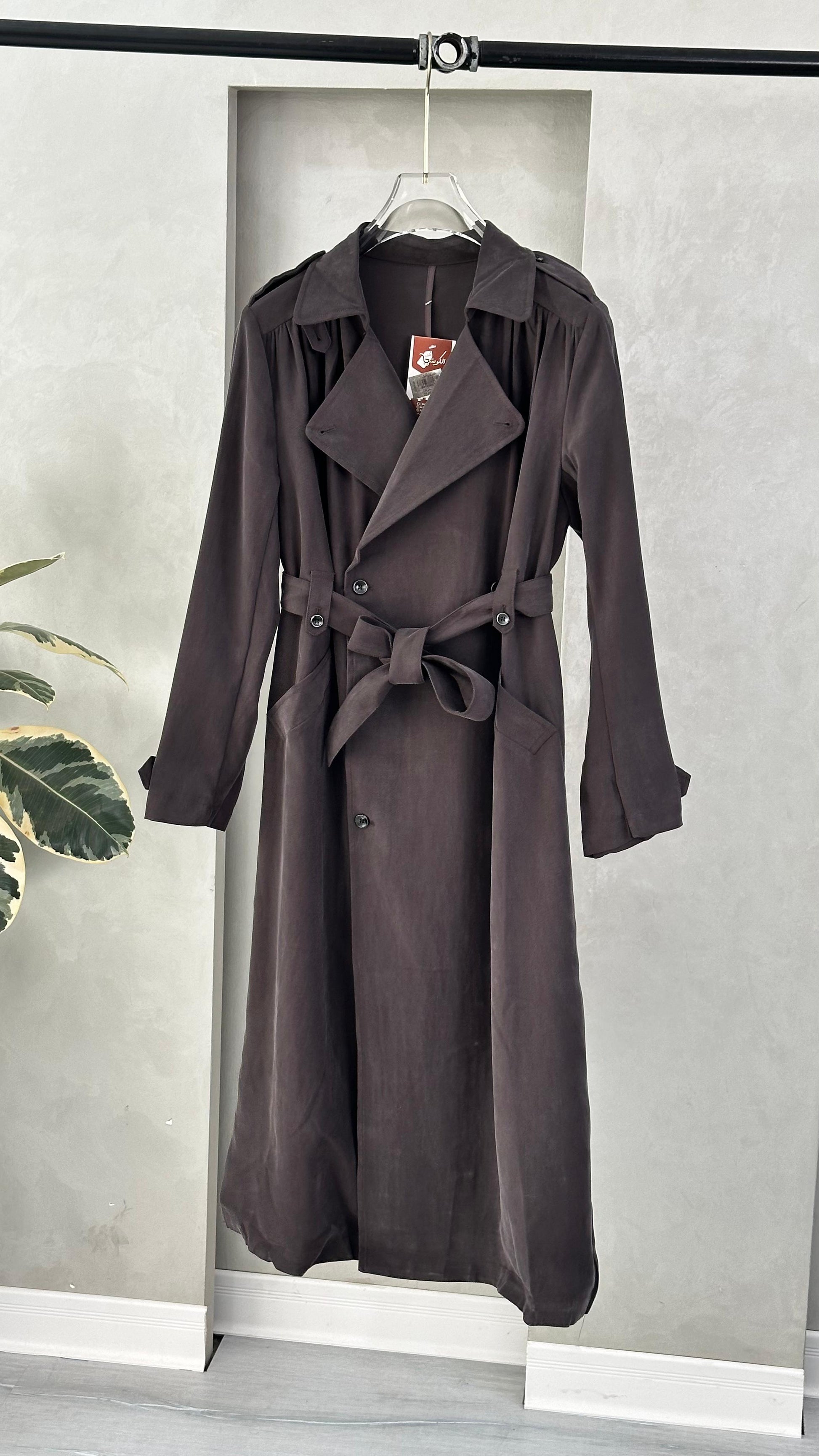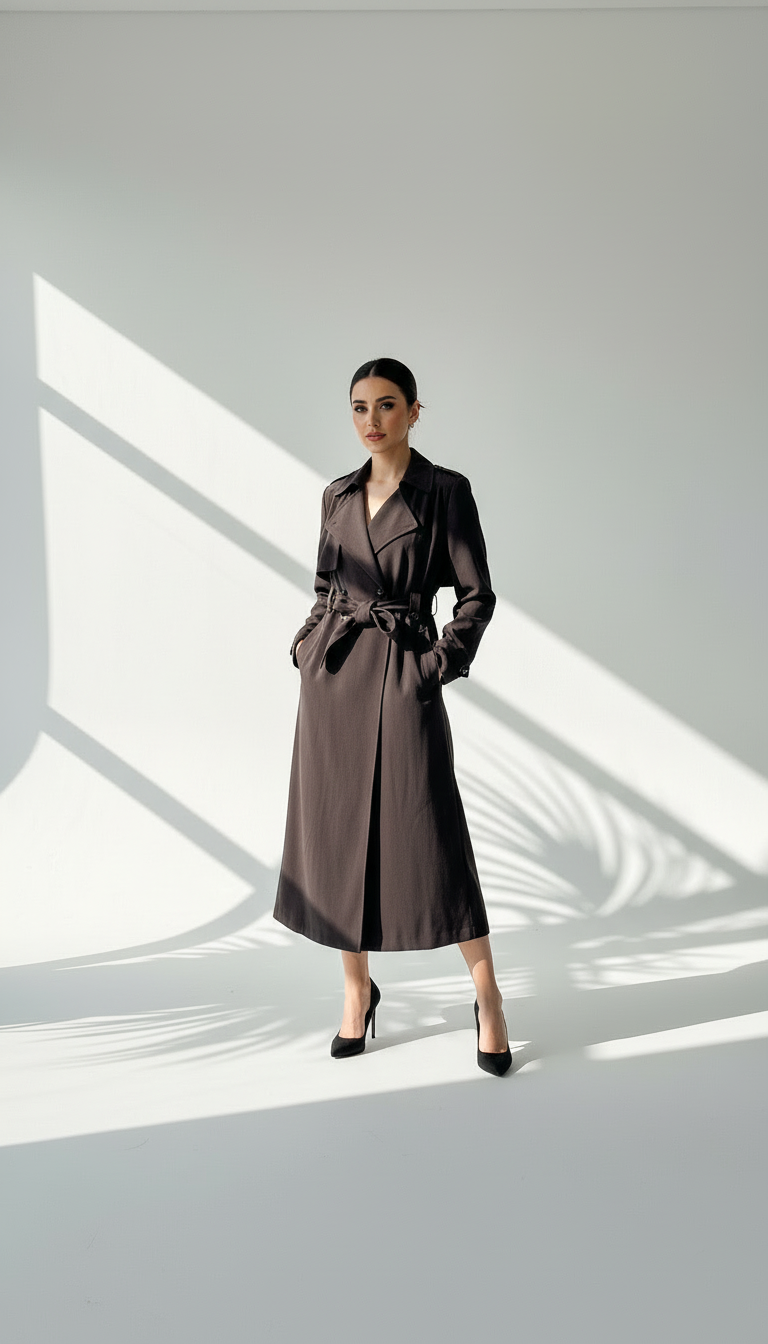 الشكل: معطف طويل وأنيق بأكمام طويلة، مصمم بقصة تحدد الخصر، ومعروض على عارضة أزياء بيضاء.