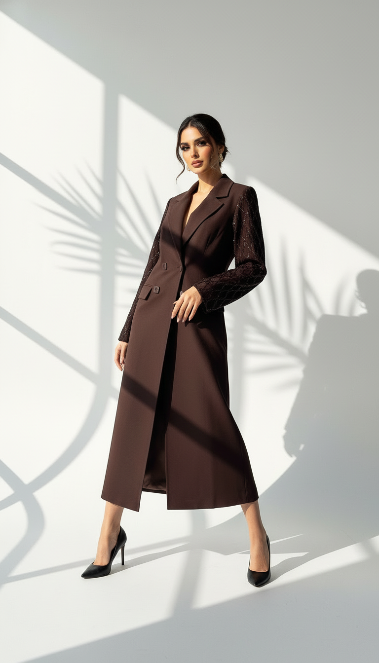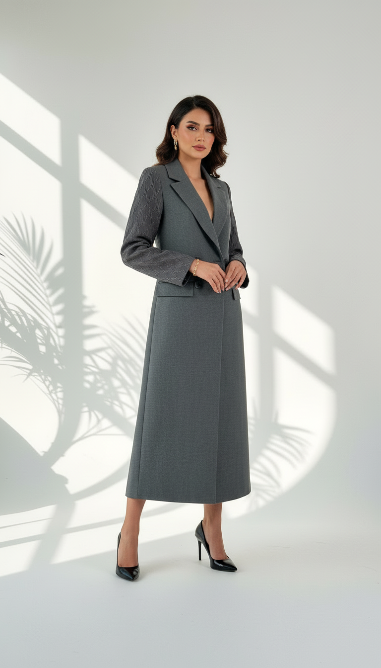 قصة مصممة: يتميز بقصة رسمية ومحددة (Tailored) تبرز أناقة الجسم وتناسب الإطلالات المتنوعة.