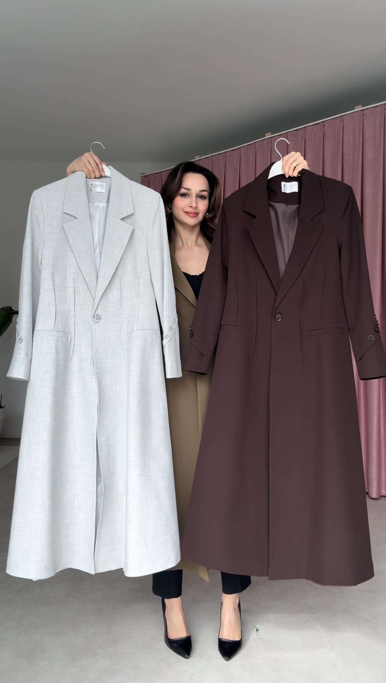 - **المعطف**: طويل، مزين بخطوط طولية دقيقة، ويتميز بقصة مستقيمة وانسيابية. يحتوي على ياقة بطيات كلاسيكية وأزرار أمامية، مما يمنحه طابعاً رسمياً أنيقاً. الأكمام طويلة، ويغطي المعطف كامل الجسم حتى أسفل الركبتين تقريباً.
