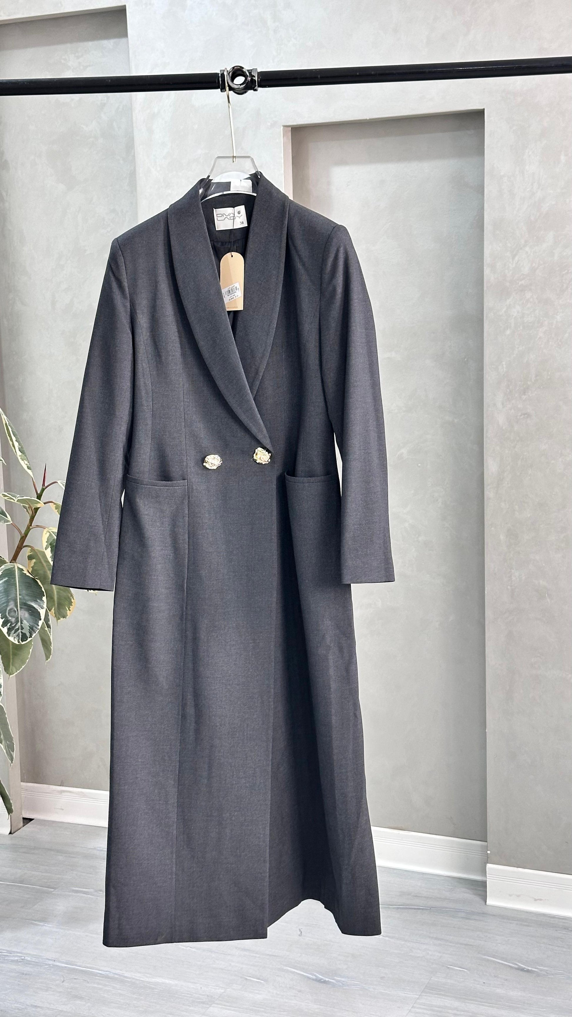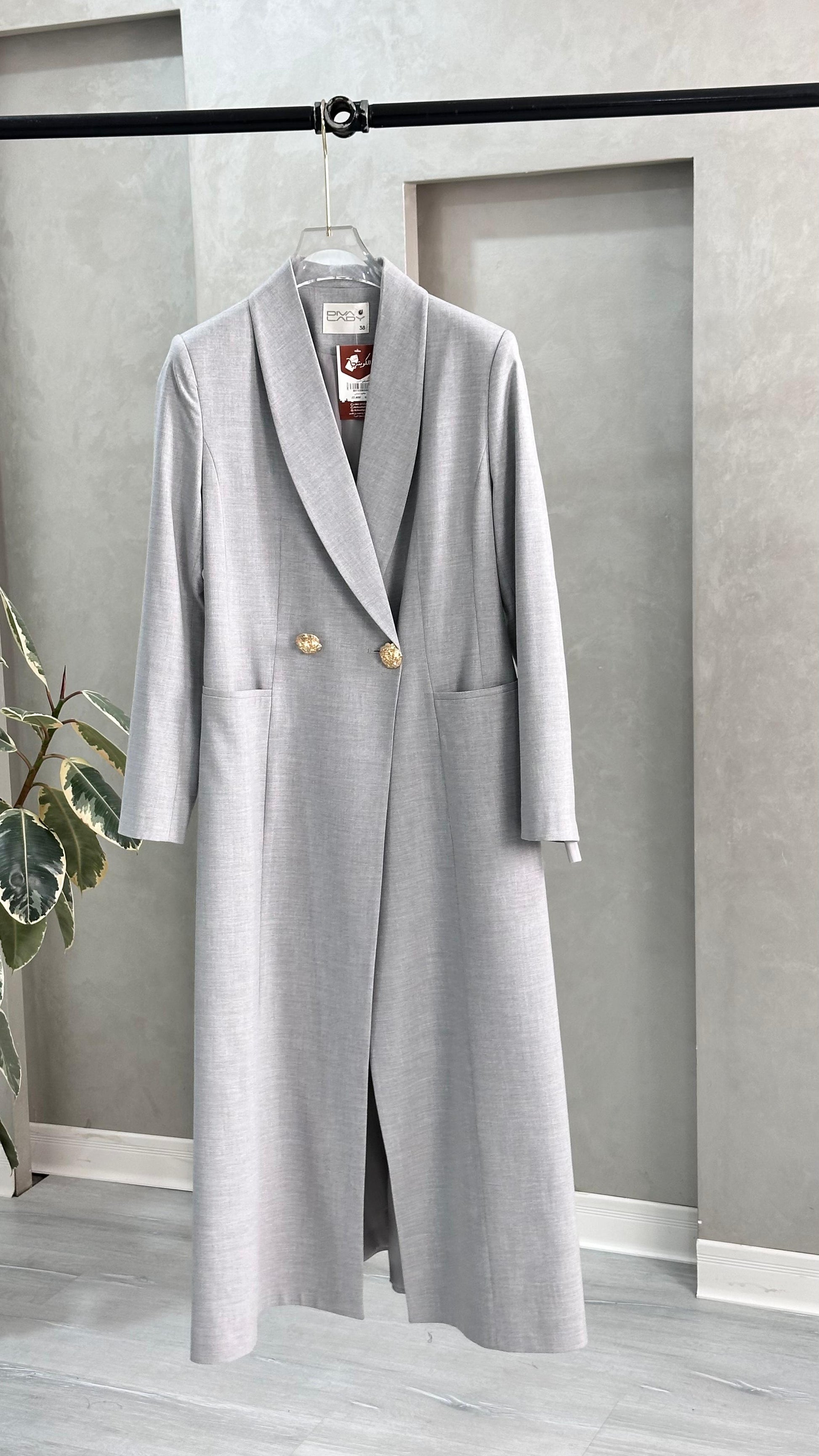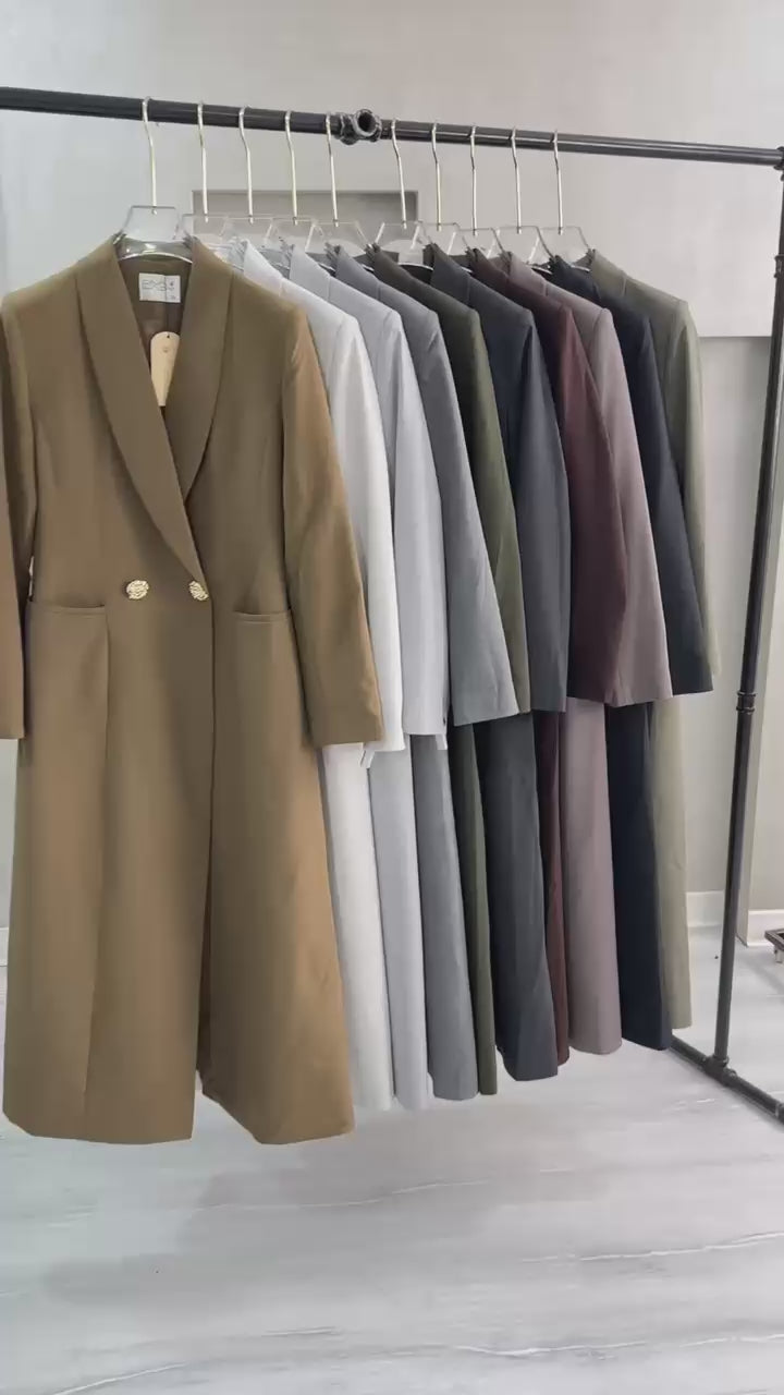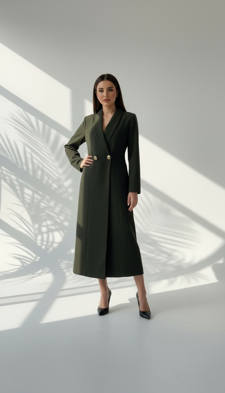 التصميم هو معطف طويل وقصة مستقيمة ومحددة عند الخصر، يتميز بصفين من الأزرار (تصميم مزدوج الصدر - Double-Breasted) و ياقة كلاسيكية واسعة. الأكمام طويلة. الخامة مصنوعة من نسيج عالي الجودة وذو قوام متماسك، يضمن مظهراً احترافياً وثابتاً. القصة مصممة لتكون قطعة علوية (Layering piece) فاخرة، وتُعد إضافة ضرورية تعكس اختياراتك الراقية والفريدة، ومناسبة للارتداء كمعطف في المناسبات الرسمية.