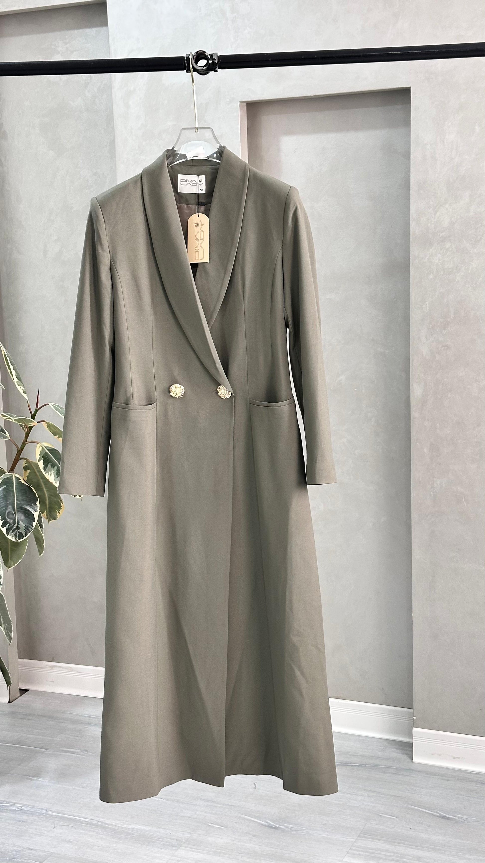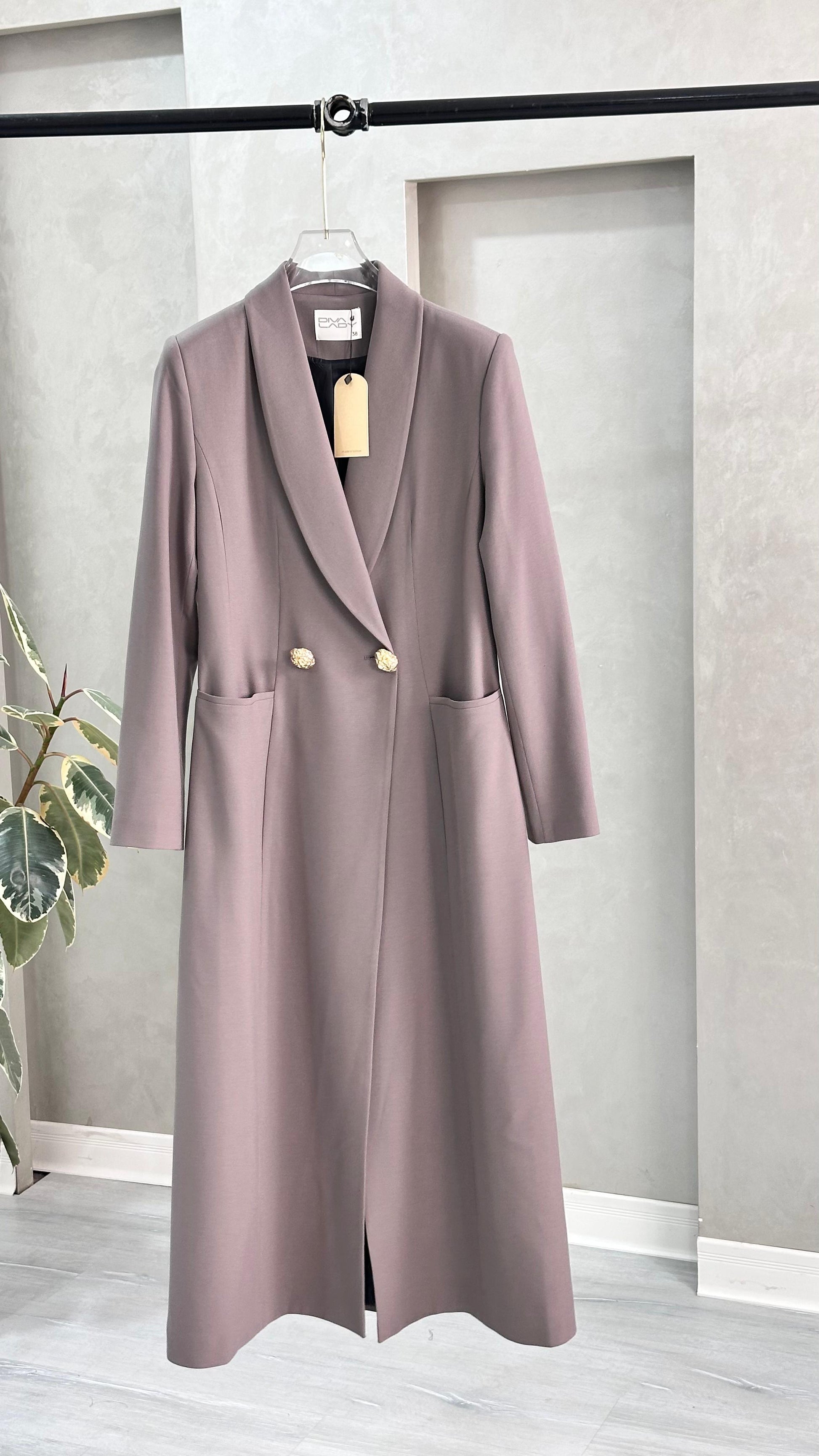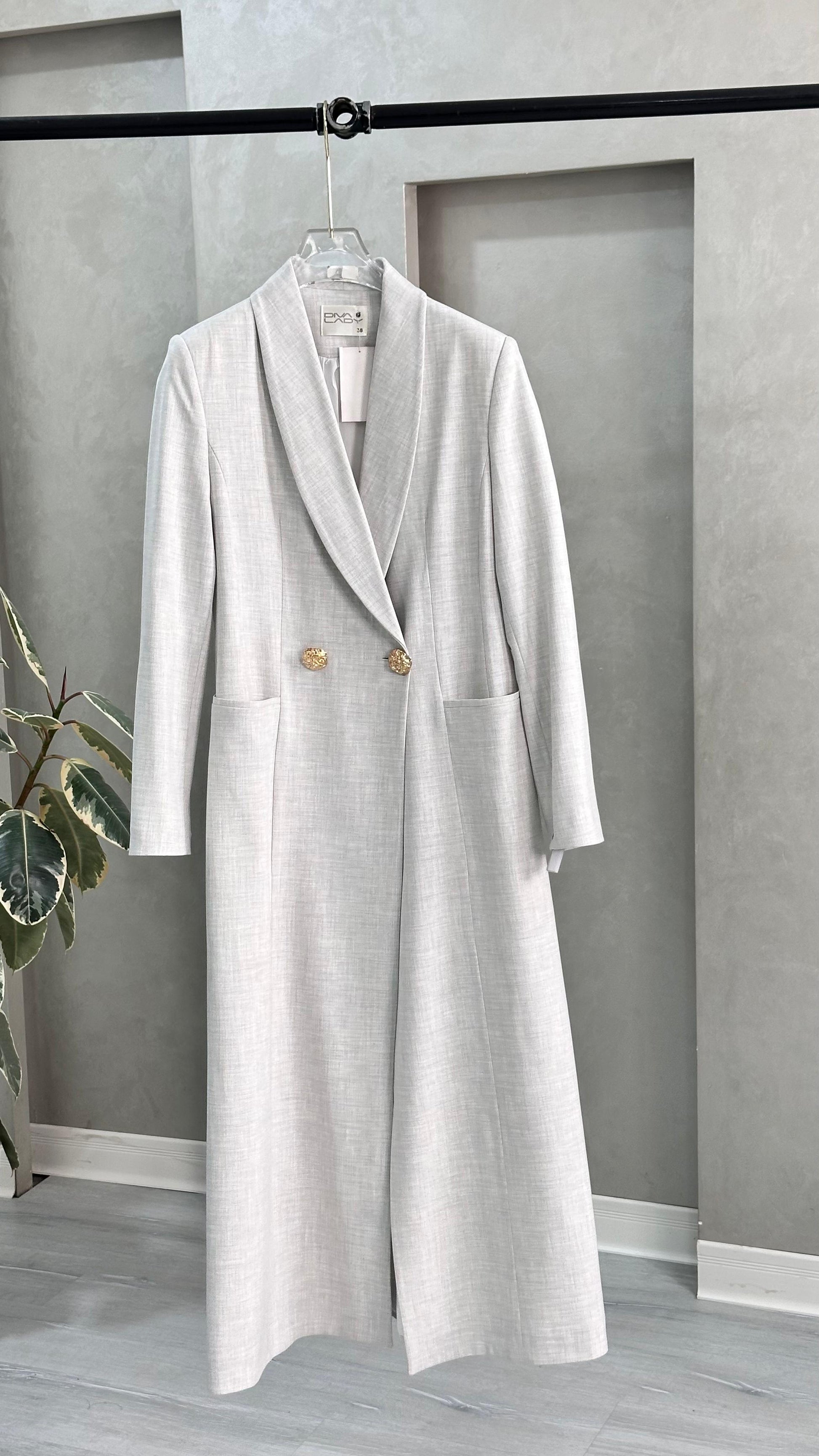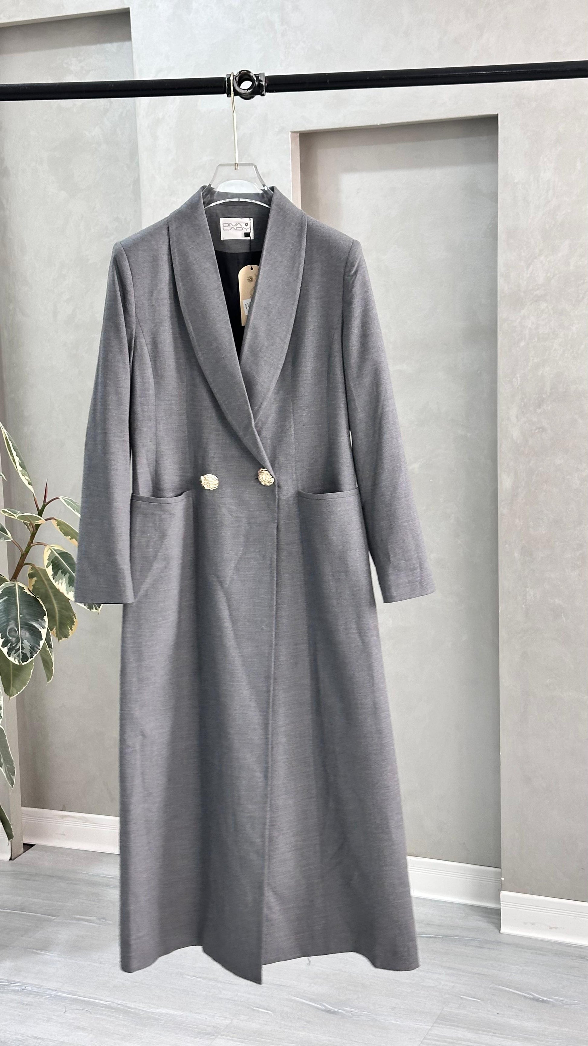 التصميم هو معطف طويل وقصة مستقيمة ومحددة عند الخصر، يتميز بصفين من الأزرار (تصميم مزدوج الصدر - Double-Breasted) و ياقة كلاسيكية واسعة. الأكمام طويلة. الخامة مصنوعة من نسيج عالي الجودة وذو قوام متماسك، يضمن مظهراً احترافياً وثابتاً. القصة مصممة لتكون قطعة علوية (Layering piece) فاخرة، وتُعد إضافة ضرورية تعكس اختياراتك الراقية والفريدة، ومناسبة للارتداء كمعطف في المناسبات الرسمية.
