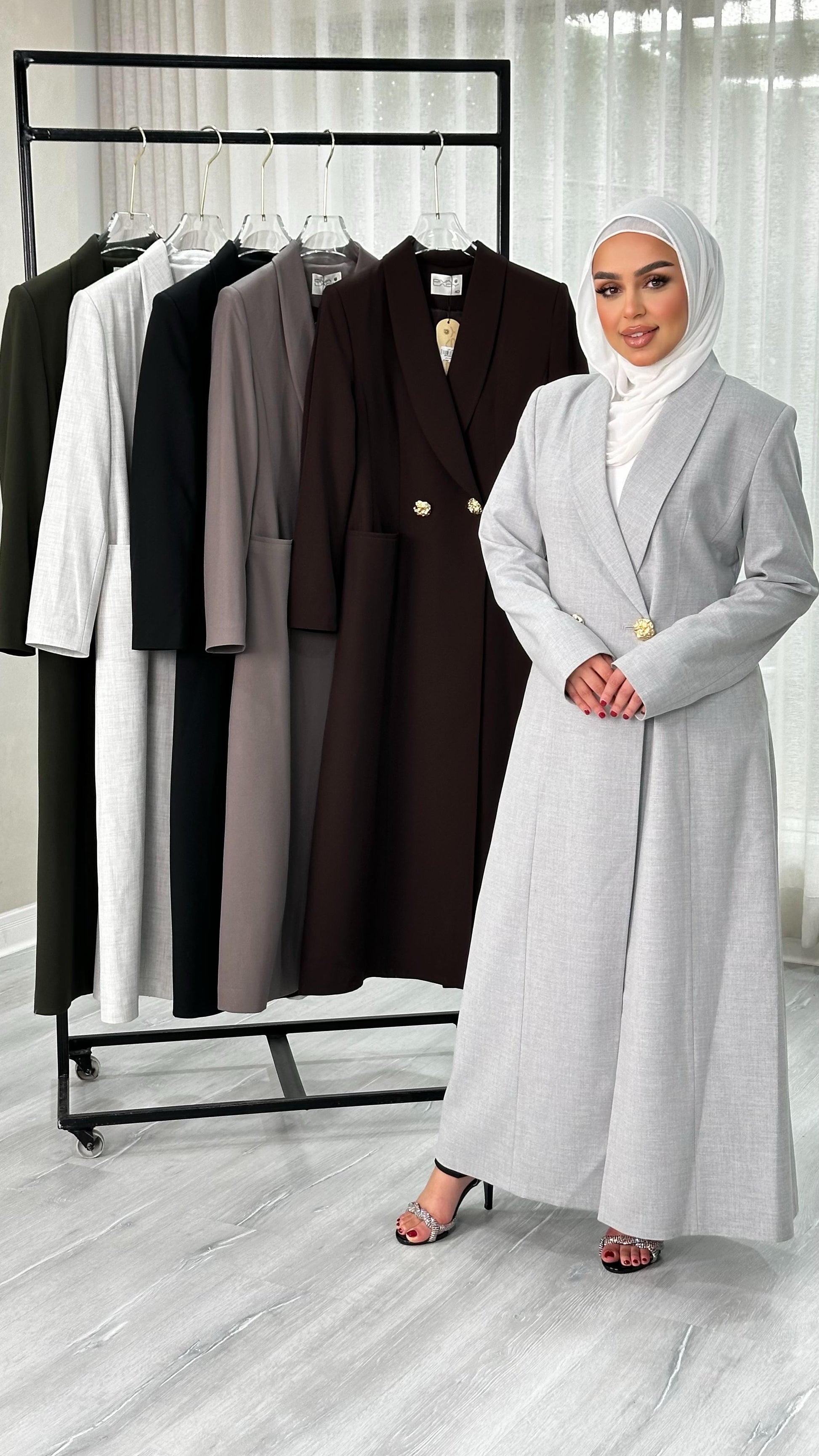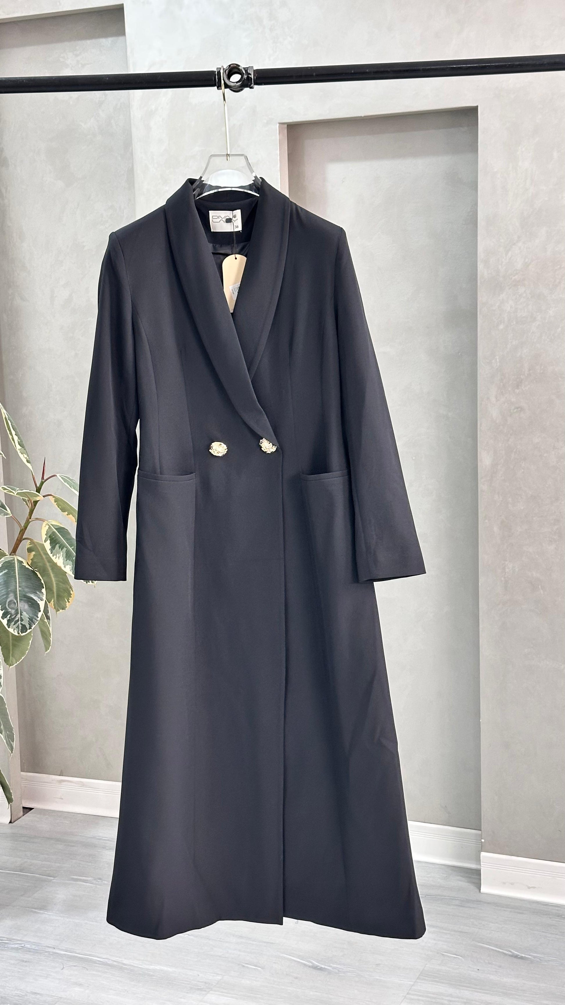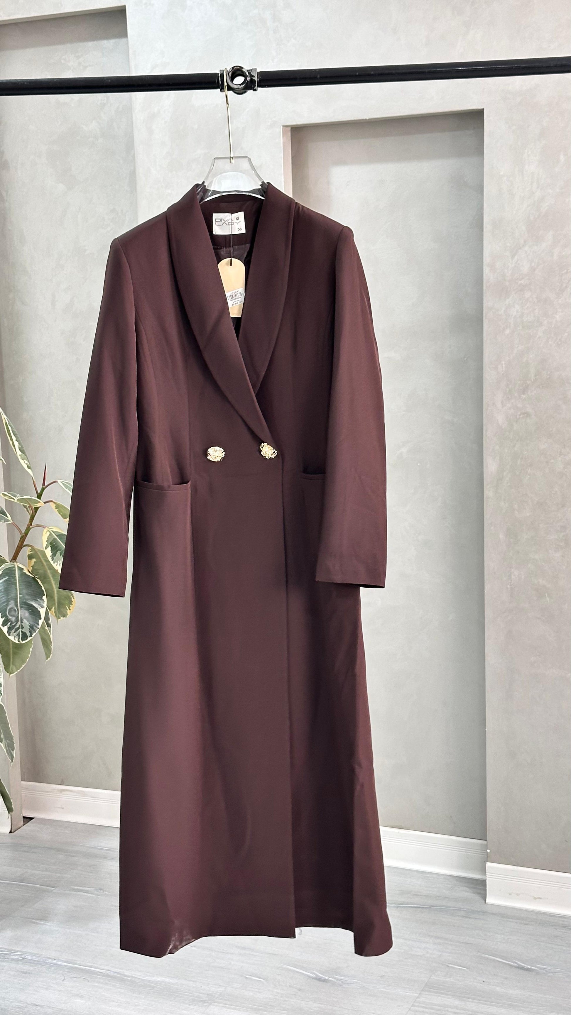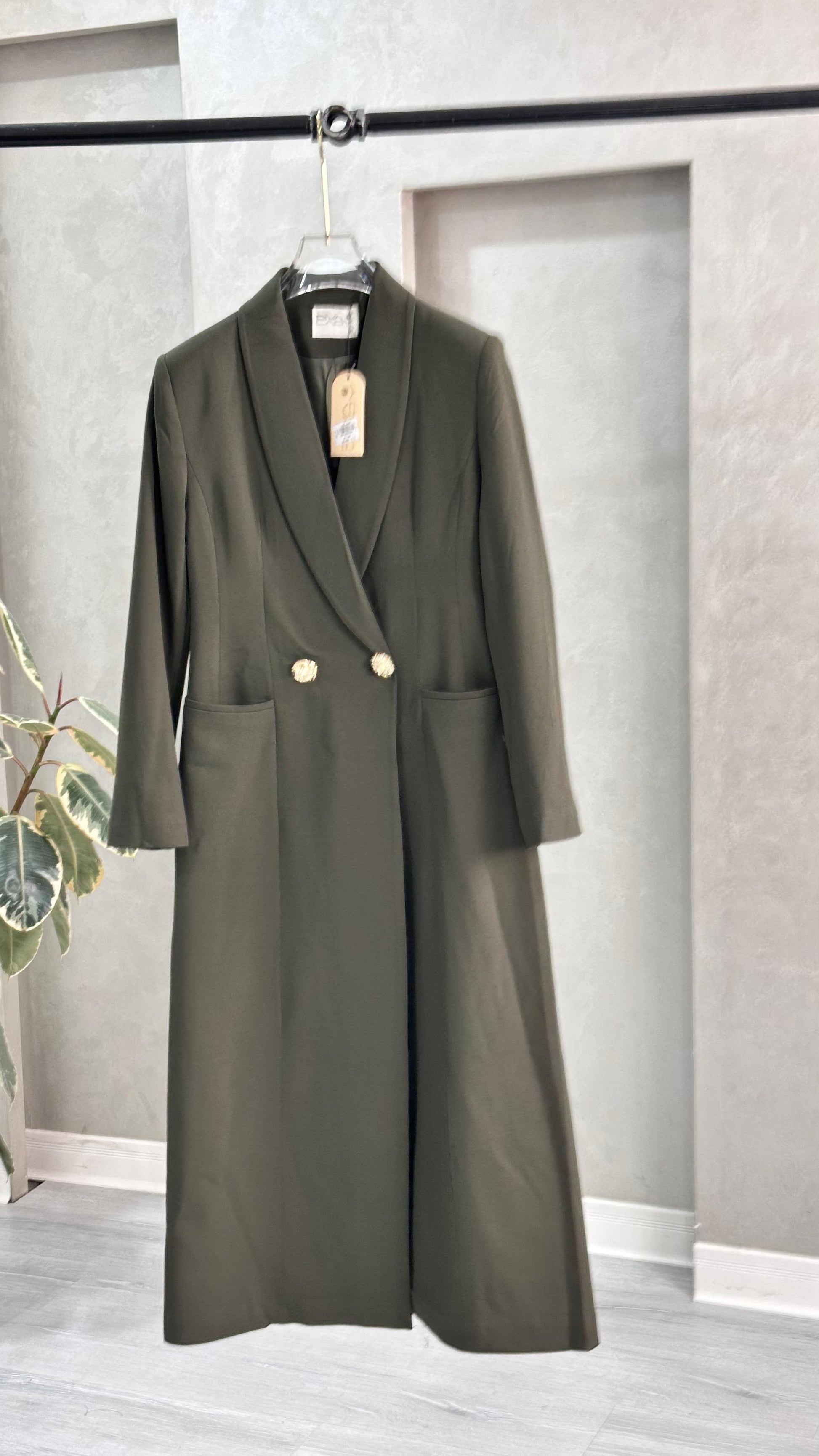 التصميم هو معطف طويل وقصة مستقيمة ومحددة عند الخصر، يتميز بصفين من الأزرار (تصميم مزدوج الصدر - Double-Breasted) و ياقة كلاسيكية واسعة. الأكمام طويلة. الخامة مصنوعة من نسيج عالي الجودة وذو قوام متماسك، يضمن مظهراً احترافياً وثابتاً. القصة مصممة لتكون قطعة علوية (Layering piece) فاخرة، وتُعد إضافة ضرورية تعكس اختياراتك الراقية والفريدة، ومناسبة للارتداء كمعطف في المناسبات الرسمية.