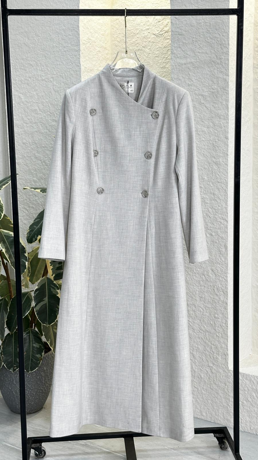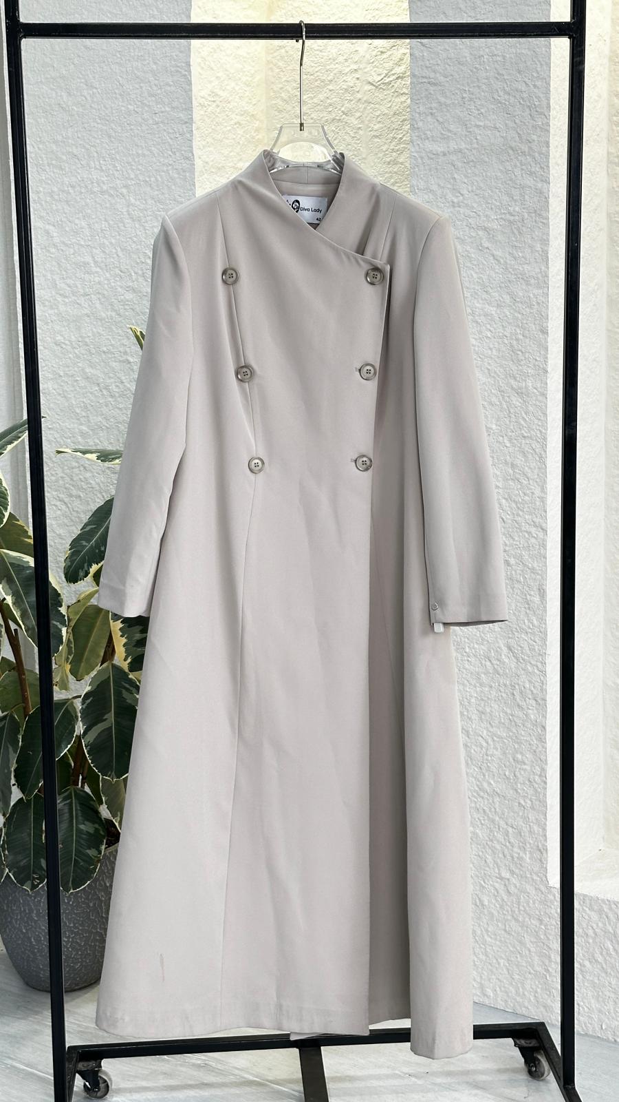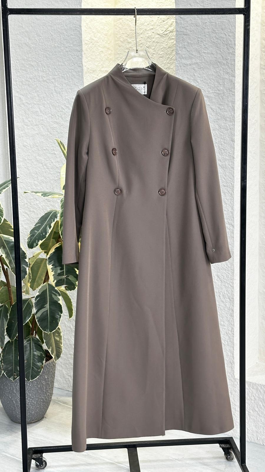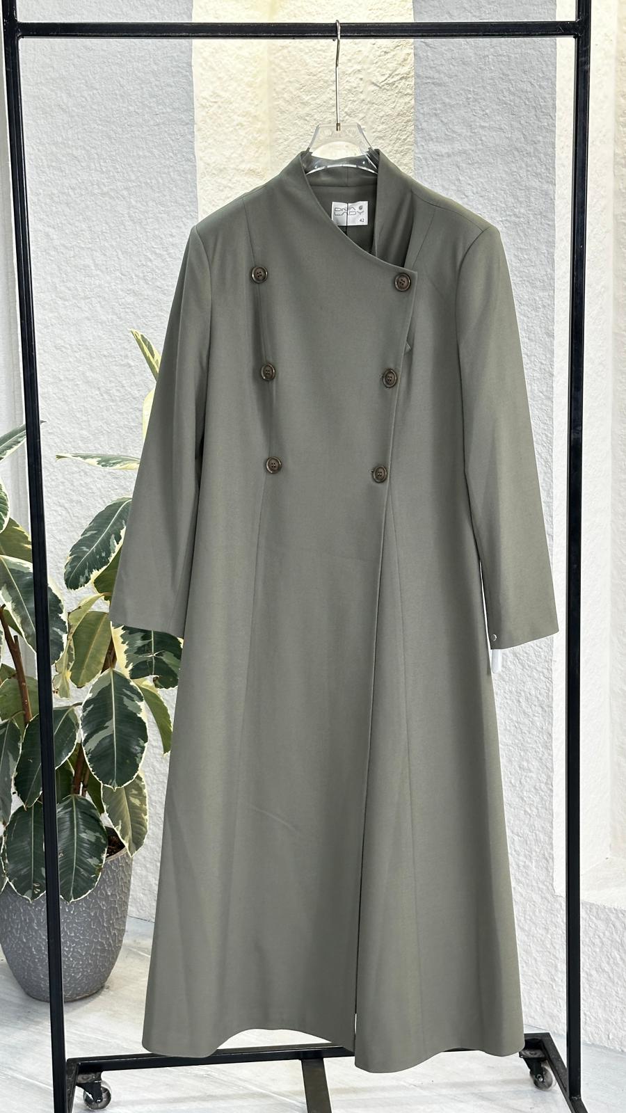 التصميم هو معطف طويل وقصة مستقيمة، يتميز بصفين من الأزرار (تصميم مزدوج الصدر - Double-Breasted) و ياقة كلاسيكية واسعة. الأكمام طويلة. يتميز بتصميم فضفاض قليلاً، مما يمنحه مظهراً رسمياً ولكن أنيقاً ومريحاً. الخامة مصنوعة من نسيج سميك عالي الجودة وذو قوام متماسك، يضمن مظهراً احترافياً وثابتاً. المزايا هي قطعة علوية (Layering piece) راقية، وتُعد إضافة ضرورية تعكس اختياراتك الراقية والفريدة، ومناسبة للارتداء في المناسبات الرسمية.