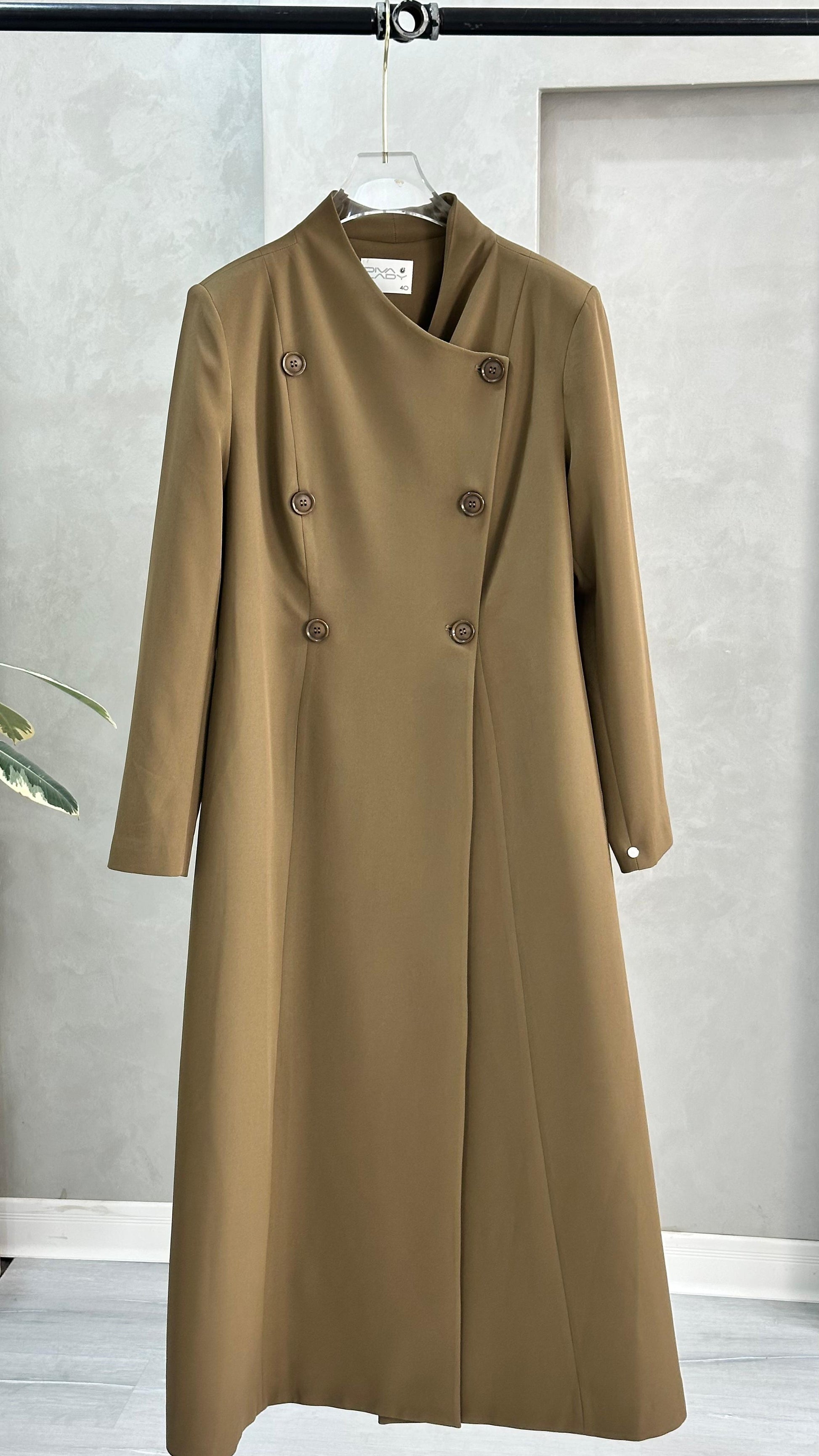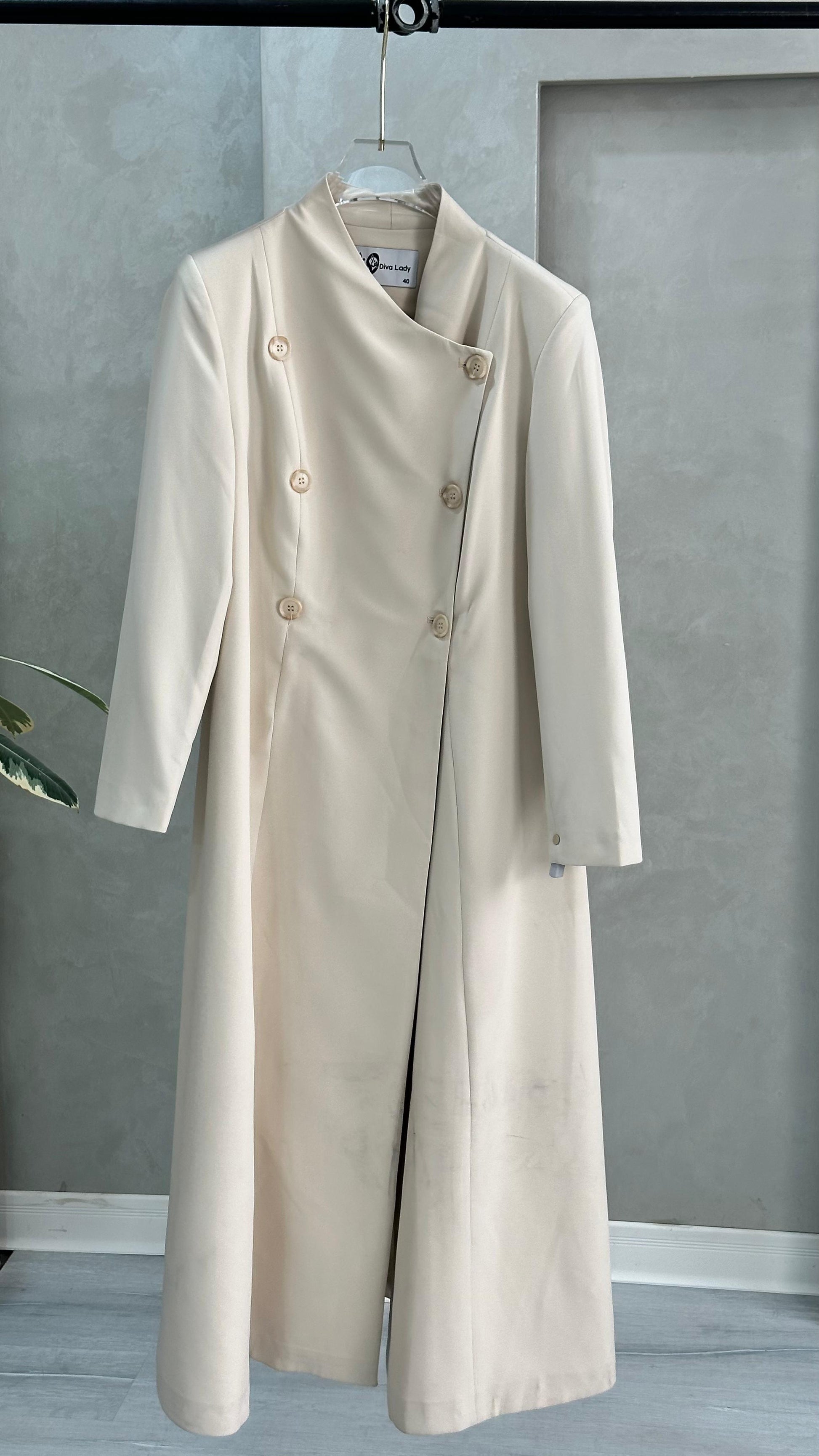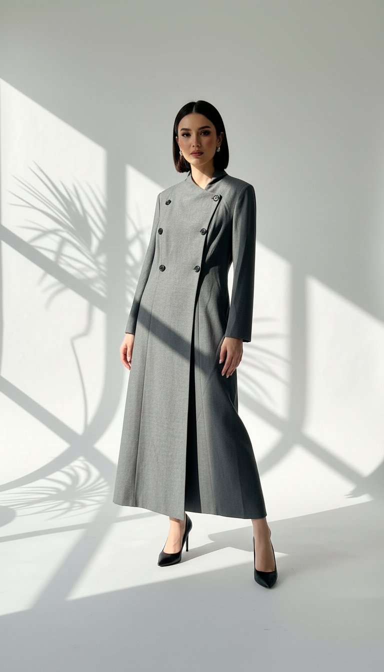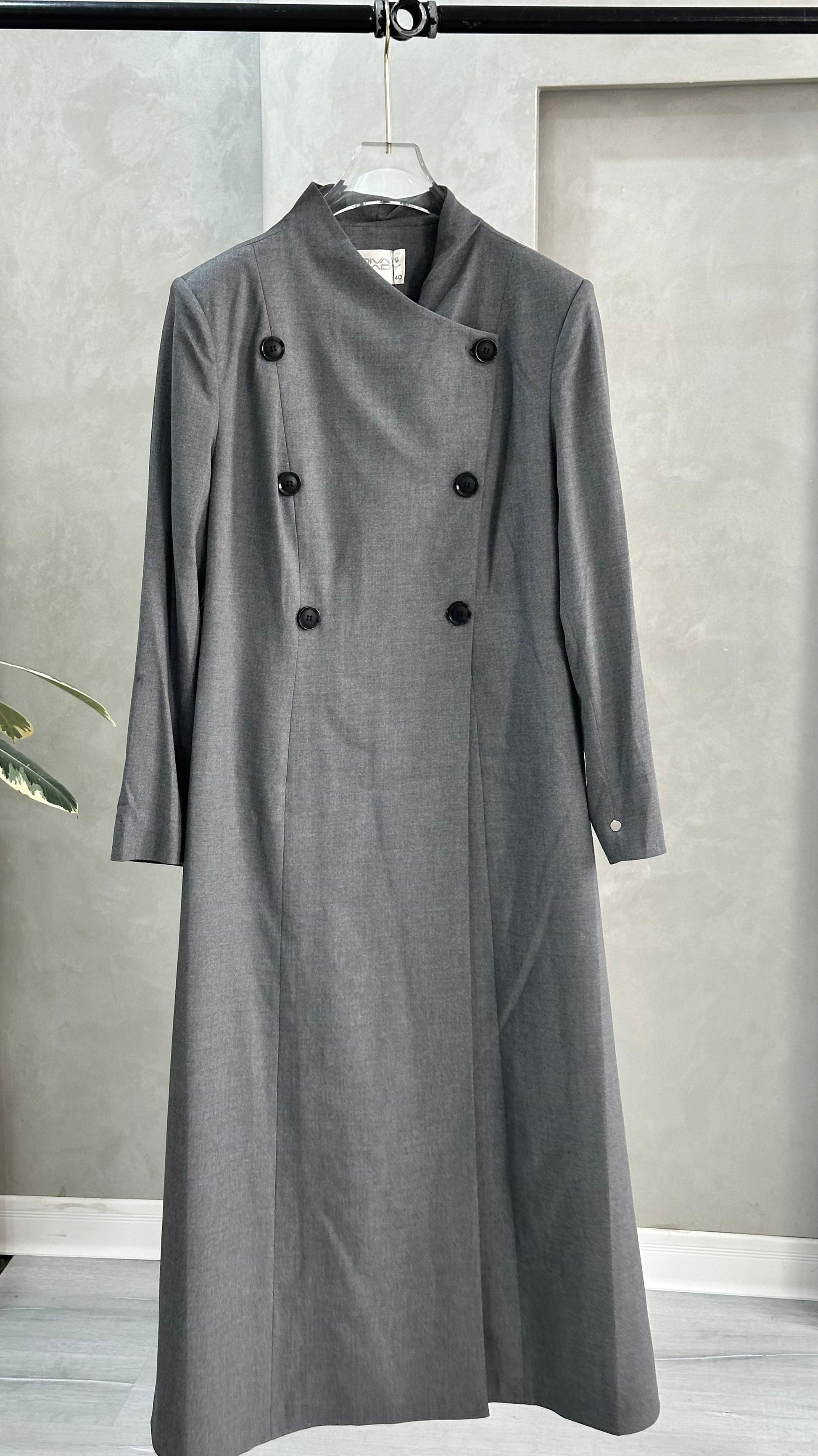 التصميم هو معطف طويل وقصة مستقيمة، يتميز بصفين من الأزرار (تصميم مزدوج الصدر - Double-Breasted) و ياقة كلاسيكية واسعة. الأكمام طويلة. يتميز بتصميم فضفاض قليلاً، مما يمنحه مظهراً رسمياً ولكن أنيقاً ومريحاً. الخامة مصنوعة من نسيج سميك عالي الجودة وذو قوام متماسك، يضمن مظهراً احترافياً وثابتاً. المزايا هي قطعة علوية (Layering piece) راقية، وتُعد إضافة ضرورية تعكس اختياراتك الراقية والفريدة، ومناسبة للارتداء في المناسبات الرسمية.