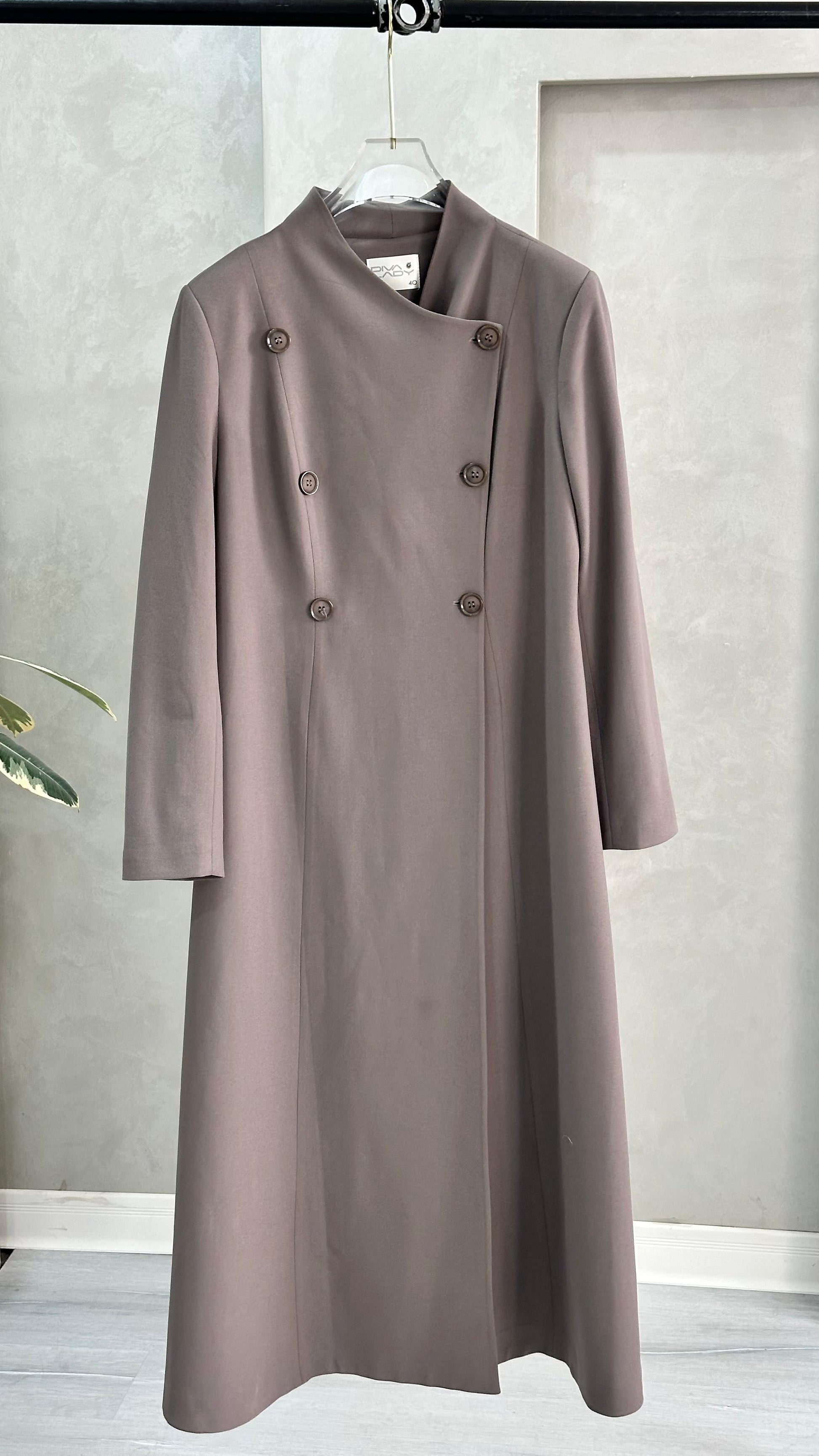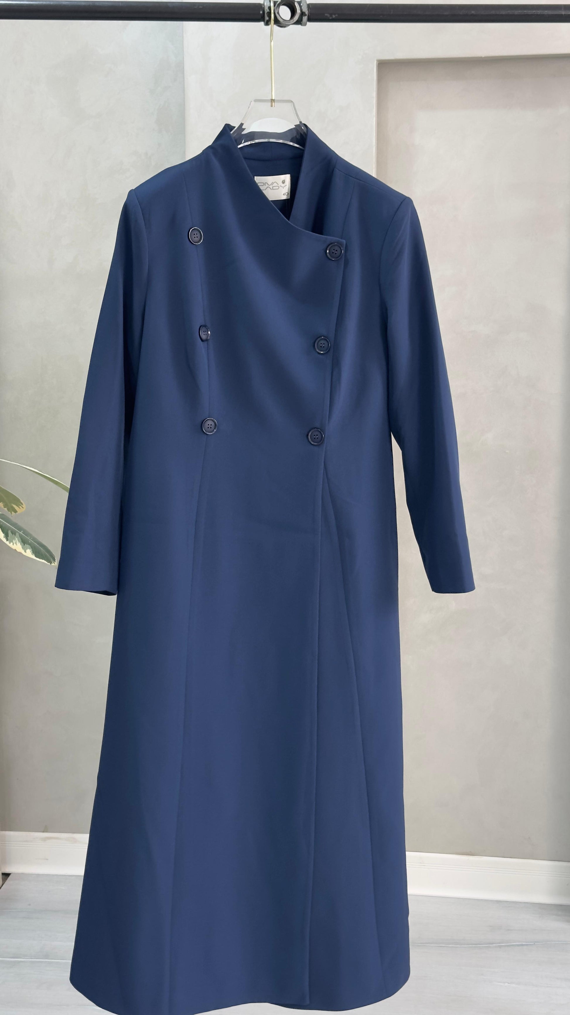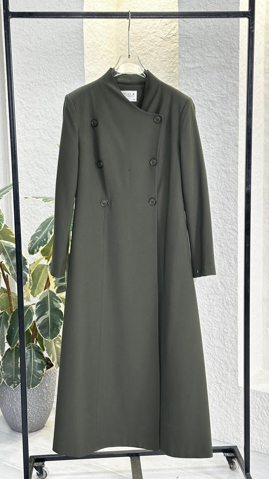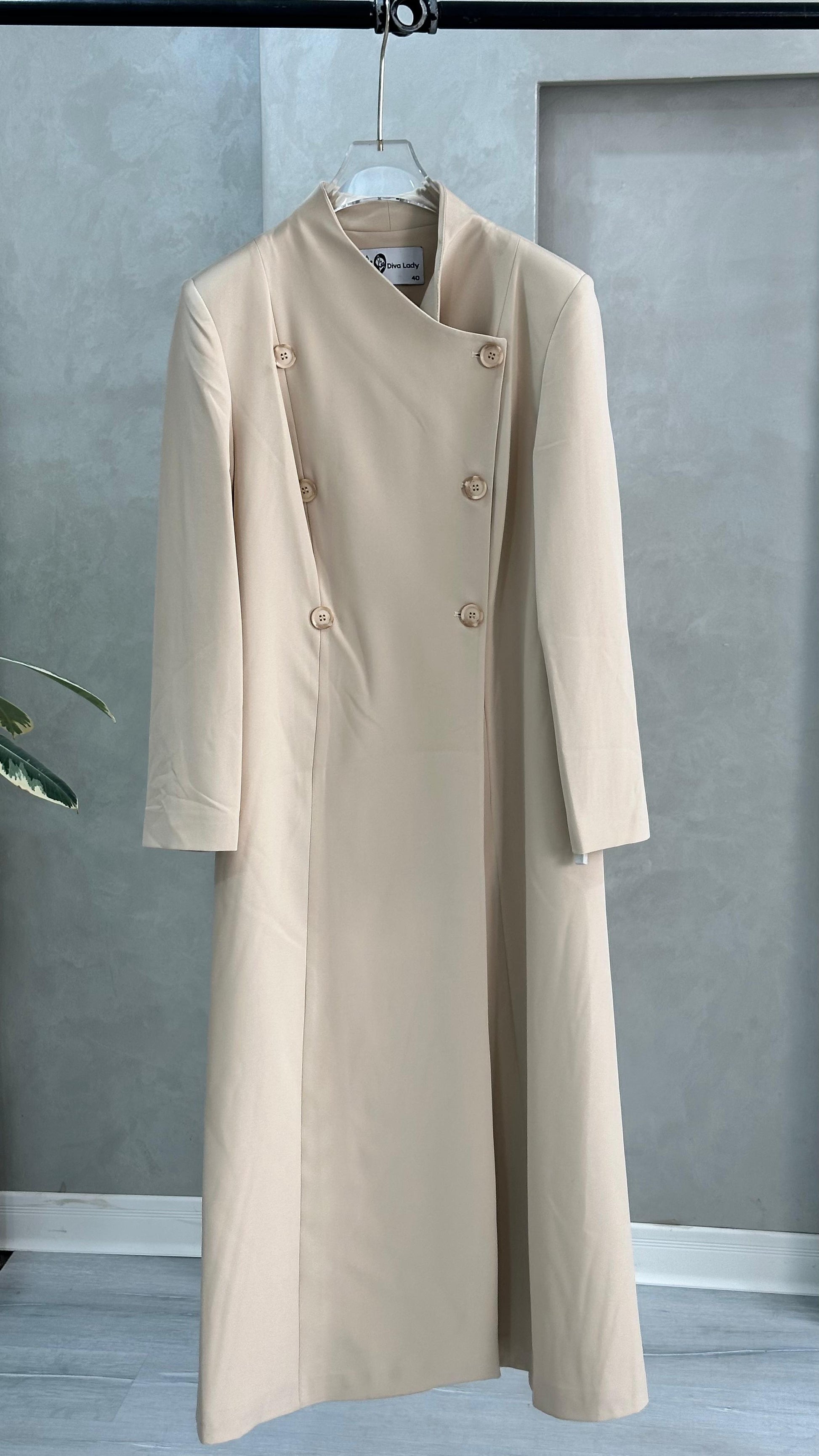التصميم هو معطف طويل وقصة مستقيمة، يتميز بصفين من الأزرار (تصميم مزدوج الصدر - Double-Breasted) و ياقة كلاسيكية واسعة. الأكمام طويلة. يتميز بتصميم فضفاض قليلاً، مما يمنحه مظهراً رسمياً ولكن أنيقاً ومريحاً. الخامة مصنوعة من نسيج سميك عالي الجودة وذو قوام متماسك، يضمن مظهراً احترافياً وثابتاً. المزايا هي قطعة علوية (Layering piece) راقية، وتُعد إضافة ضرورية تعكس اختياراتك الراقية والفريدة، ومناسبة للارتداء في المناسبات الرسمية.