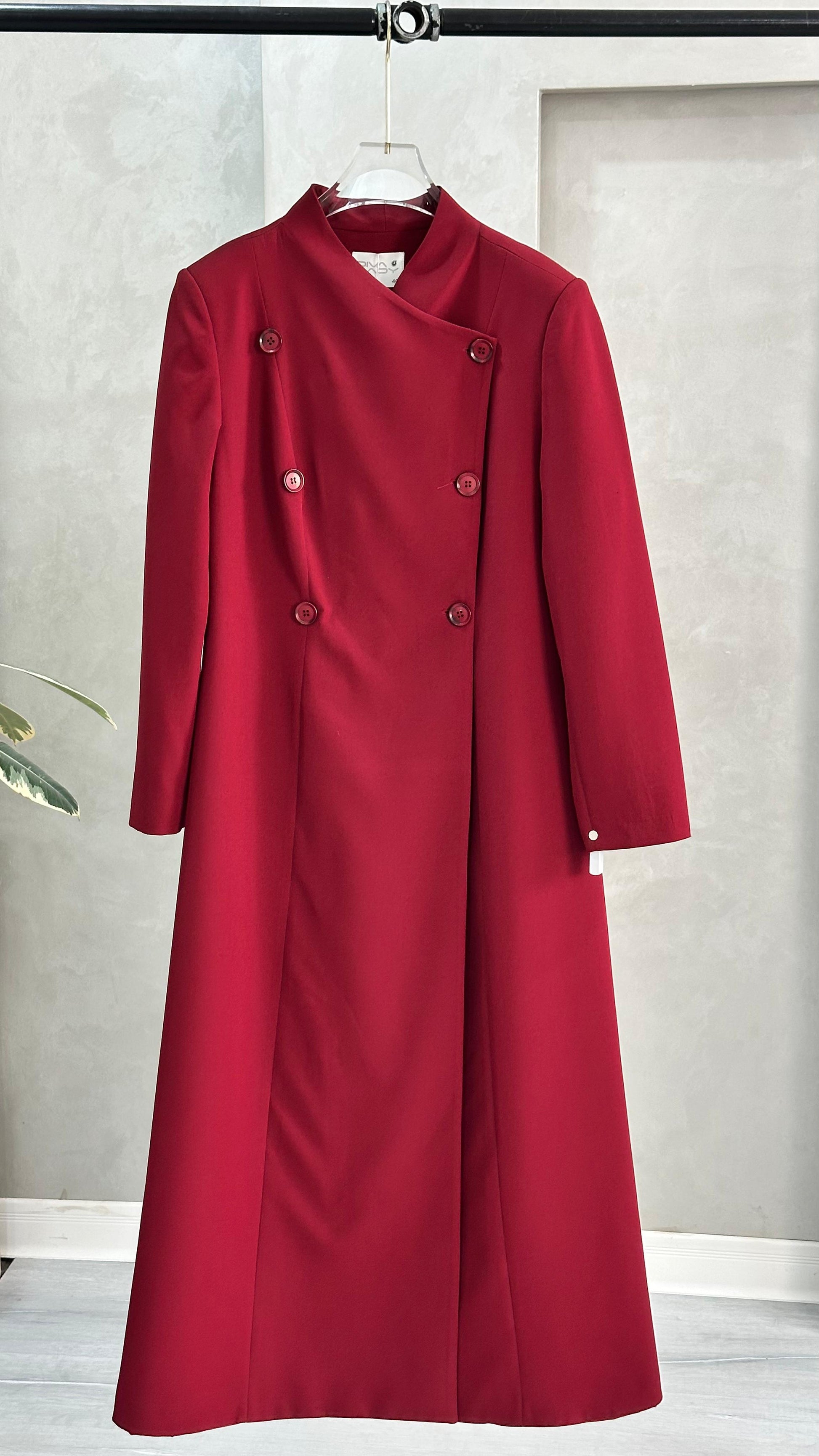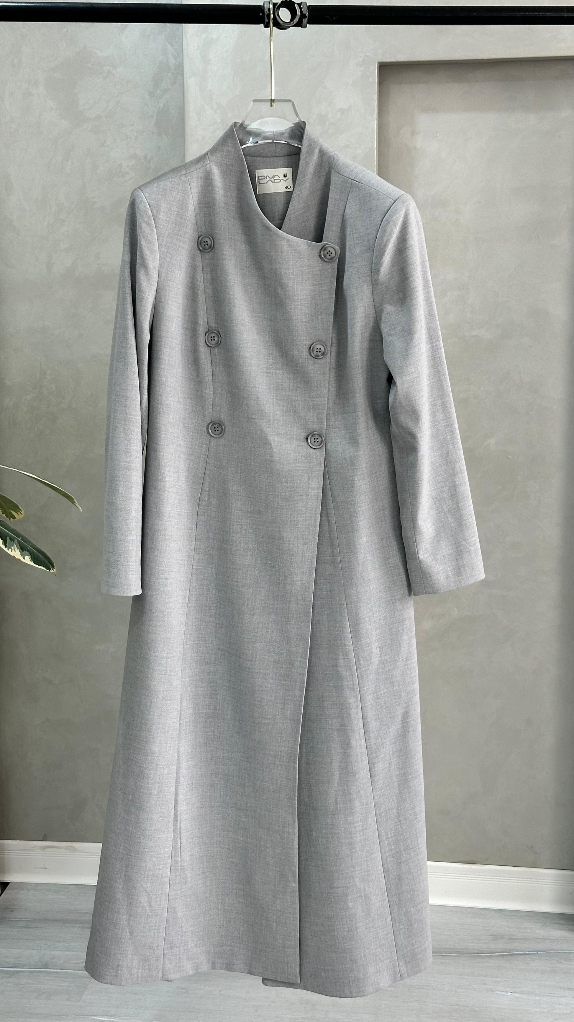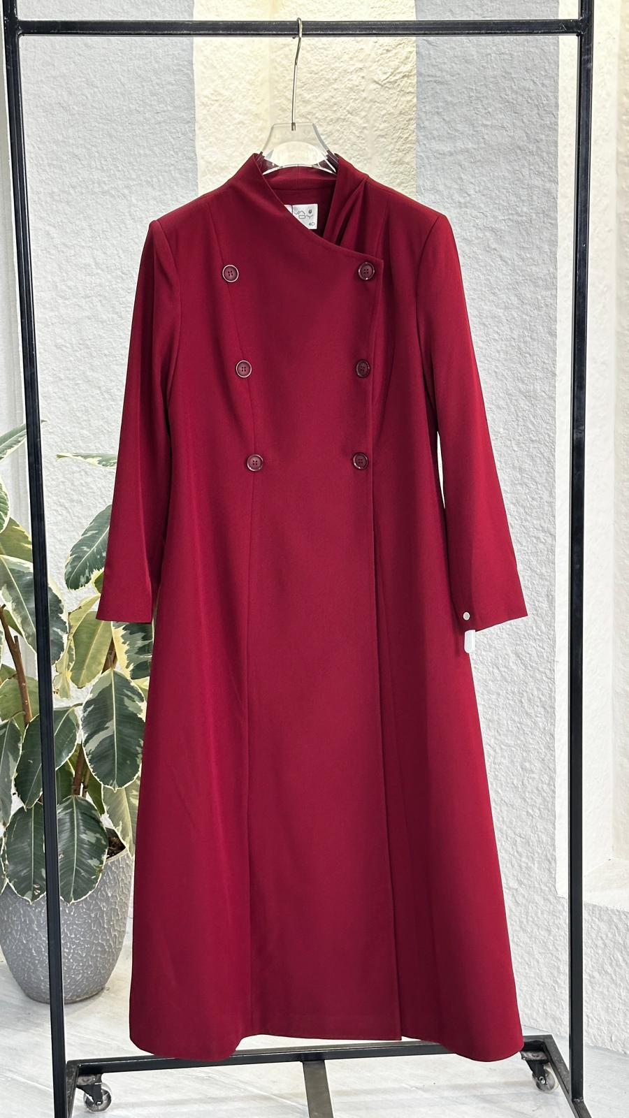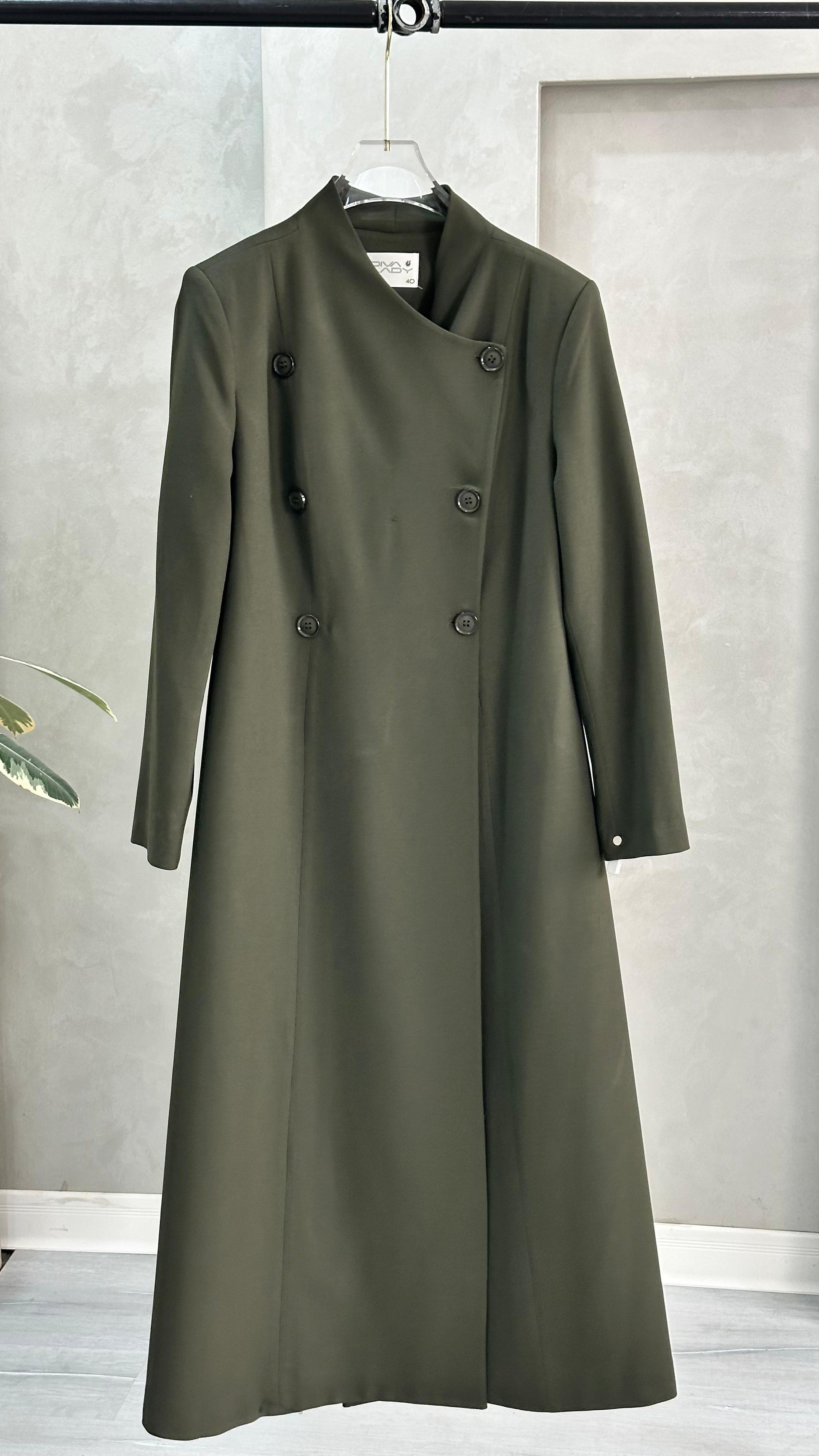 التصميم هو معطف طويل وقصة مستقيمة، يتميز بصفين من الأزرار (تصميم مزدوج الصدر - Double-Breasted) و ياقة كلاسيكية واسعة. الأكمام طويلة. يتميز بتصميم فضفاض قليلاً، مما يمنحه مظهراً رسمياً ولكن أنيقاً ومريحاً. الخامة مصنوعة من نسيج سميك عالي الجودة وذو قوام متماسك، يضمن مظهراً احترافياً وثابتاً. المزايا هي قطعة علوية (Layering piece) راقية، وتُعد إضافة ضرورية تعكس اختياراتك الراقية والفريدة، ومناسبة للارتداء في المناسبات الرسمية.