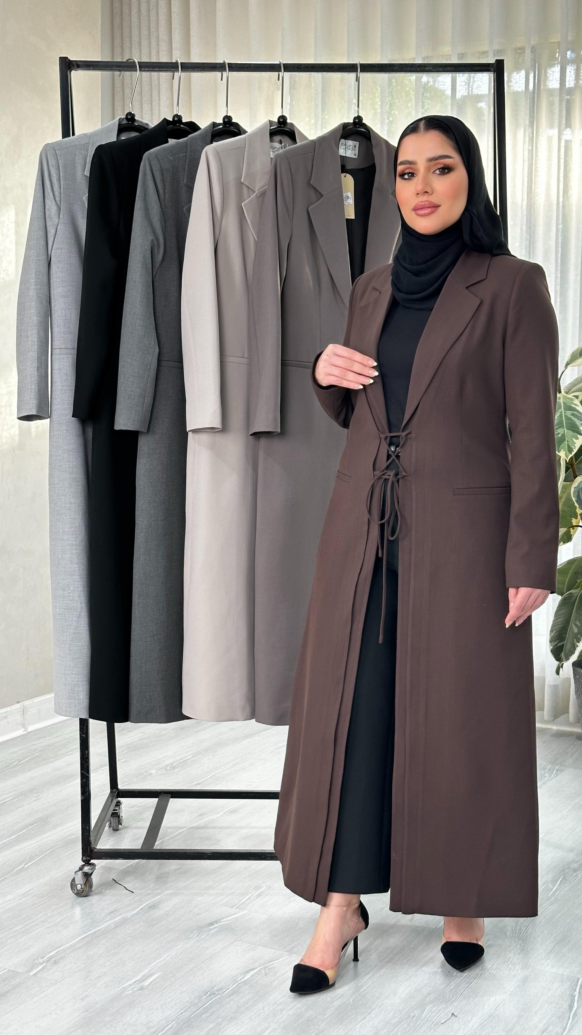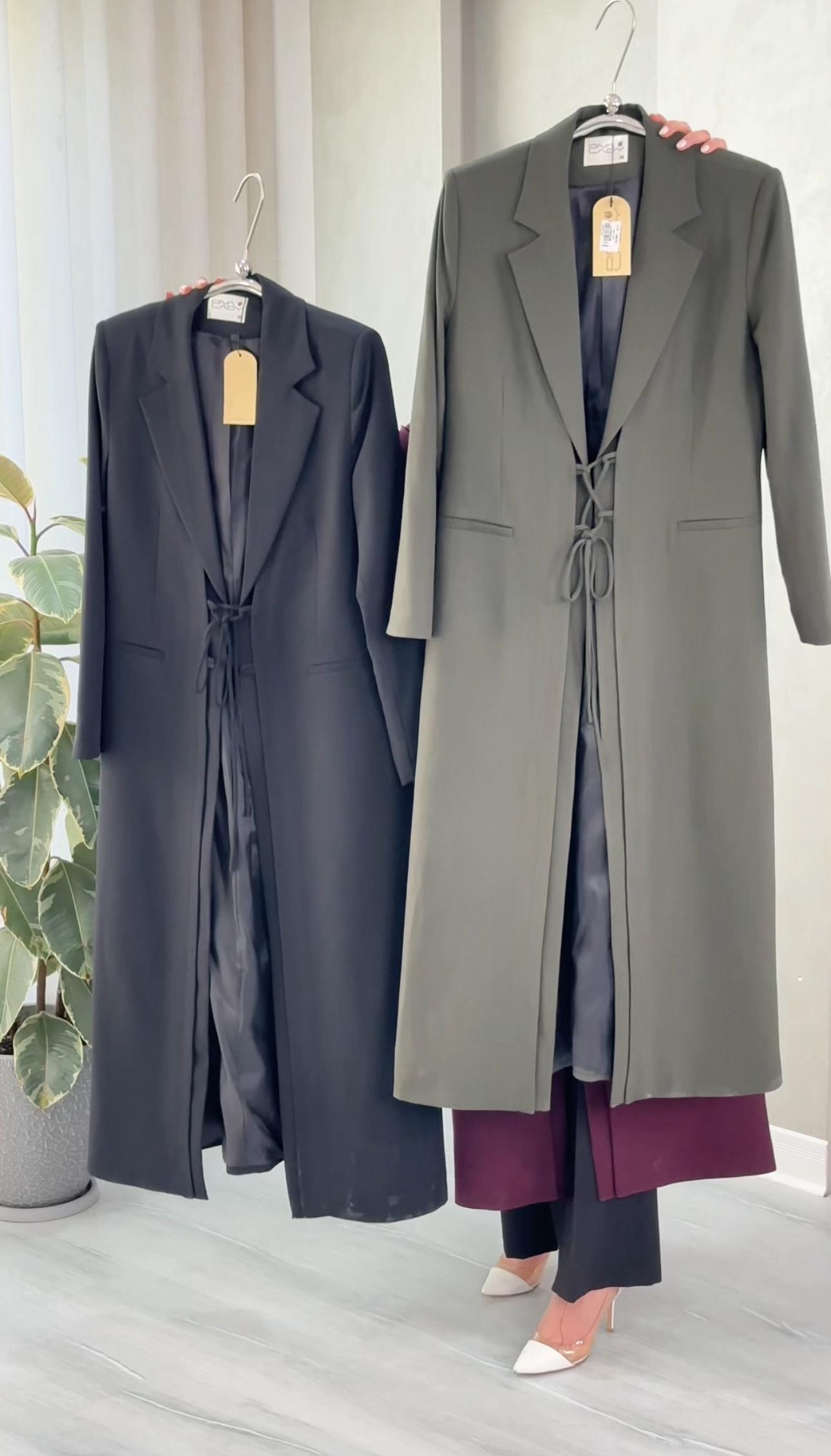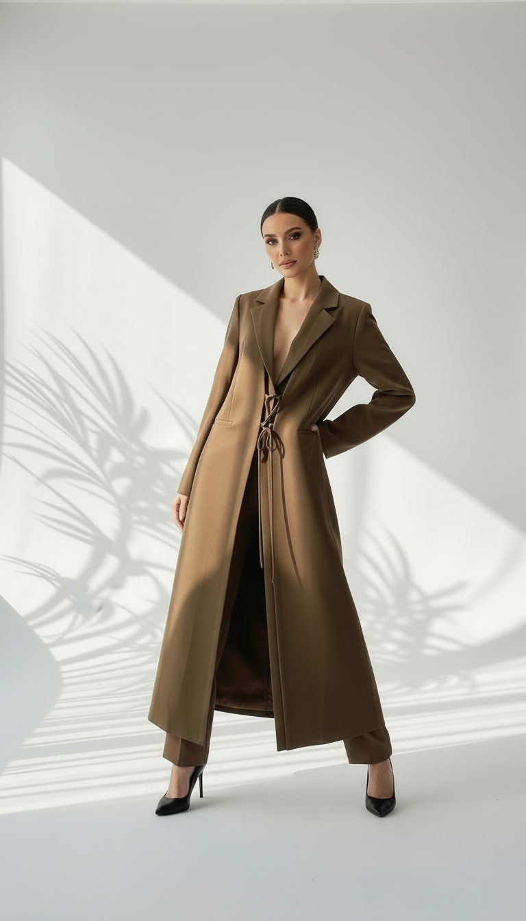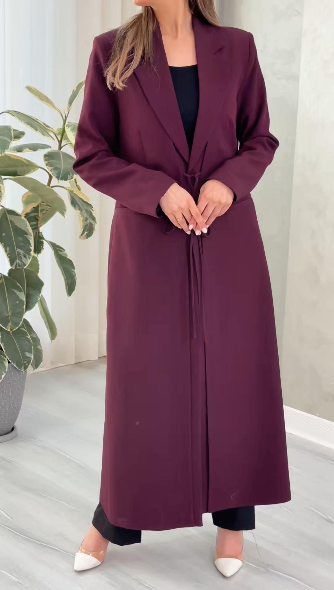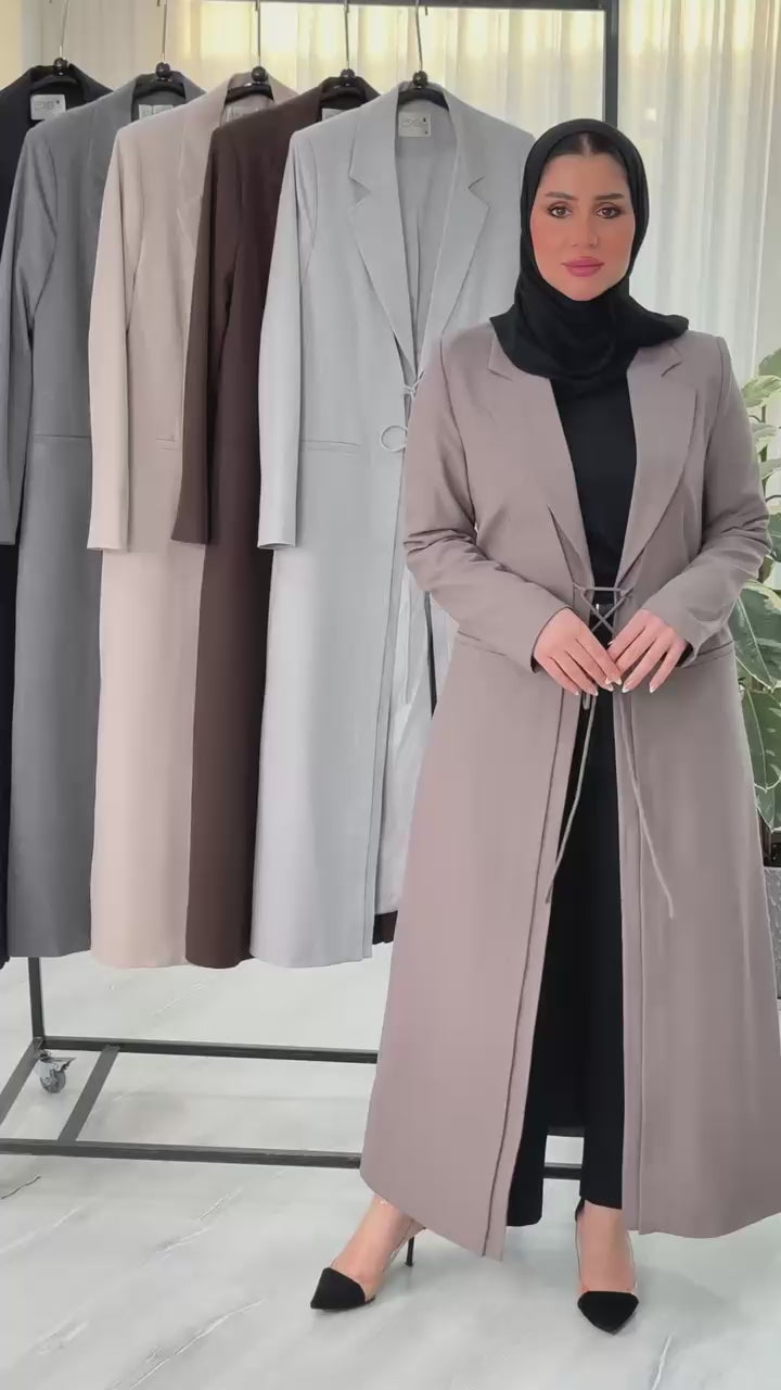التصميم هو معطف طويل وقصة محددة عند الصدر والخصر، ثم ينسدل ليصبح أوسع من الأسفل (A-Line)، مما يمنح مظهراً أنثوياً مميزاً. يتميز بياقة كلاسيكية واسعة وأزرار أمامية للإغلاق. الخامة مصنوعة من نسيج عالي الجودة وذو قوام متماسك، يضمن مظهراً احترافياً وثابتاً. القصةمصممة لتكون قطعة علوية (Layering piece) فاخرة، وتُعد إضافة ضرورية تعكس اختياراتك الراقية والفريدة، ومناسبة للارتداء كمعطف في المناسبات الرسمية.