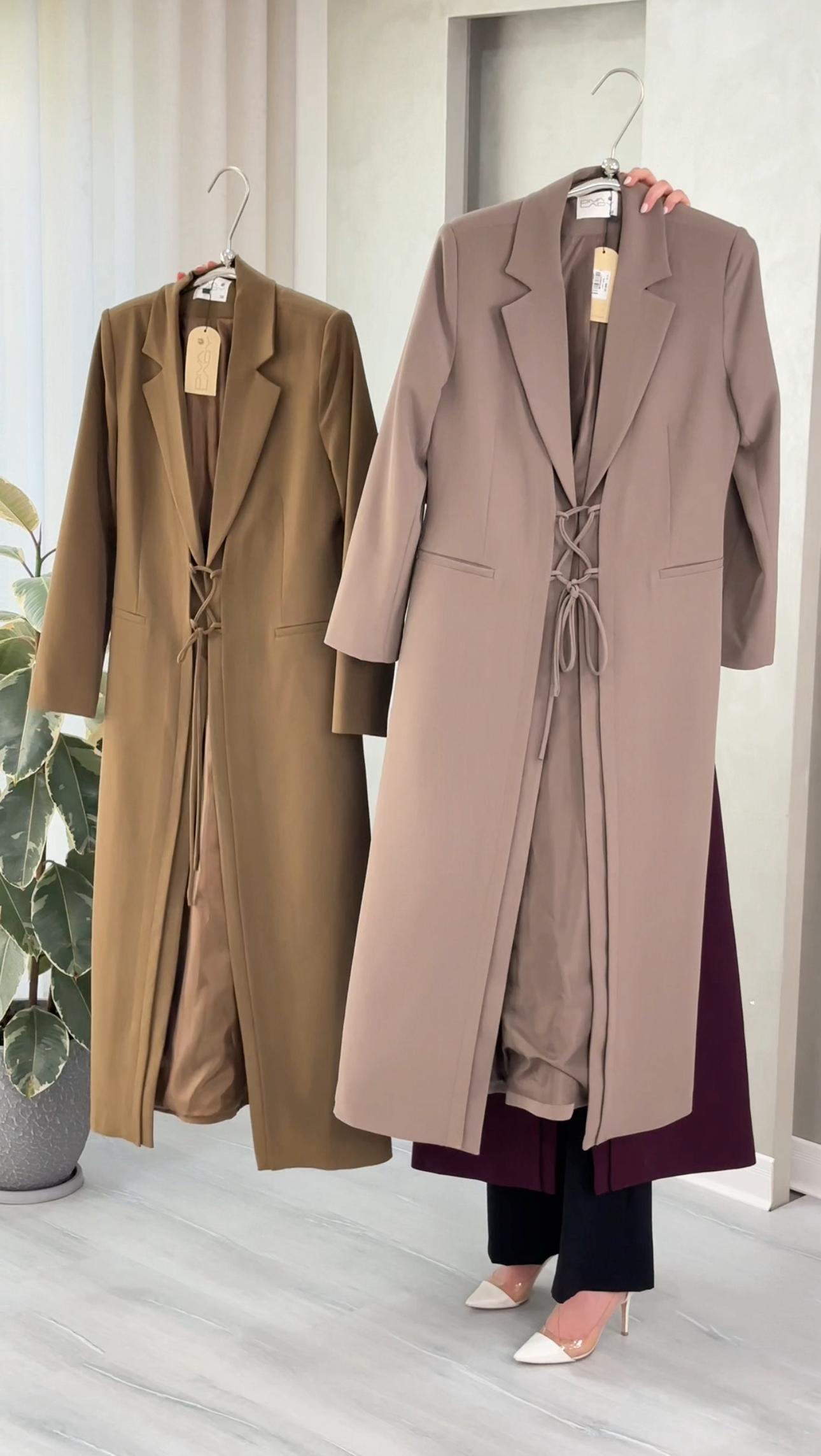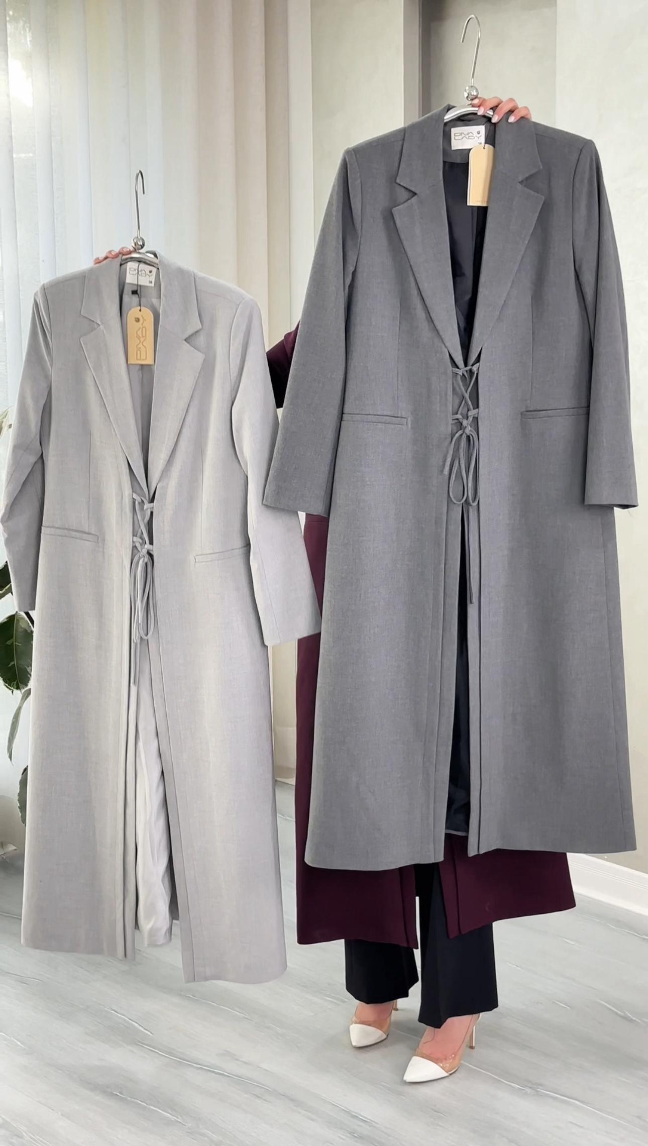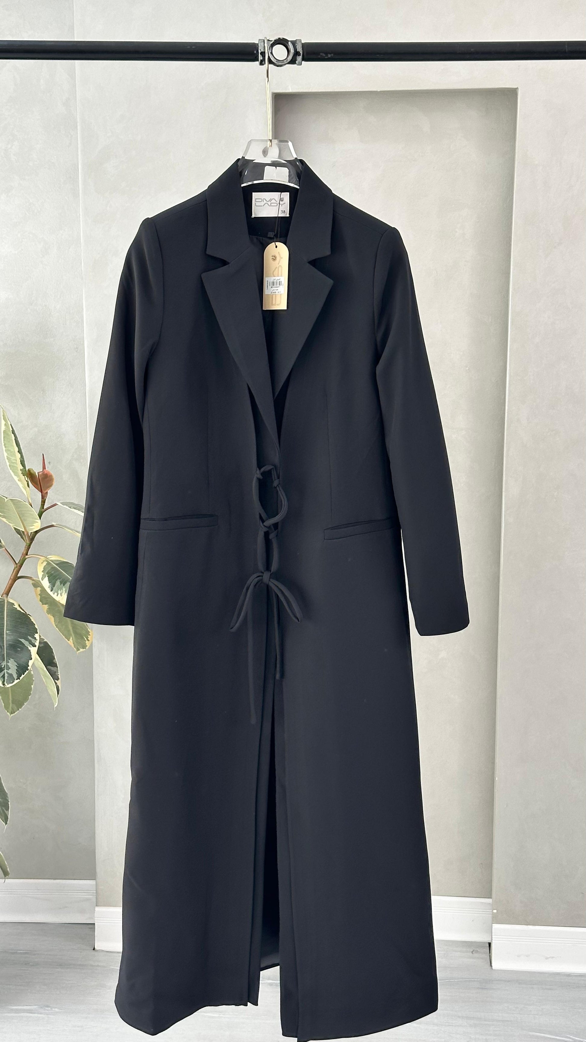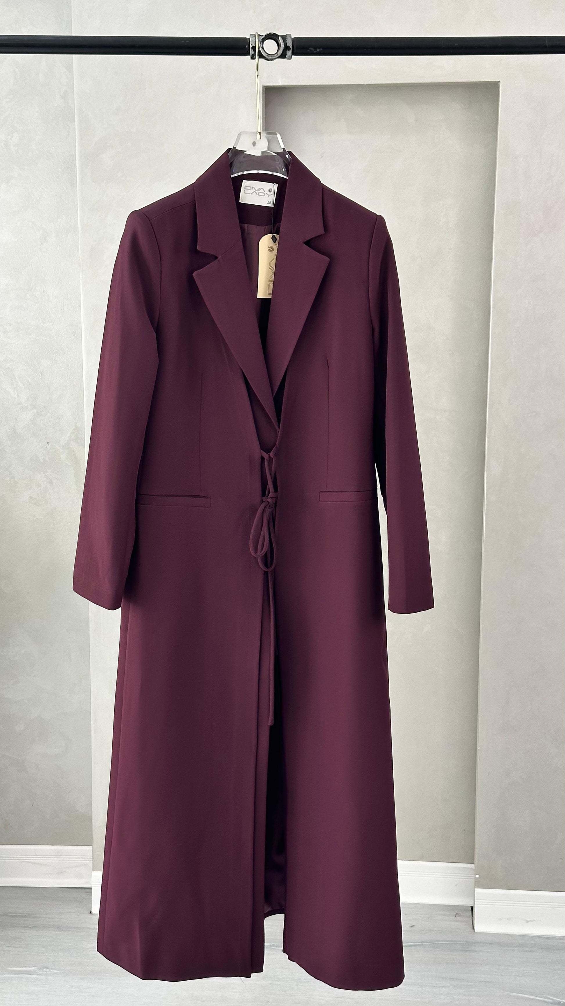 التصميم هو معطف طويل وقصة محددة عند الصدر والخصر، ثم ينسدل ليصبح أوسع من الأسفل (A-Line)، مما يمنح مظهراً أنثوياً مميزاً. يتميز بياقة كلاسيكية واسعة وأزرار أمامية للإغلاق. الخامة مصنوعة من نسيج عالي الجودة وذو قوام متماسك، يضمن مظهراً احترافياً وثابتاً. القصةمصممة لتكون قطعة علوية (Layering piece) فاخرة، وتُعد إضافة ضرورية تعكس اختياراتك الراقية والفريدة، ومناسبة للارتداء كمعطف في المناسبات الرسمية.