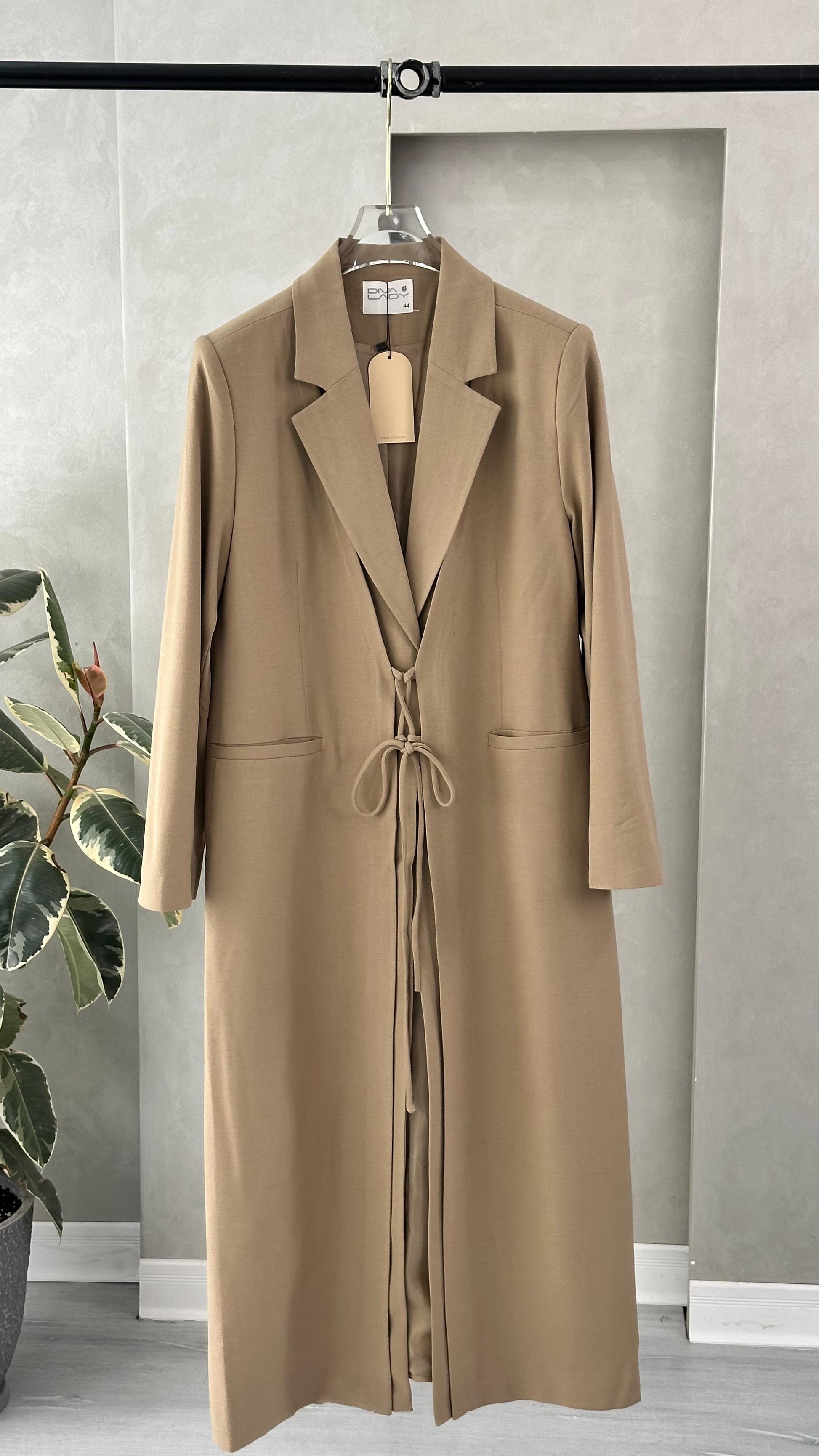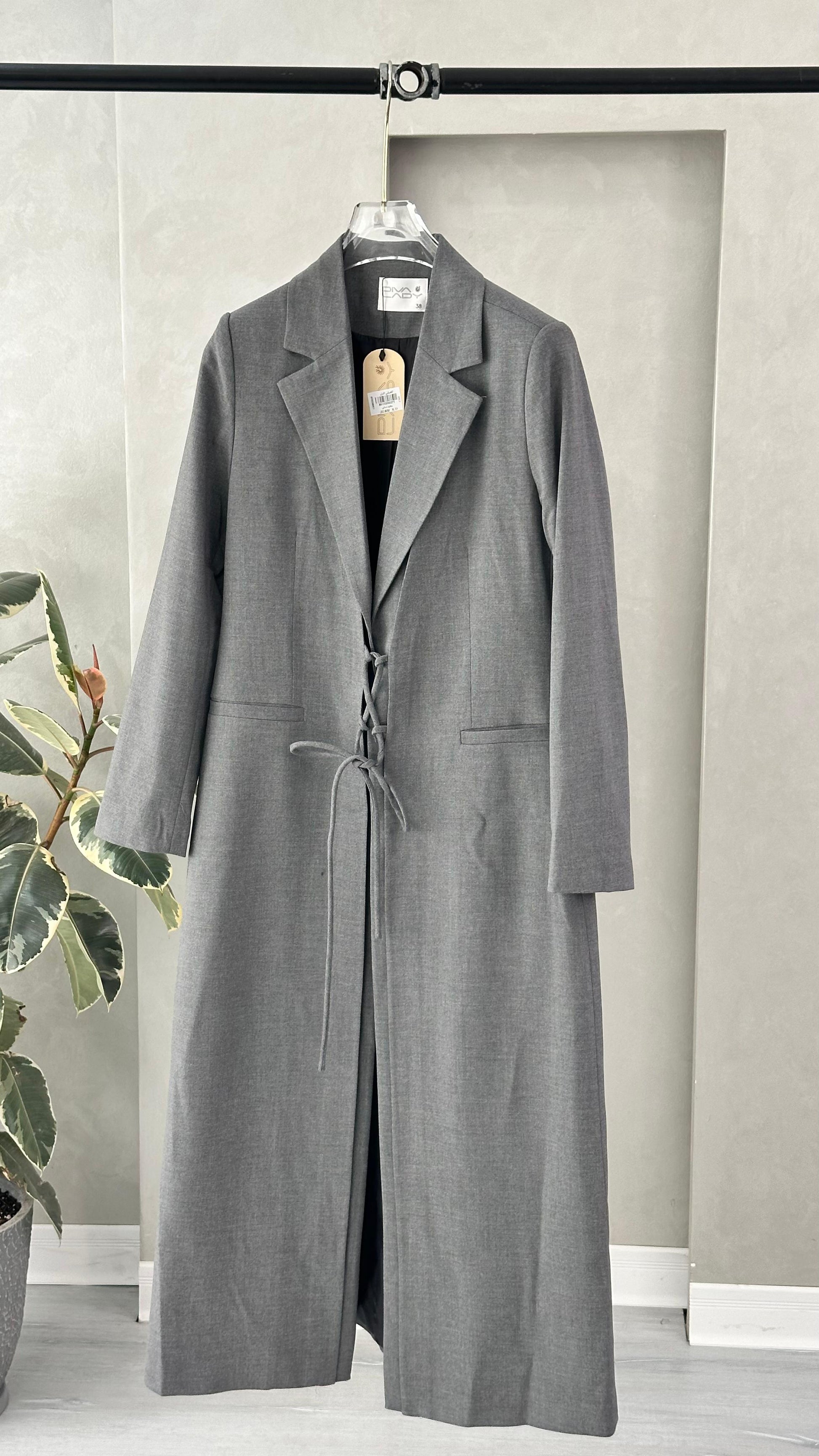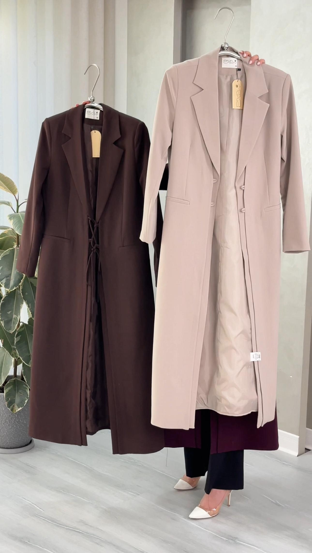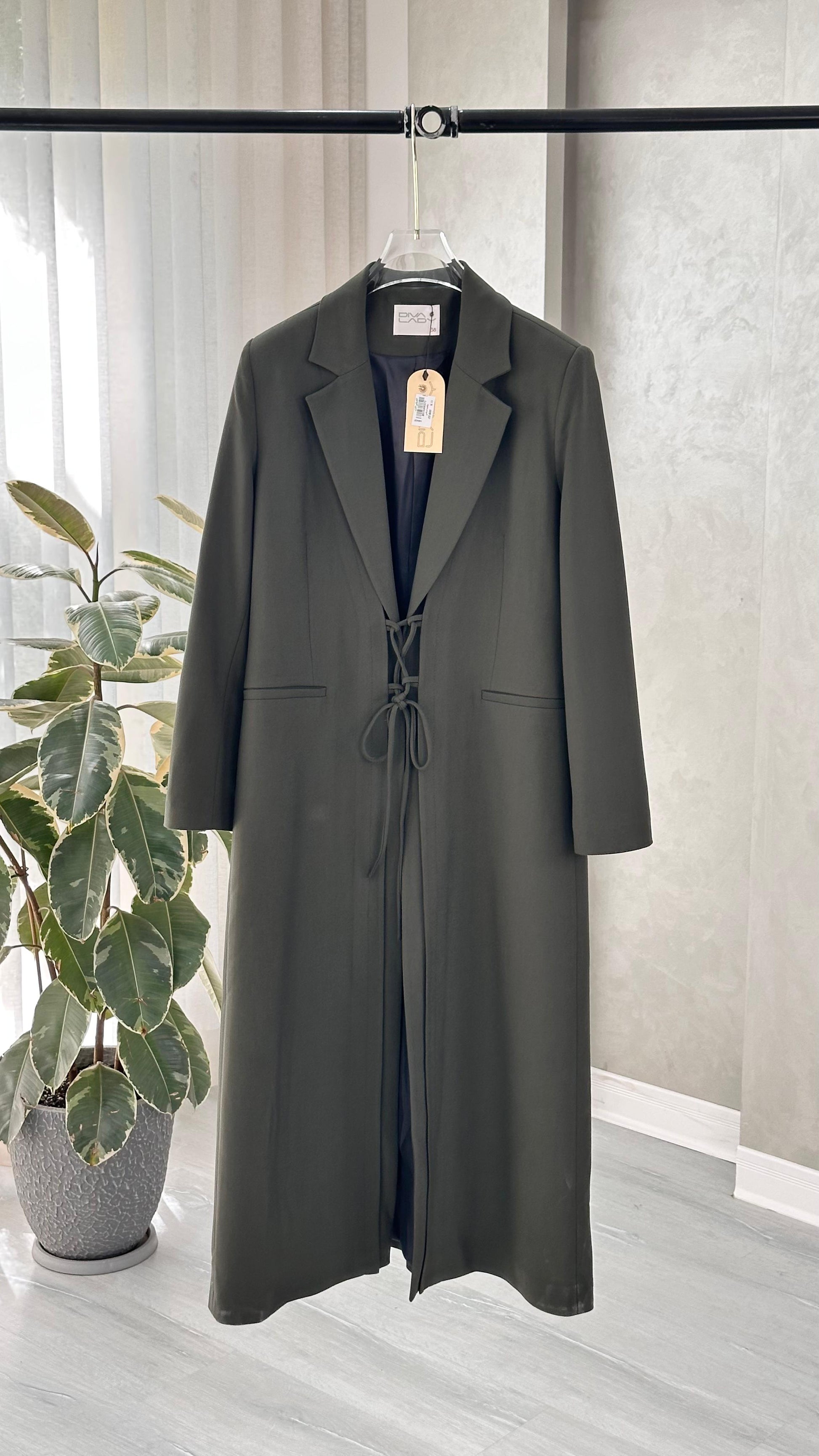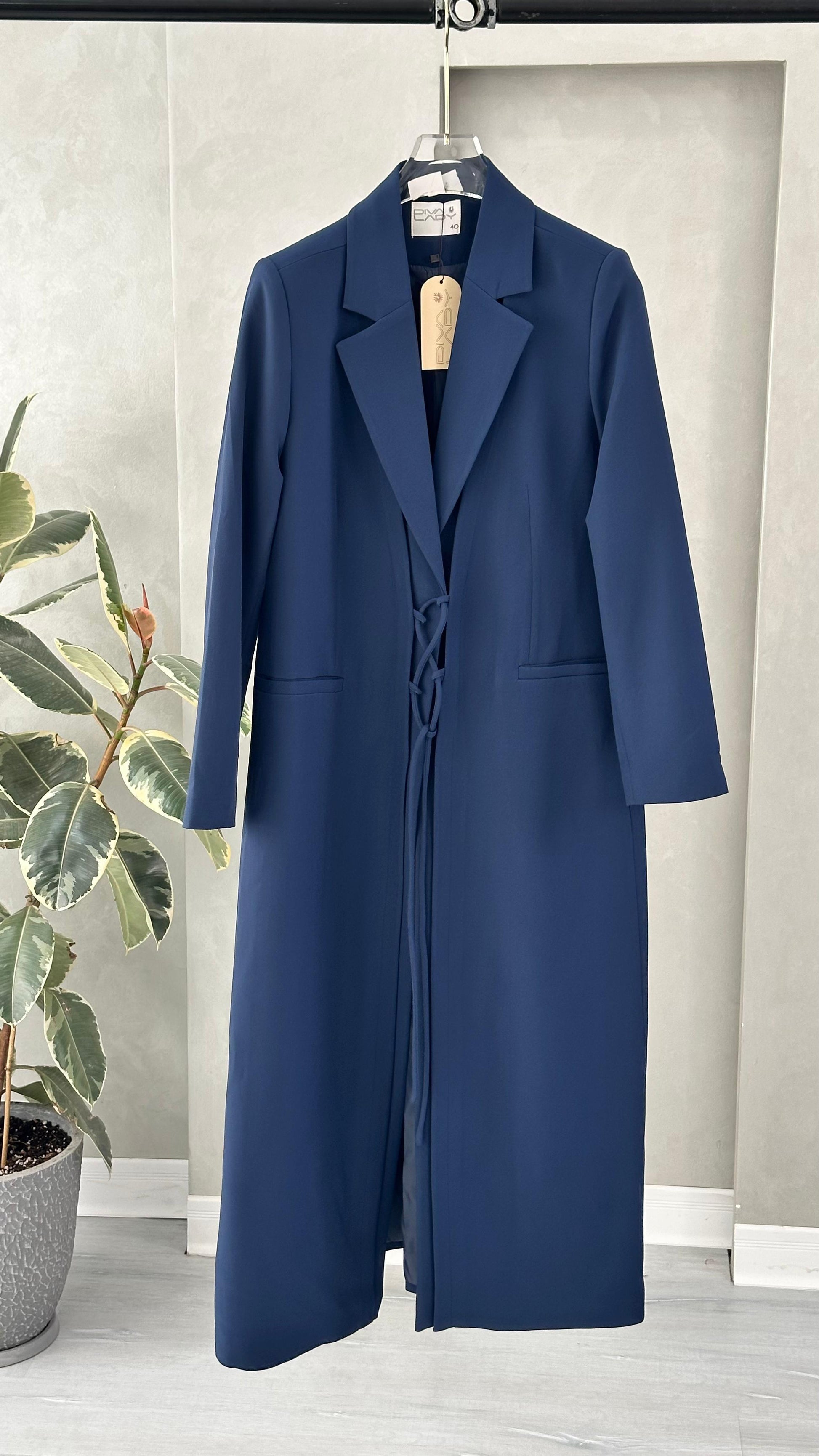 التصميم هو معطف طويل وقصة محددة عند الصدر والخصر، ثم ينسدل ليصبح أوسع من الأسفل (A-Line)، مما يمنح مظهراً أنثوياً مميزاً. يتميز بياقة كلاسيكية واسعة وأزرار أمامية للإغلاق. الخامة مصنوعة من نسيج عالي الجودة وذو قوام متماسك، يضمن مظهراً احترافياً وثابتاً. القصةمصممة لتكون قطعة علوية (Layering piece) فاخرة، وتُعد إضافة ضرورية تعكس اختياراتك الراقية والفريدة، ومناسبة للارتداء كمعطف في المناسبات الرسمية.