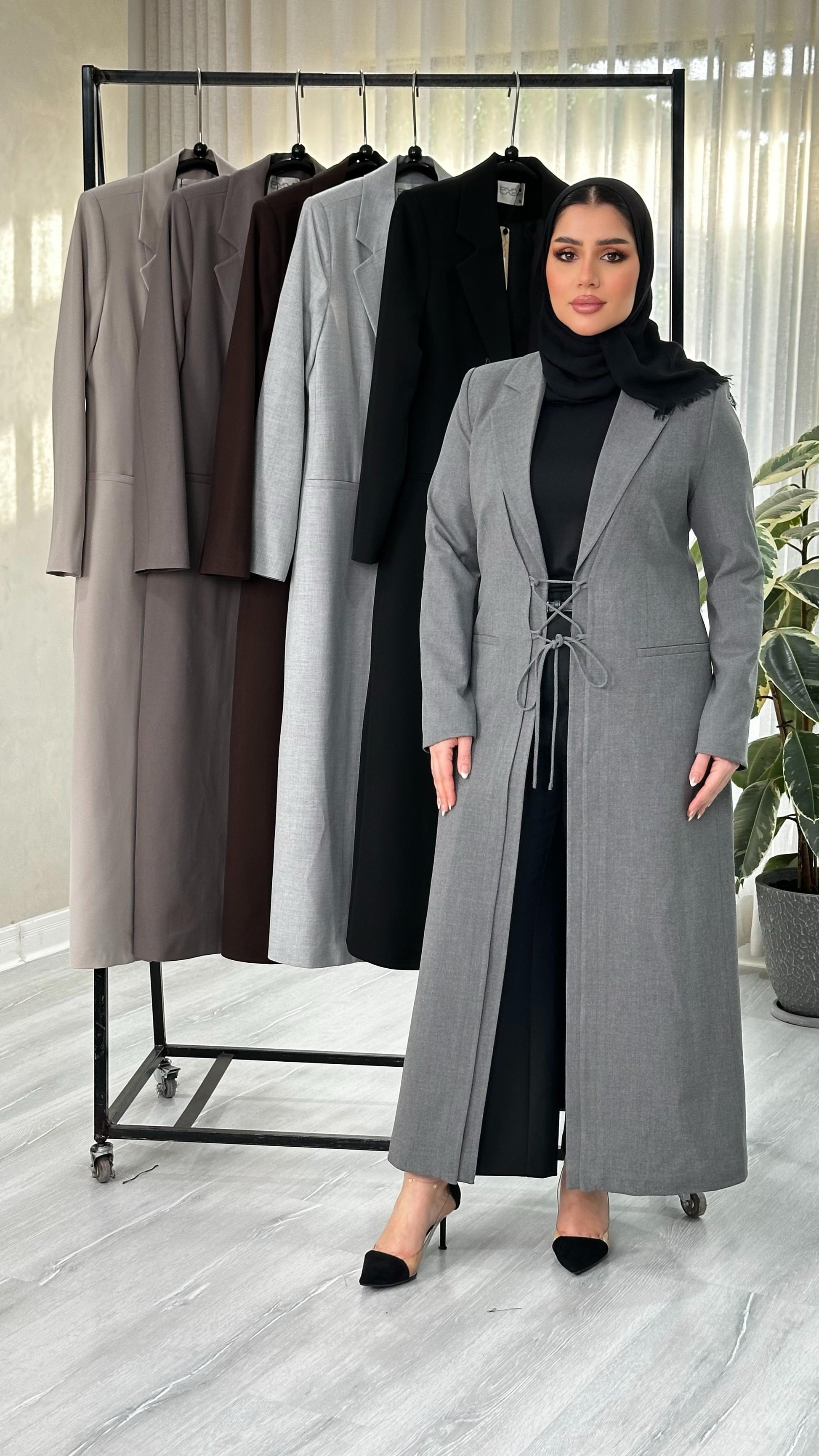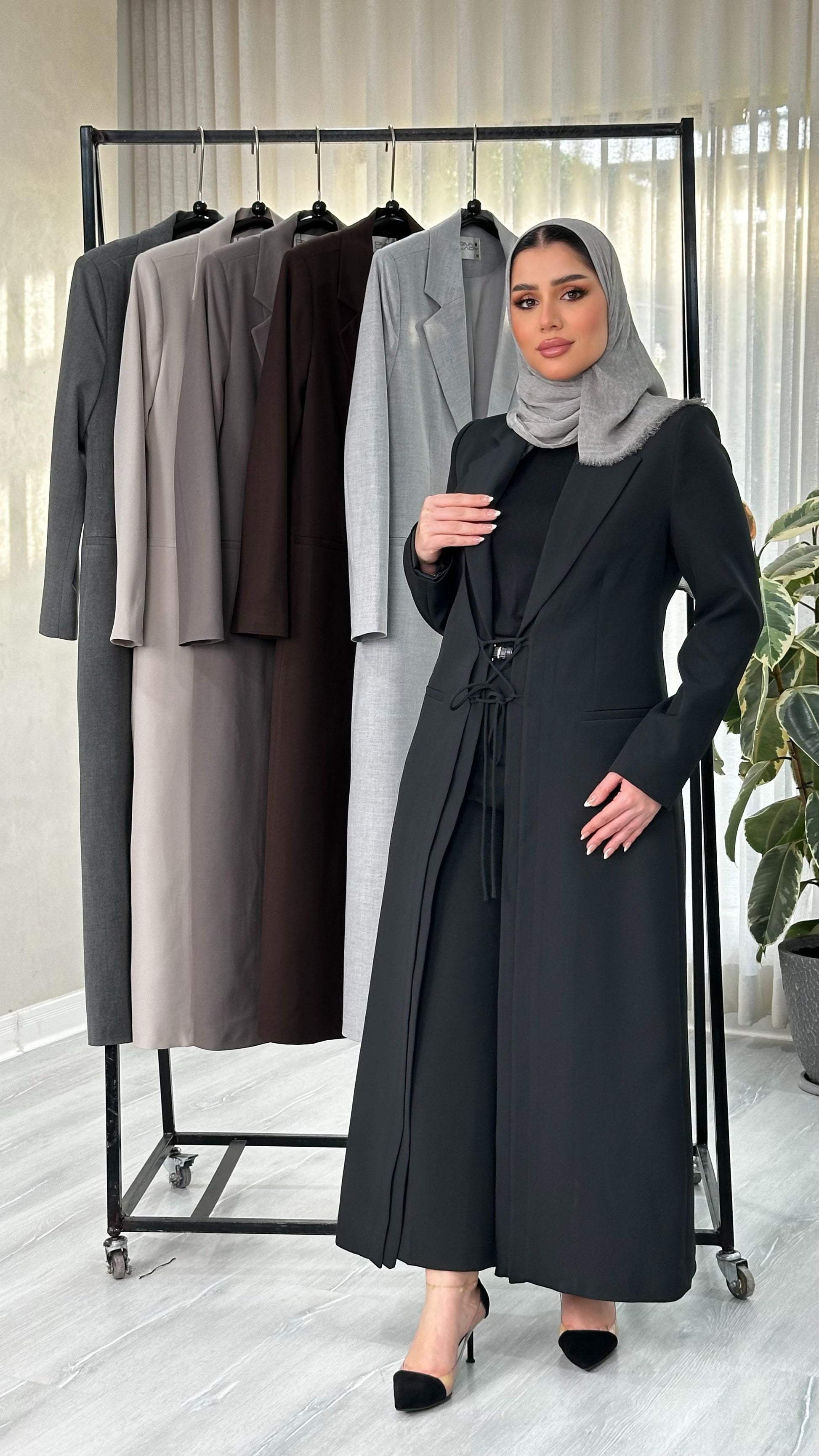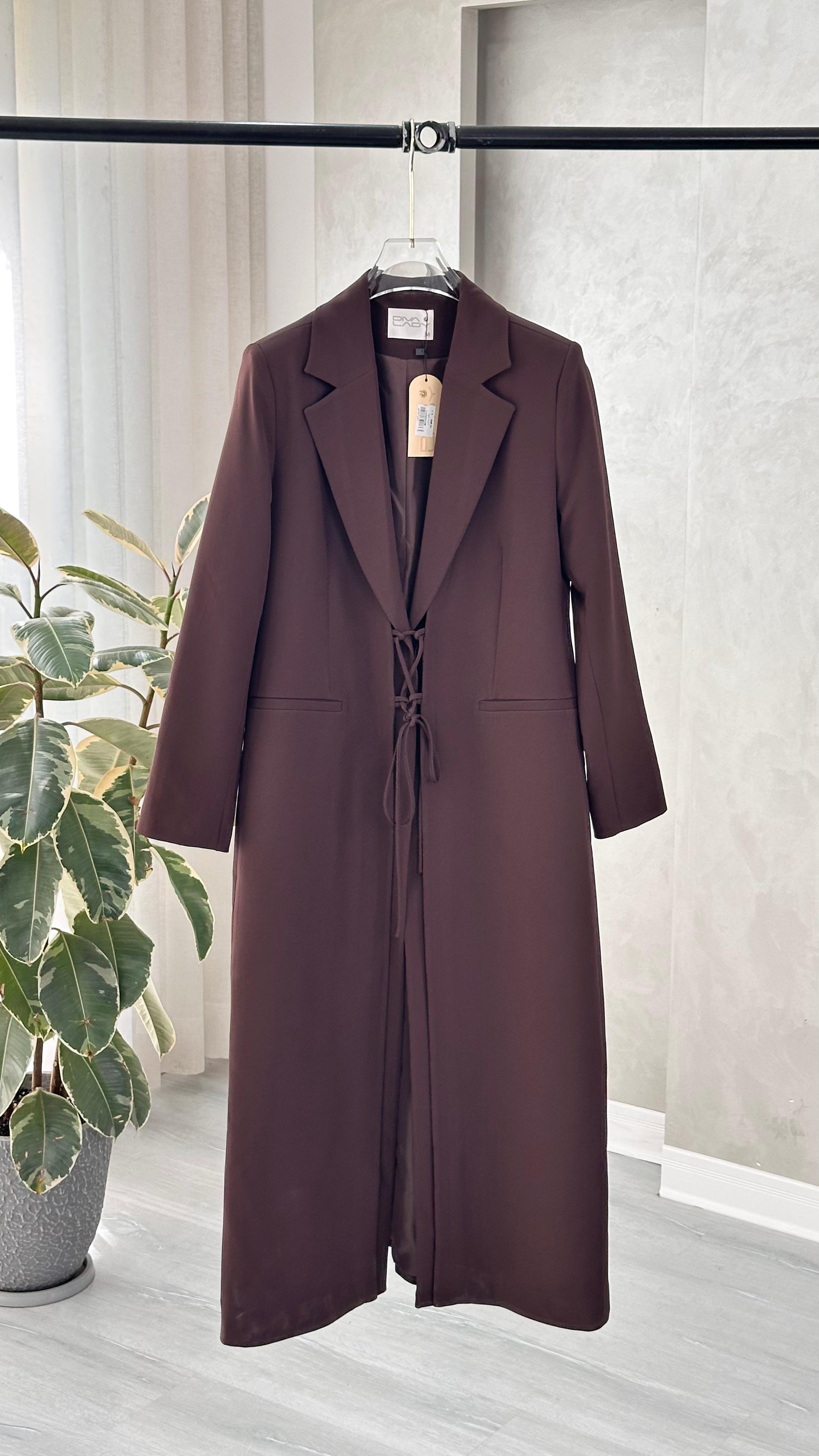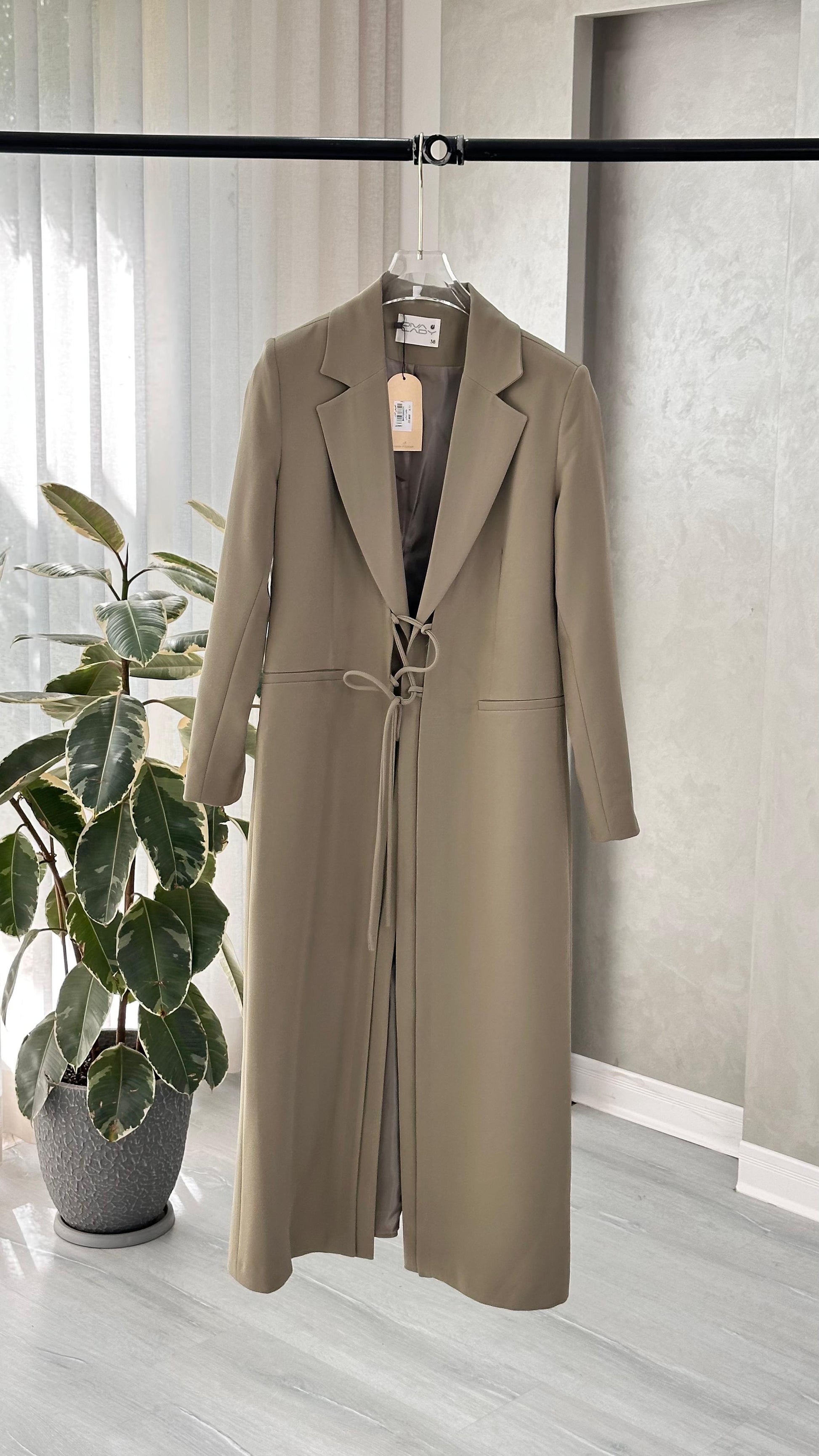 التصميم هو معطف طويل وقصة محددة عند الصدر والخصر، ثم ينسدل ليصبح أوسع من الأسفل (A-Line)، مما يمنح مظهراً أنثوياً مميزاً. يتميز بياقة كلاسيكية واسعة وأزرار أمامية للإغلاق. الخامة مصنوعة من نسيج عالي الجودة وذو قوام متماسك، يضمن مظهراً احترافياً وثابتاً. القصةمصممة لتكون قطعة علوية (Layering piece) فاخرة، وتُعد إضافة ضرورية تعكس اختياراتك الراقية والفريدة، ومناسبة للارتداء كمعطف في المناسبات الرسمية.