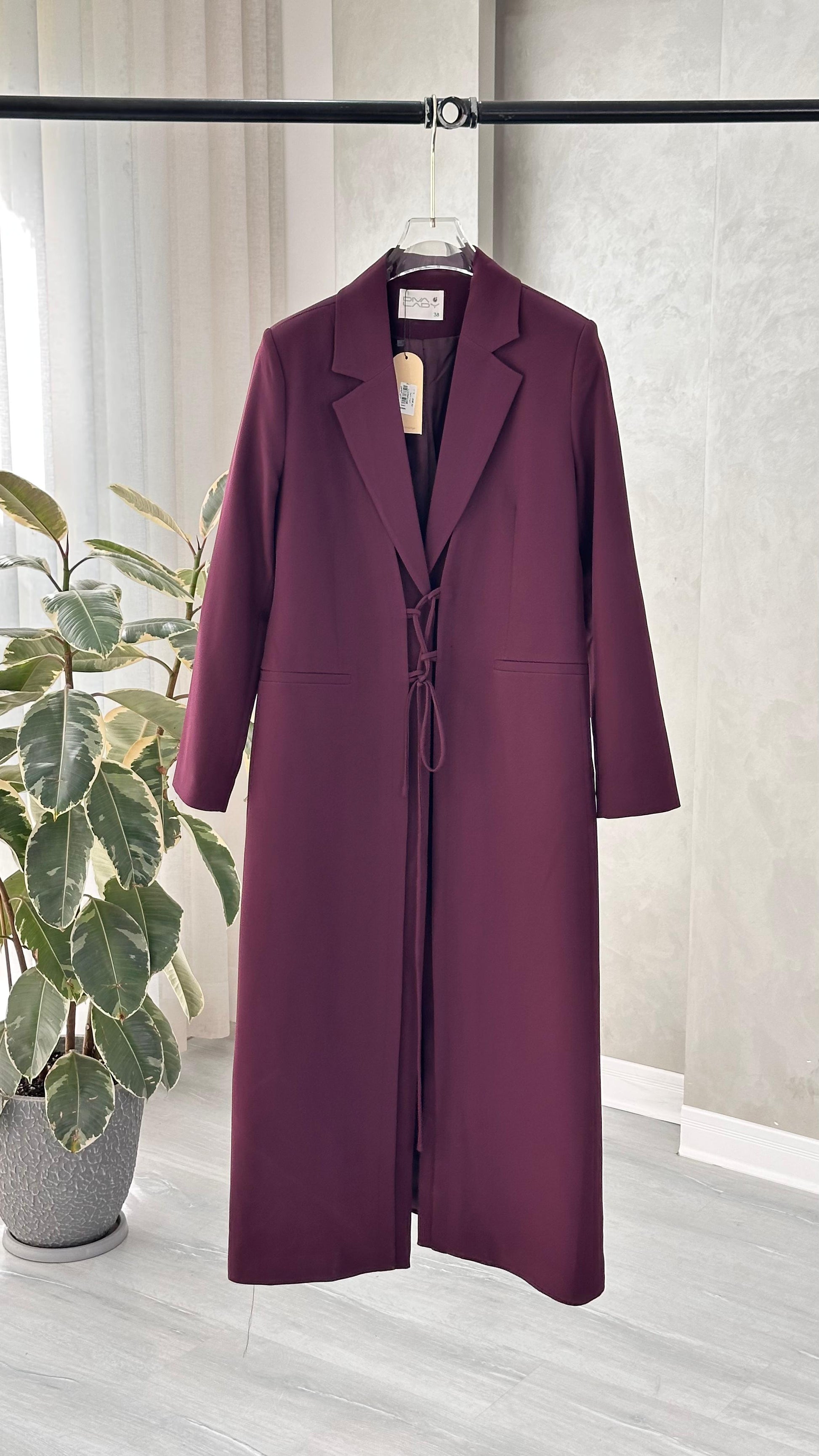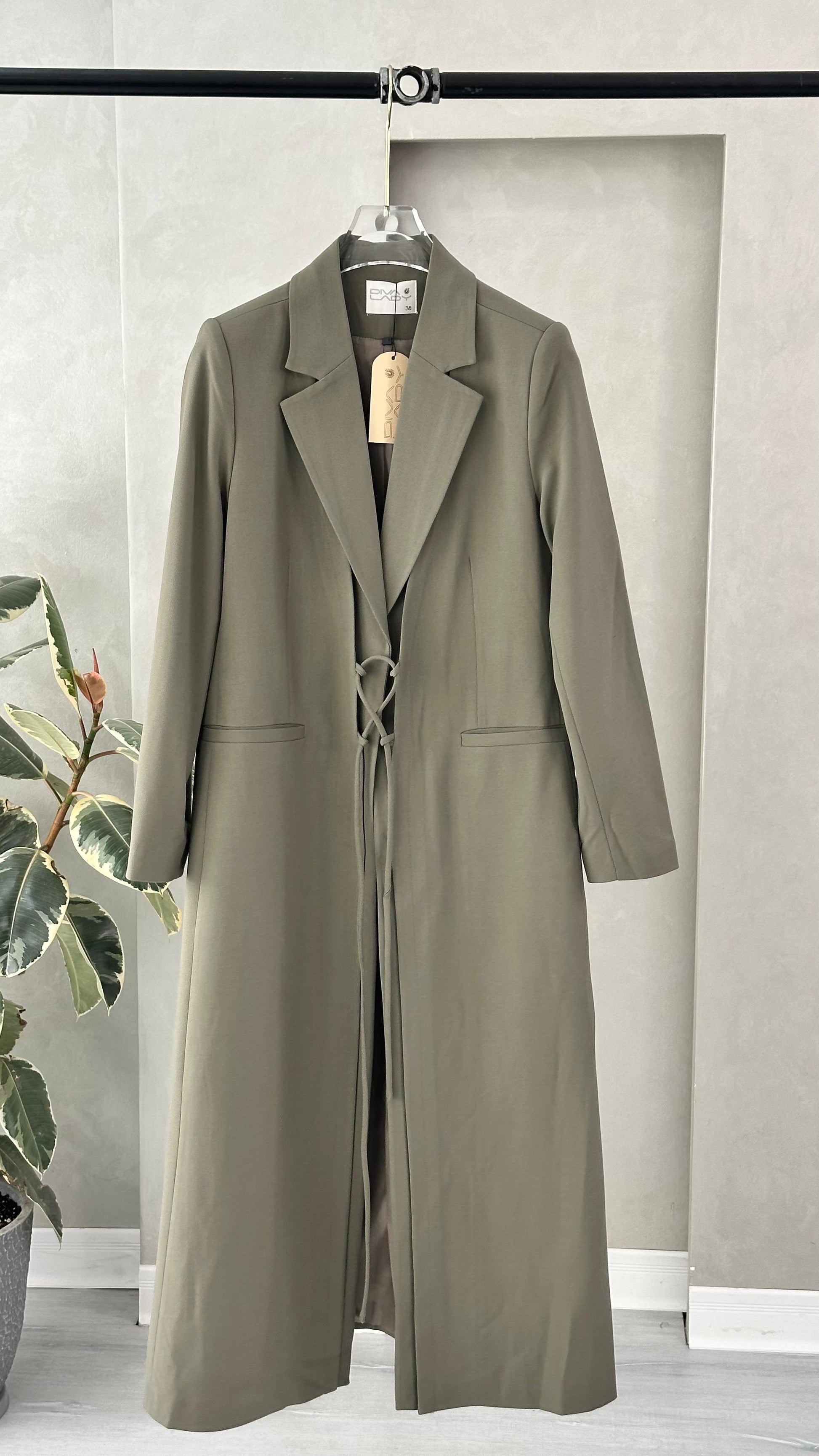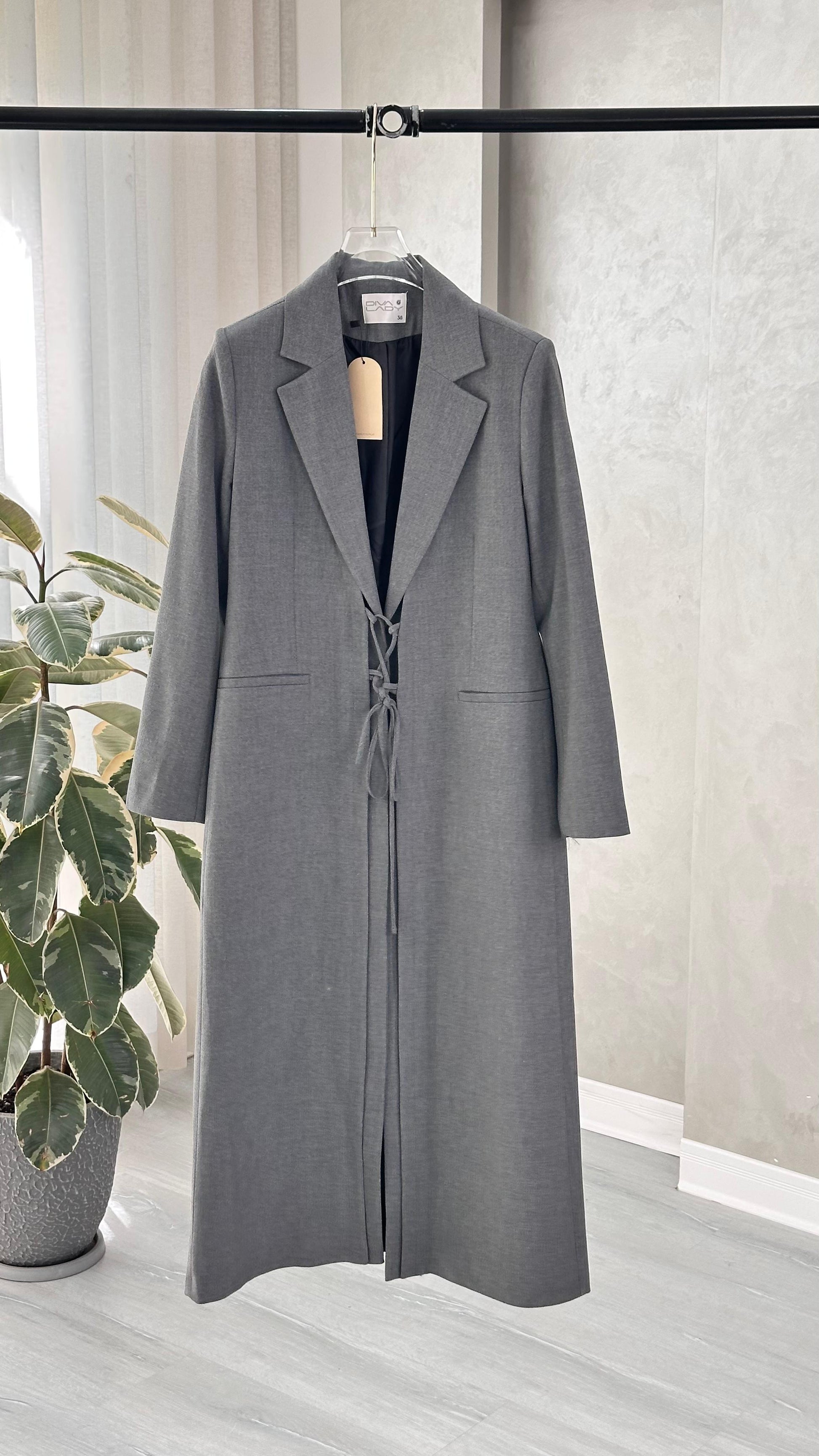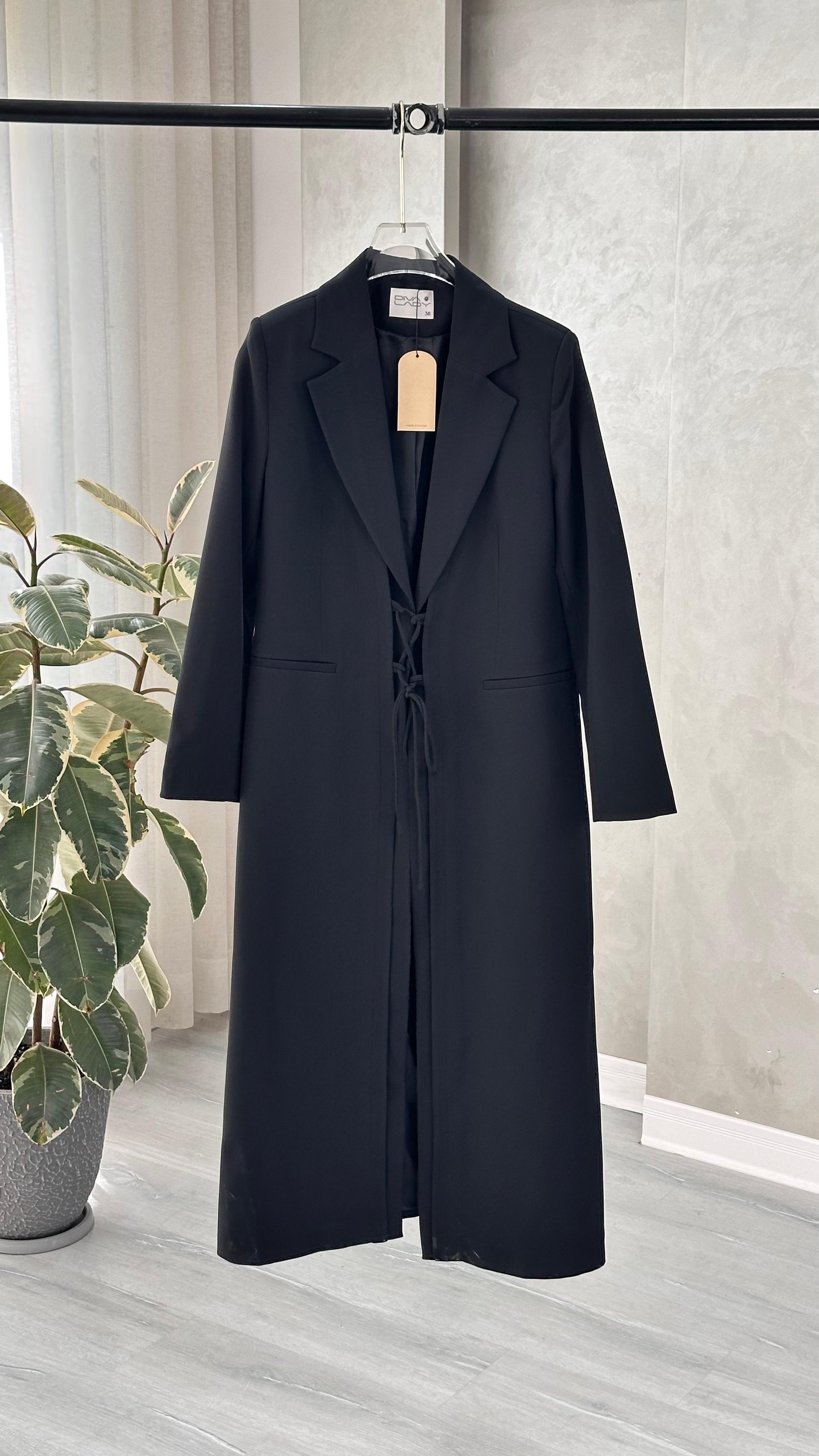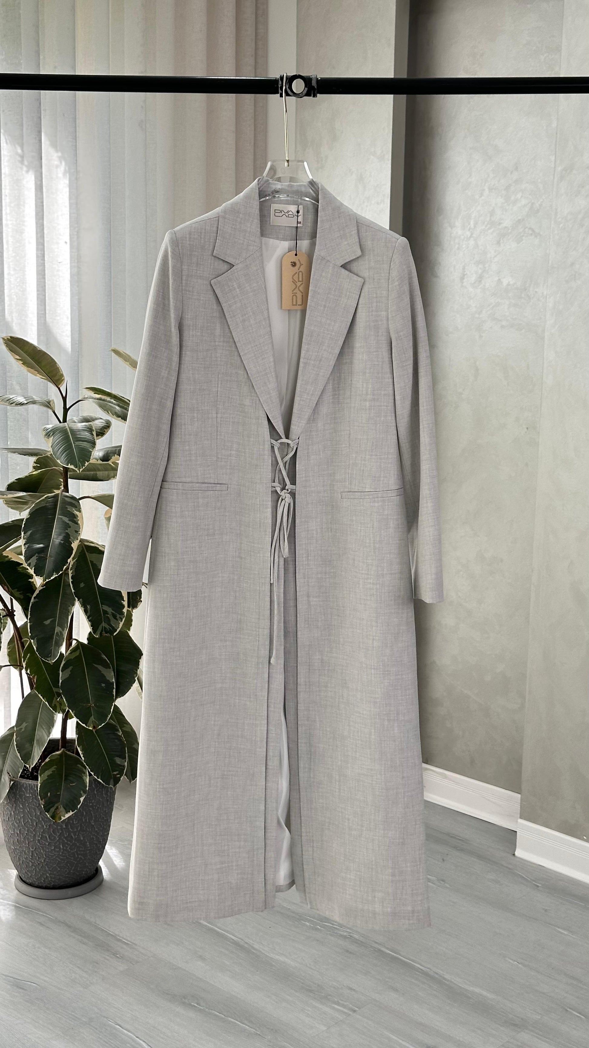التصميم هو معطف طويل وقصة محددة عند الصدر والخصر، ثم ينسدل ليصبح أوسع من الأسفل (A-Line)، مما يمنح مظهراً أنثوياً مميزاً. يتميز بياقة كلاسيكية واسعة وأزرار أمامية للإغلاق. الخامة مصنوعة من نسيج عالي الجودة وذو قوام متماسك، يضمن مظهراً احترافياً وثابتاً. القصةمصممة لتكون قطعة علوية (Layering piece) فاخرة، وتُعد إضافة ضرورية تعكس اختياراتك الراقية والفريدة، ومناسبة للارتداء كمعطف في المناسبات الرسمية.