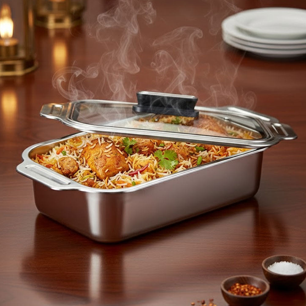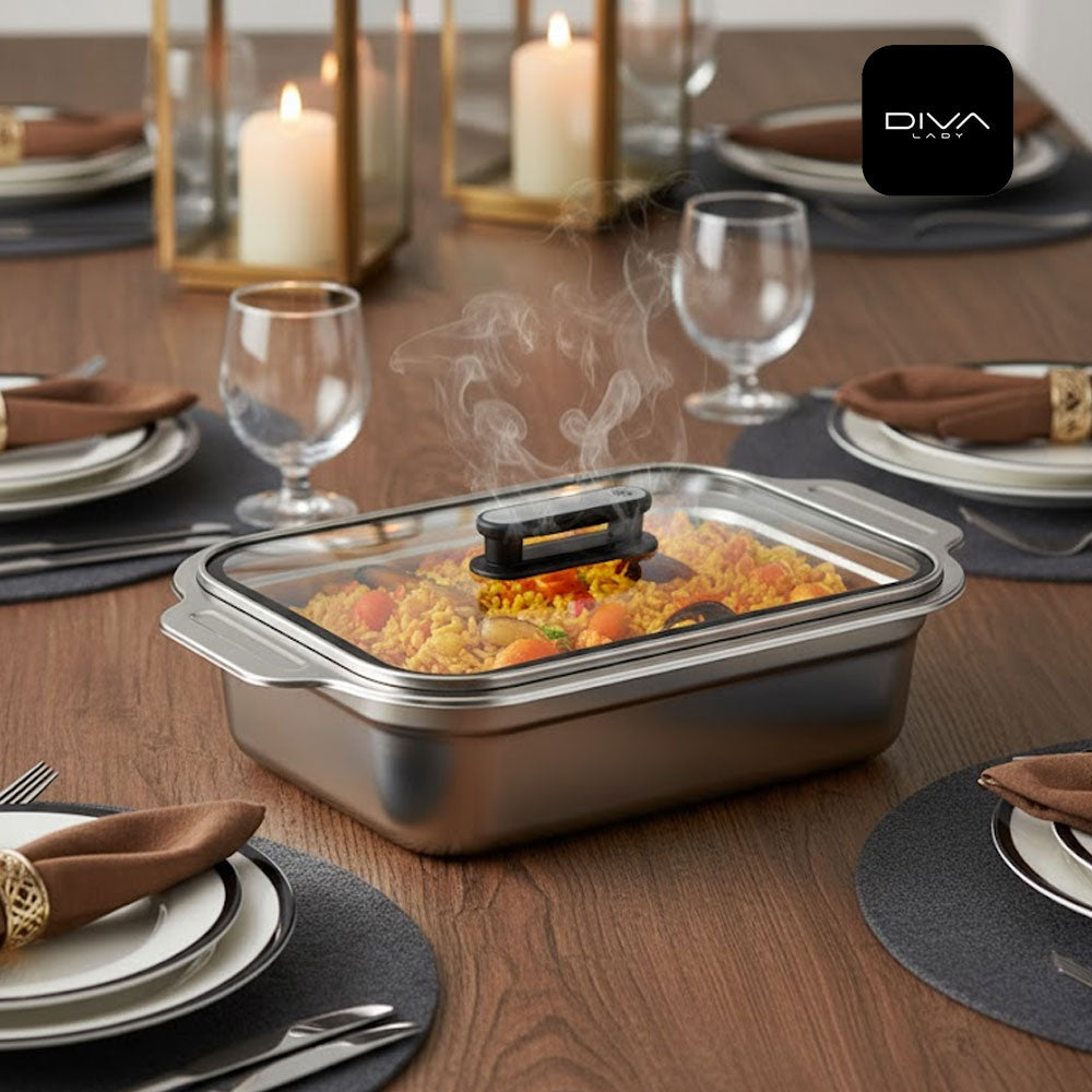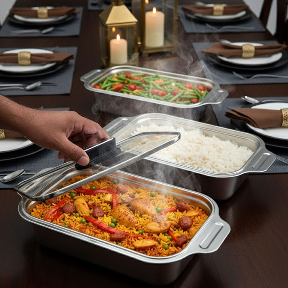 يتميز بغطاء محكم شفاف يسمح برؤية الطعام دون الحاجة إلى رفعه، مما يجعل التجربة أكثر راحة وأناقة على مائدة الطعام أو في المناسبات العائلية.