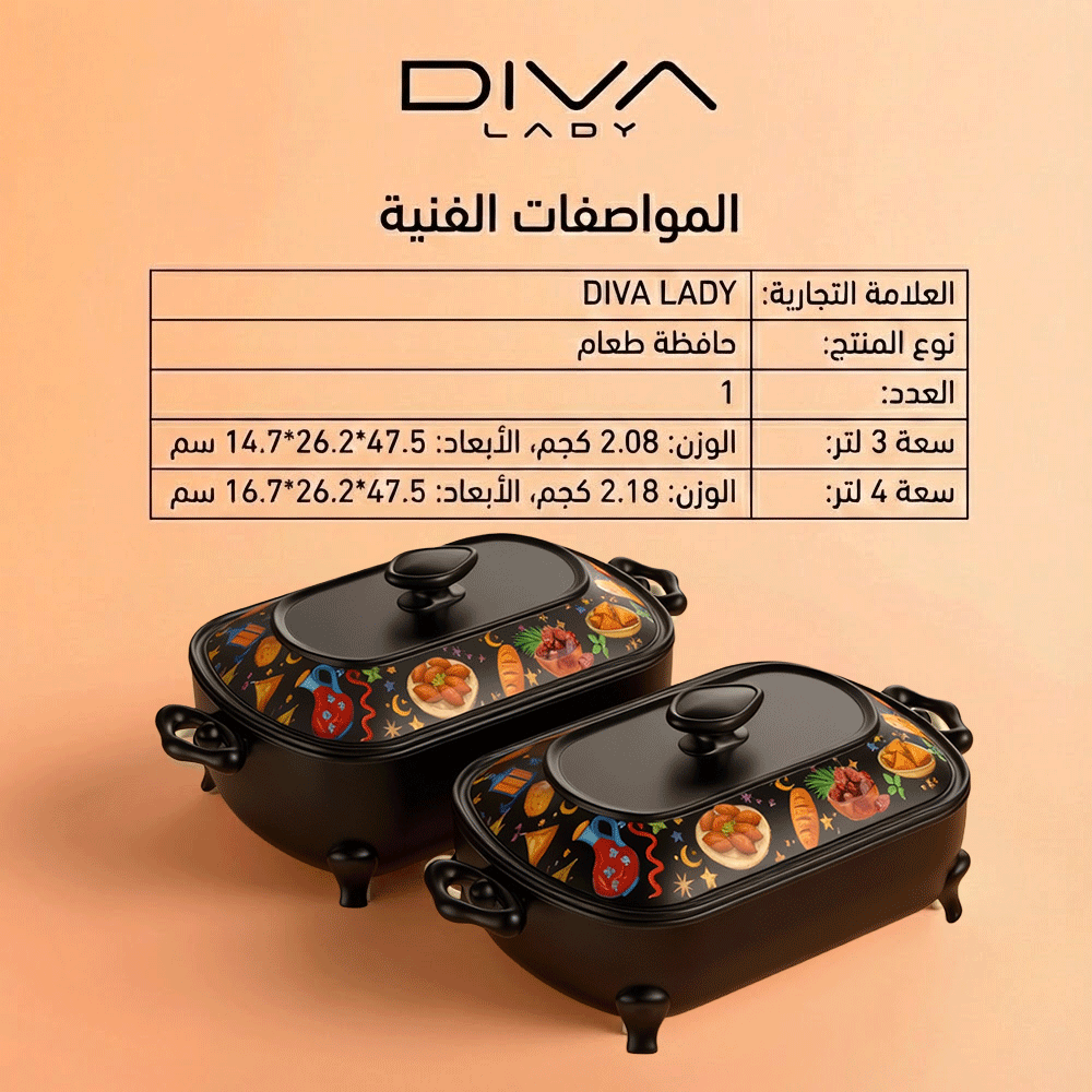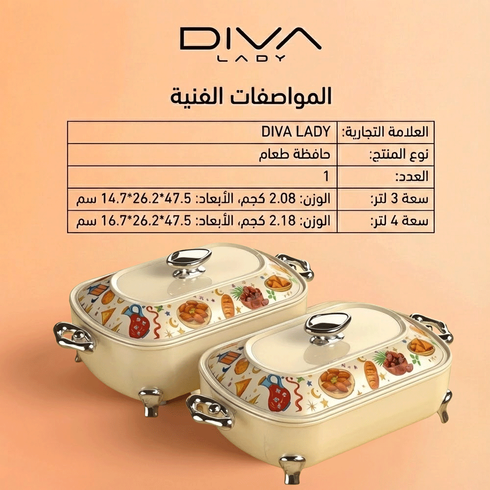 أضيفي لمائدتك لمسة من الأناقة والتميّز مع حافظة الطعام الراقية من ديفا ليدي (DIVA LADY)، المصممة بعناية لتجمع بين الجمال العملي والفخامة العصرية. تصميمها الفريد يجعلها قطعة مثالية للتقديم في المناسبات العائلية والعزائم، بالإضافة إلى الاستخدام اليومي.