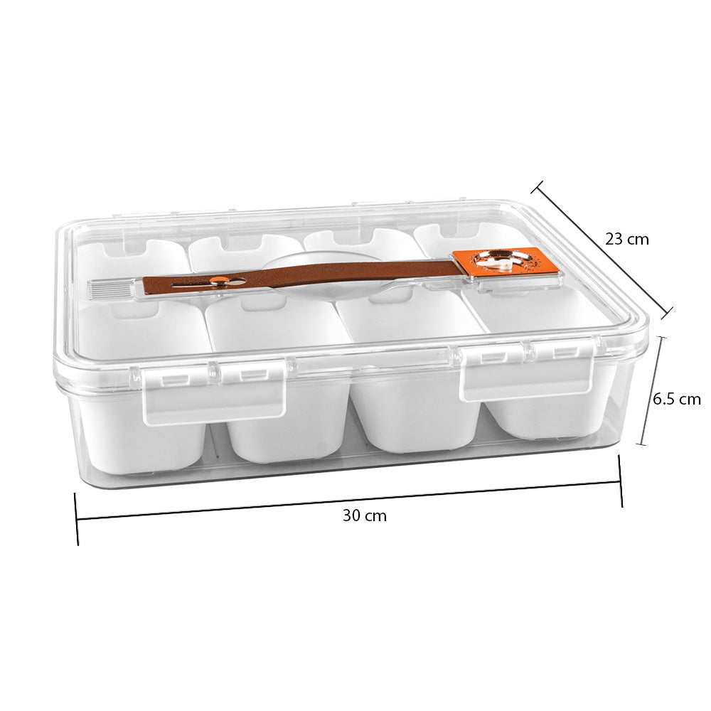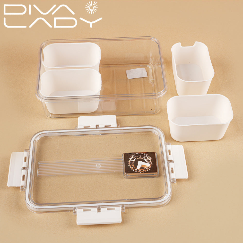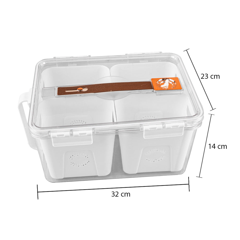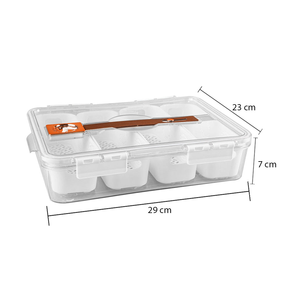 حافظه طعام مع غطاء شفاف ومقسمة إلى عدة أجزاء مما يجعلها مناسبة لتقديم مجموعة متنوعة . من الاطعمة بشكل منظم ومحكمة الغلق