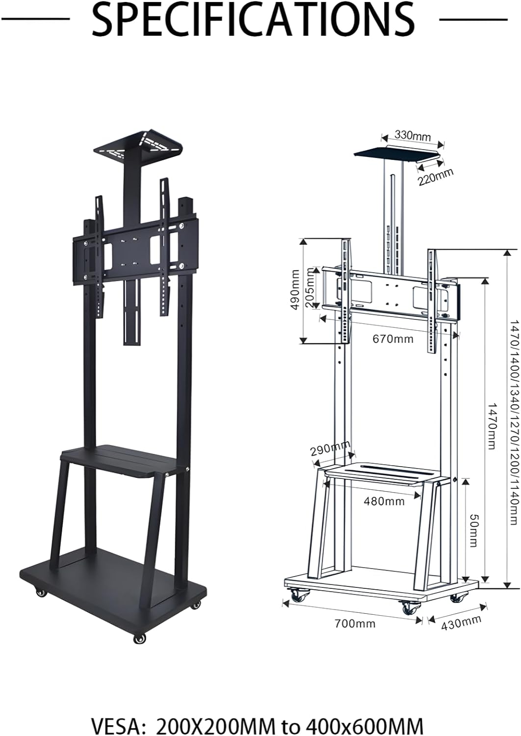 عربة تلفزيون بحامل أرضي دوار كامل الحركة عالي التحمل 24x7 eMall مع أقواس لتلفزيون LED وLCD وبلازما مقاس 32 بوصة إلى 65 بوصة لأحجام VESA 100 × 100 حتى 600 × 400 مم (عربة تلفزيون 3 أرفف)