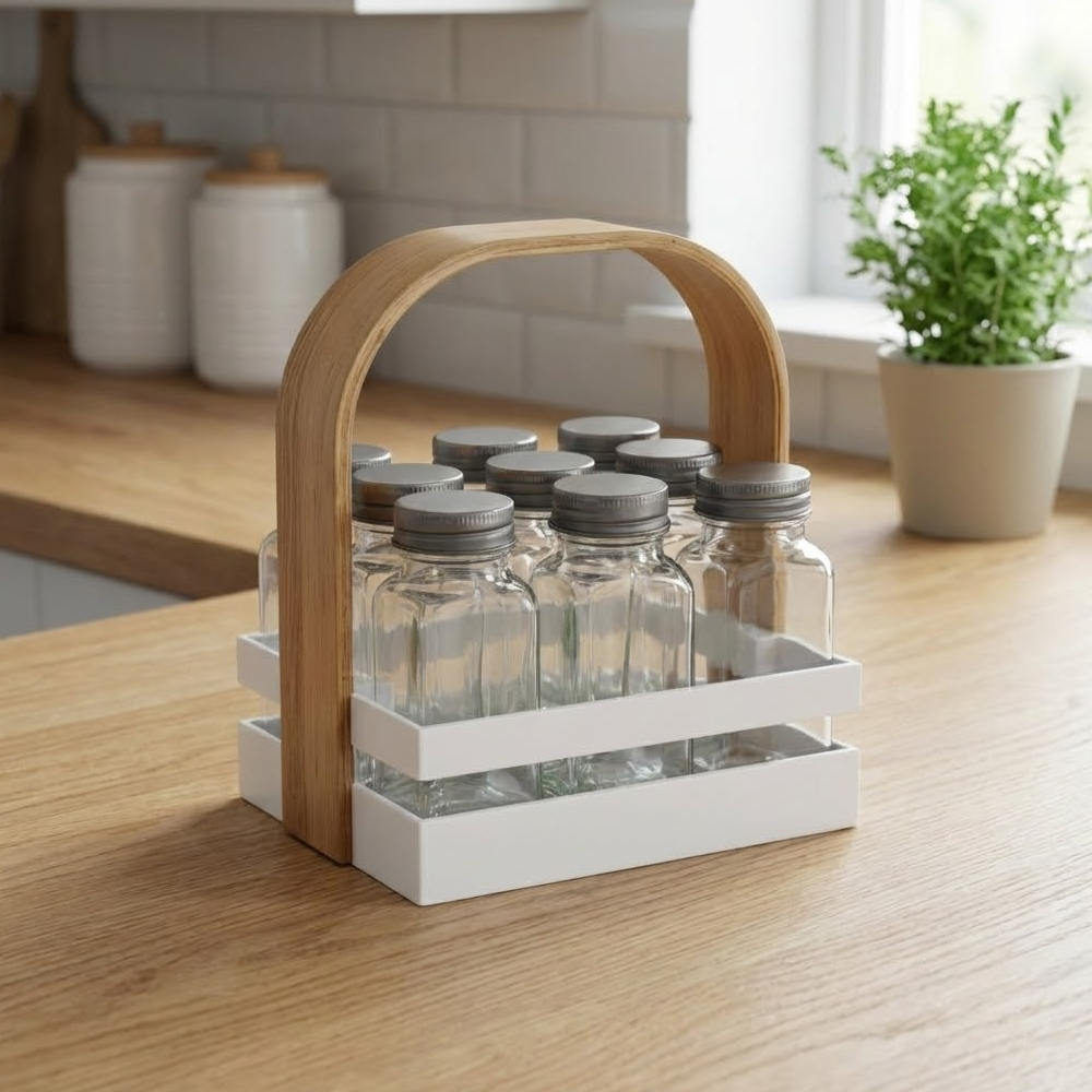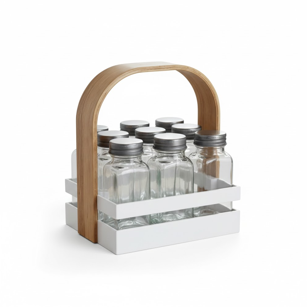 أضف لمسة من الأناقة والتنظيم إلى مطبخك مع حامل التوابل العصري المصمم بعناية ليجمع بين الجمال والعملية. يتميز الحامل بتصميم أنيق مع مقبض خشبي مريح يسهل الحمل والنقل، بالإضافة إلى عبوات زجاجية شفافة تتيح رؤية المحتوى بسهولة.