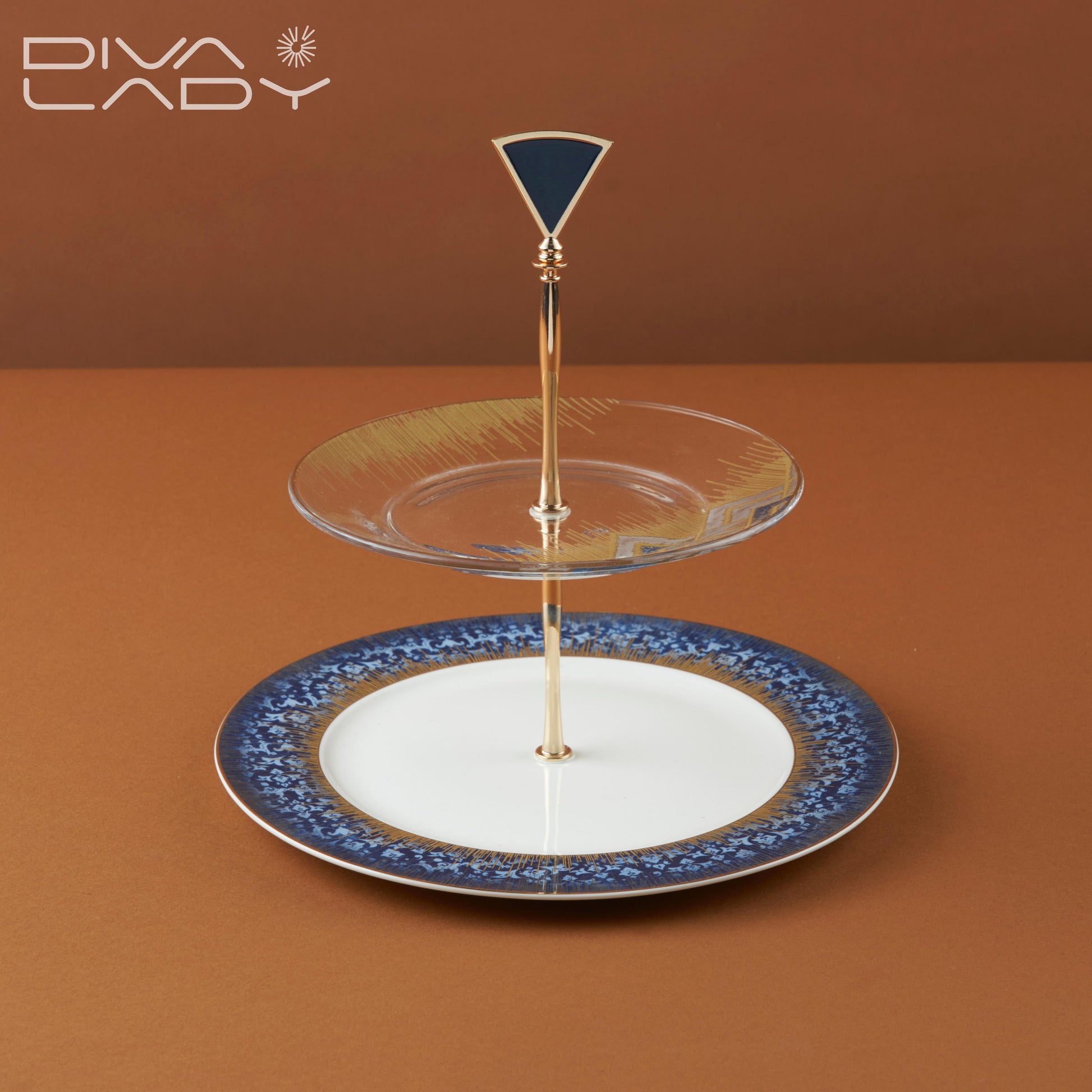 قطعة أنيقة وعملية مصممة لعرض الحلويات والوجبات الخفيفة بطريقة جذابة يتكون من طبقتين دائريتين مثبتتين على عمود معدني ذهبي تتميز الطبق العلوي بتصميم بسيط وأنيق مصنوع من الزجاج العالى الجودة بينما تتميز الطبق السفلية بنقشة أنيقة
